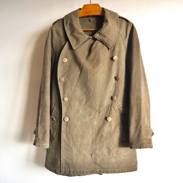 1938年からフランス軍バイク部隊に支給されていた「M-38 Motor Cycle Coat」のご紹介です。 2ndモデルの個体にはウッドボタンや樹脂製ボタンが付属するのに対し、こちらはバンブーボタンが付属する1stモデル。 生産期間の短さ、モノとしてのクオリティの高さから市場でもダントツに希少価値の高まっているモデルではございますがサイズ、コンディションの良い1stモデルともなるともう滅多に出てこないであろうアーカイブ級のスペシャルピースです。 矢張りその人気に見合うだけのハイコスト、ハイクオリティな作り。着用時のシルエットも抜群に格好良い。 風の侵入を防ぐための美しい弧を描くダブルブレスト仕様の前合わせ。首元を覆うように立ちがる極太のチンストラップ。目の詰まった、タフでがっしりとしたコットンキャンバス生地。 内部に籠った熱や蒸気を放出するための背面の切り返しに1stモデルに特有の手縫いのベンチレーション。 バイク部隊のハードかつアクティブな任務に従事する者のために考えに考え尽くされたディティールの数々。結果的、必然的に表出する機能美。 いやはや、天晴れです。 サイズ表記は“2” 1〜3まであるサイズの中では丁度中間に当たるサイズ感です。 元々オーバーコートとして設計されたため大きめの作りのものが多いですが、ラグラン仕様の袖付けにライディングを想定した短めの袖丈ですので、さまざまな体格の方に着用していただけます。 左下フロントボタンに僅かに欠けがみられるものの、その他ダメージ、汚れ等の無いかなりのグッドコンディション。年代、当時使用されていた状況を鑑みてもこれほどの好状態でのご提案が叶う機会は滅多にございません。 フランス軍が生み出した後世に語り継がれる銘品 <M-38 Motor Cycle Coat> お好きな方はお買い逃しの無いよう、是非ともこの機会に。 [サイズ] 着丈 : 81cm 裄丈 : 74cm 身幅 : 61cm 裾幅 : 67cm *こちらはused品でございます。新品をお求めの方、完璧なお品をお求めの方は購入をお控えください。