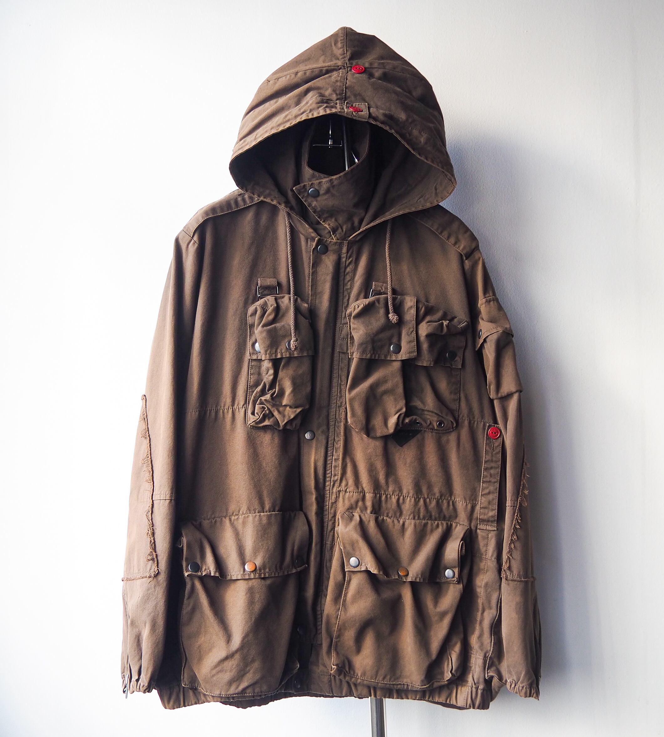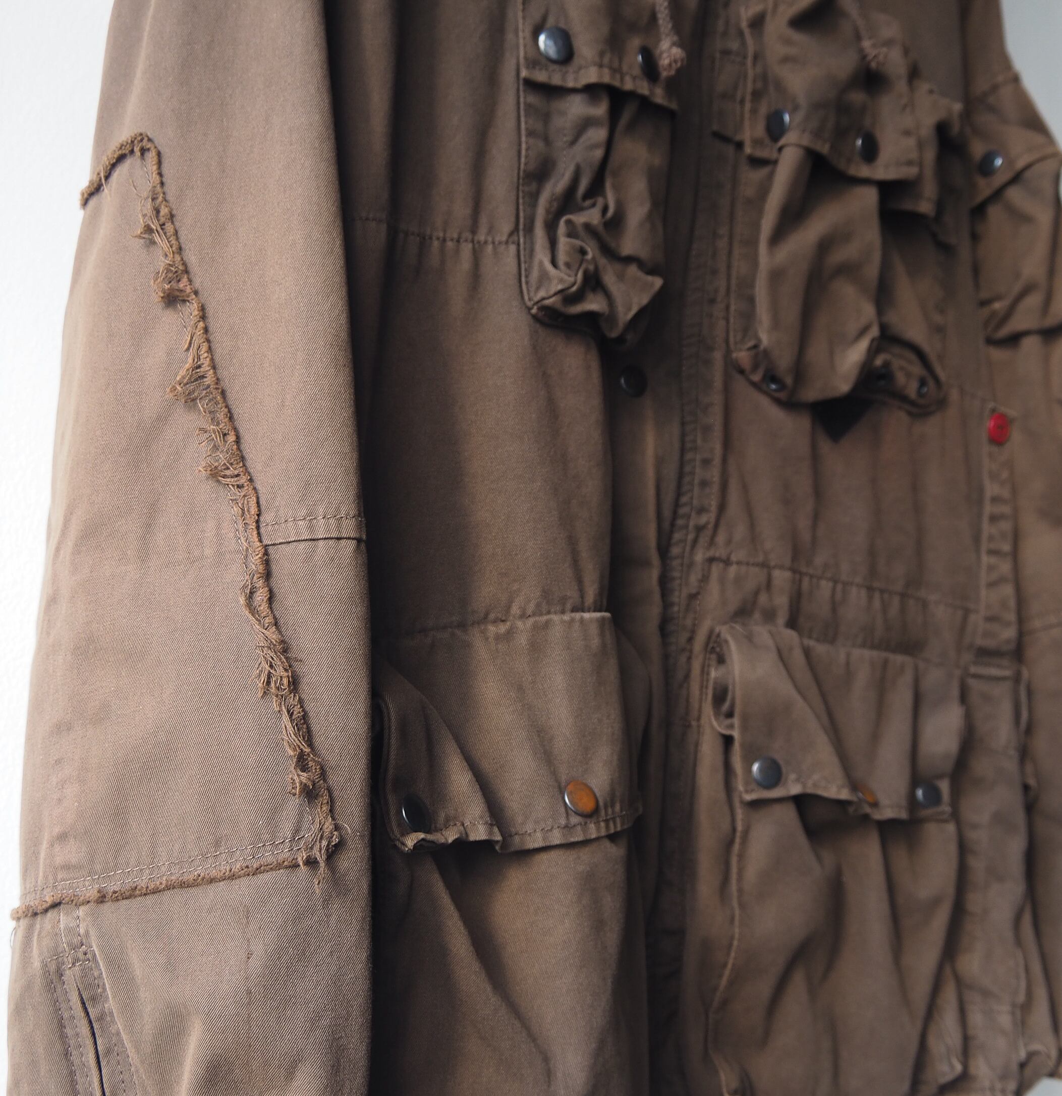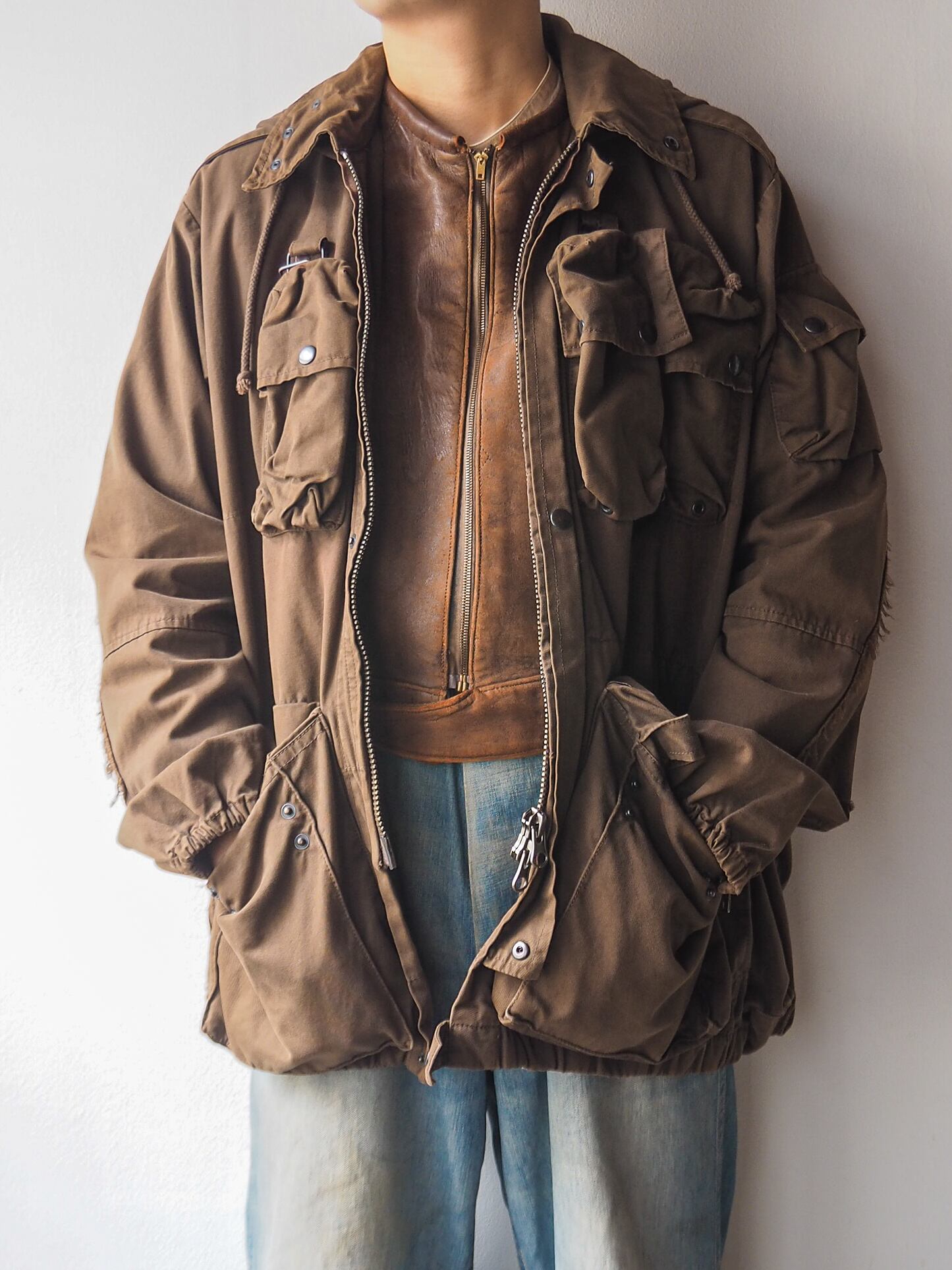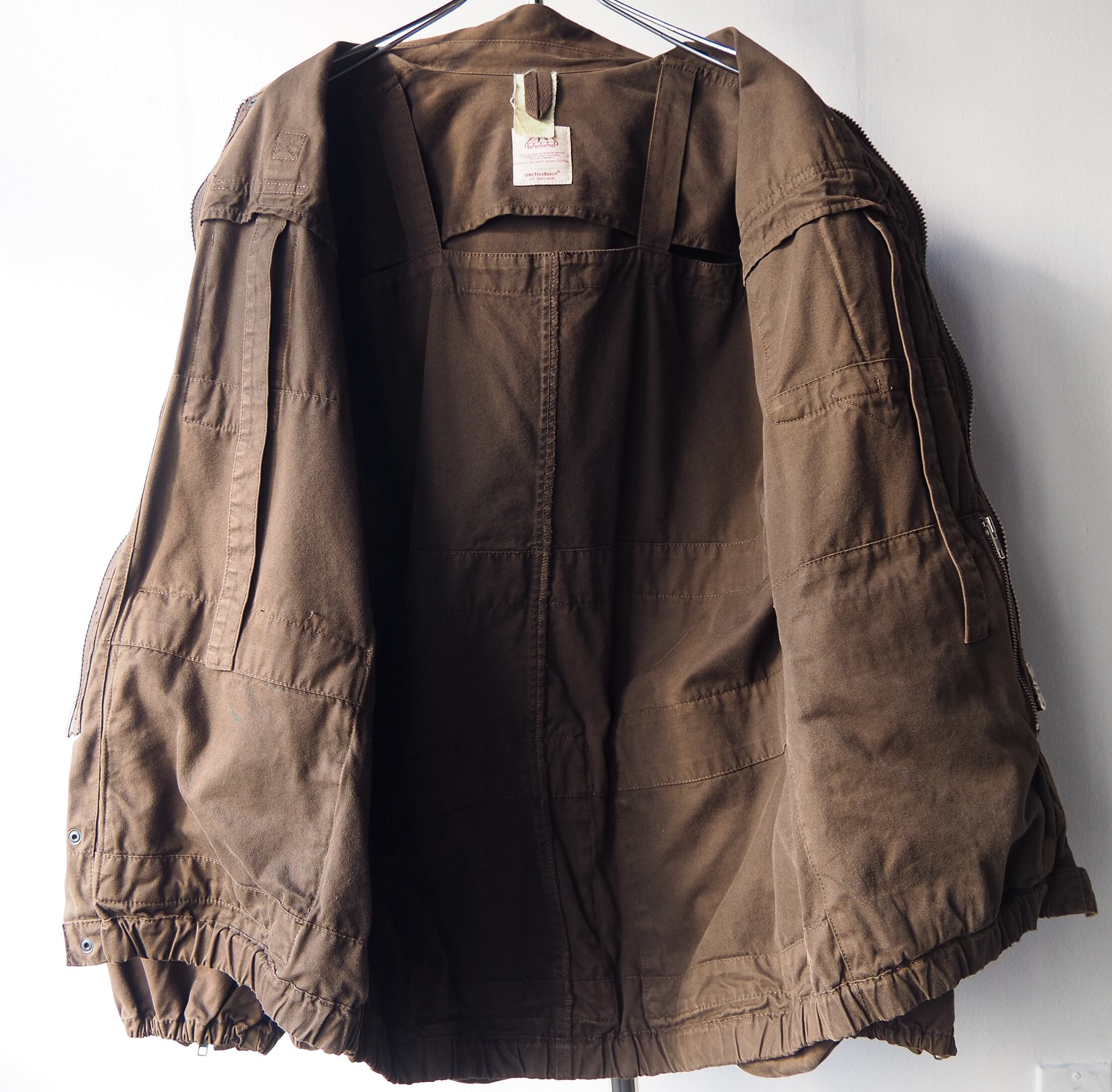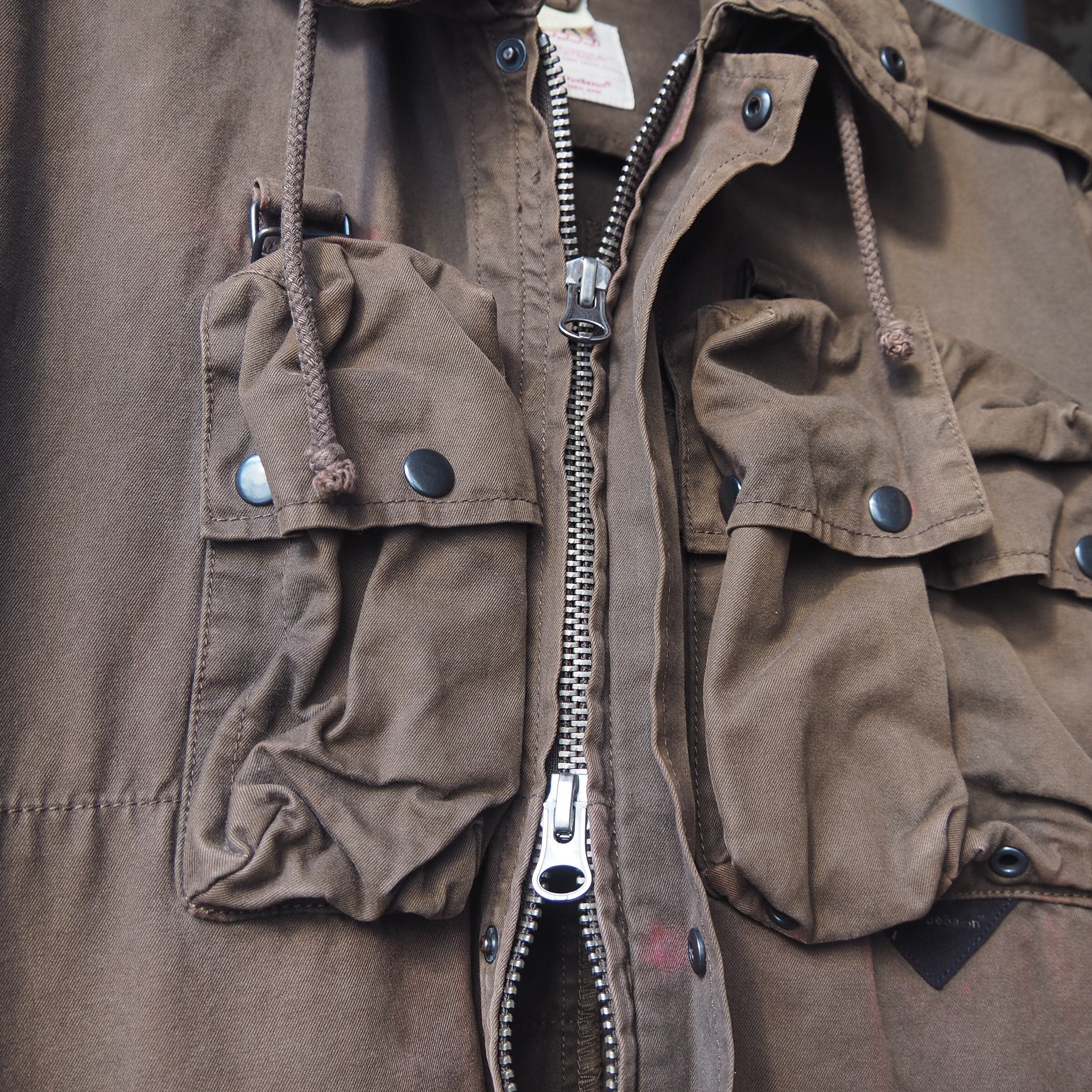 ミリタリーウェアにおいては衣類の上からベルトや弾帯を装備し備品を納めるのが主流ですがその役を一つの衣類で賄おうという設計から生まれたアルパインジャケット。こちらもまた例に漏れずギミック満載のへヴィーな1着になっています。