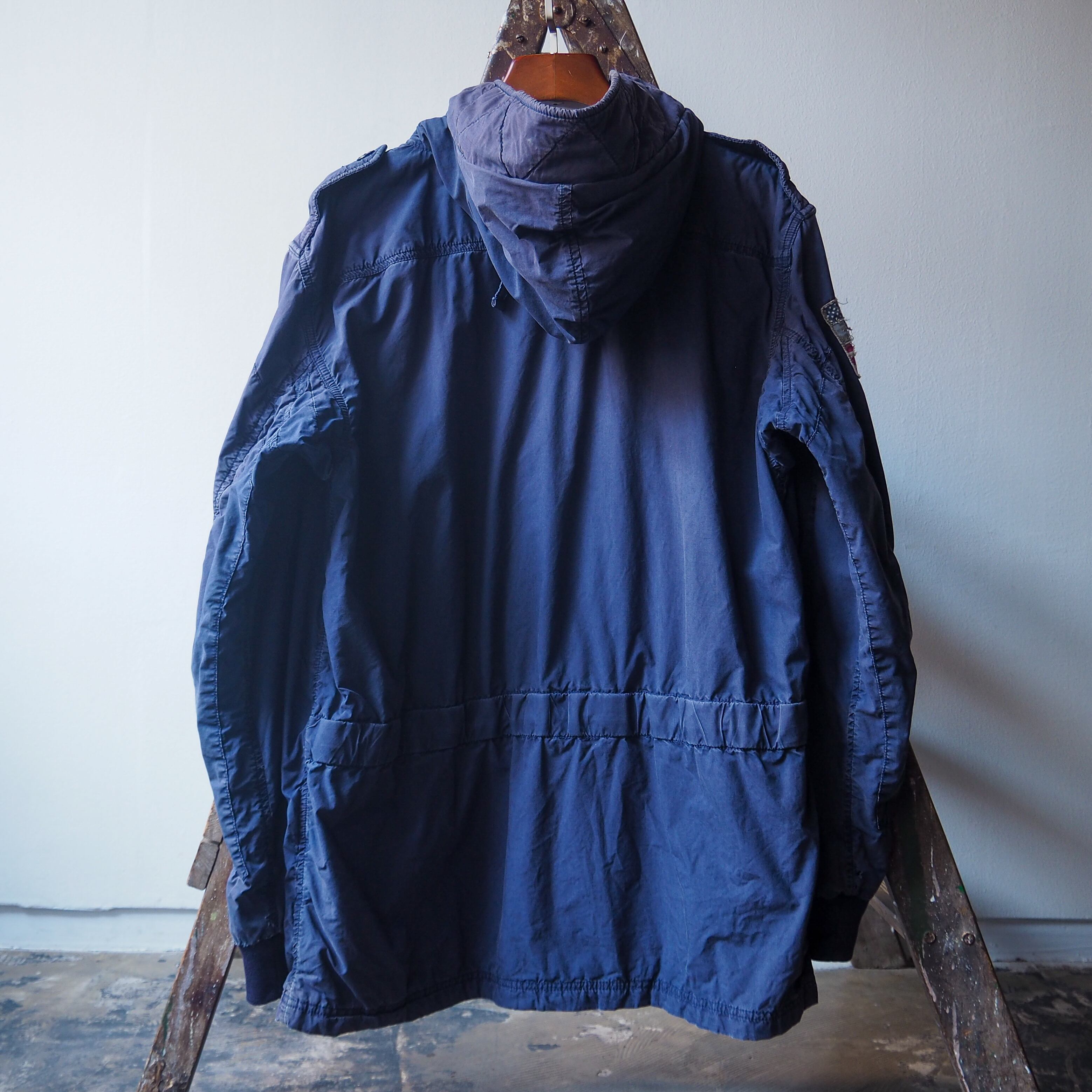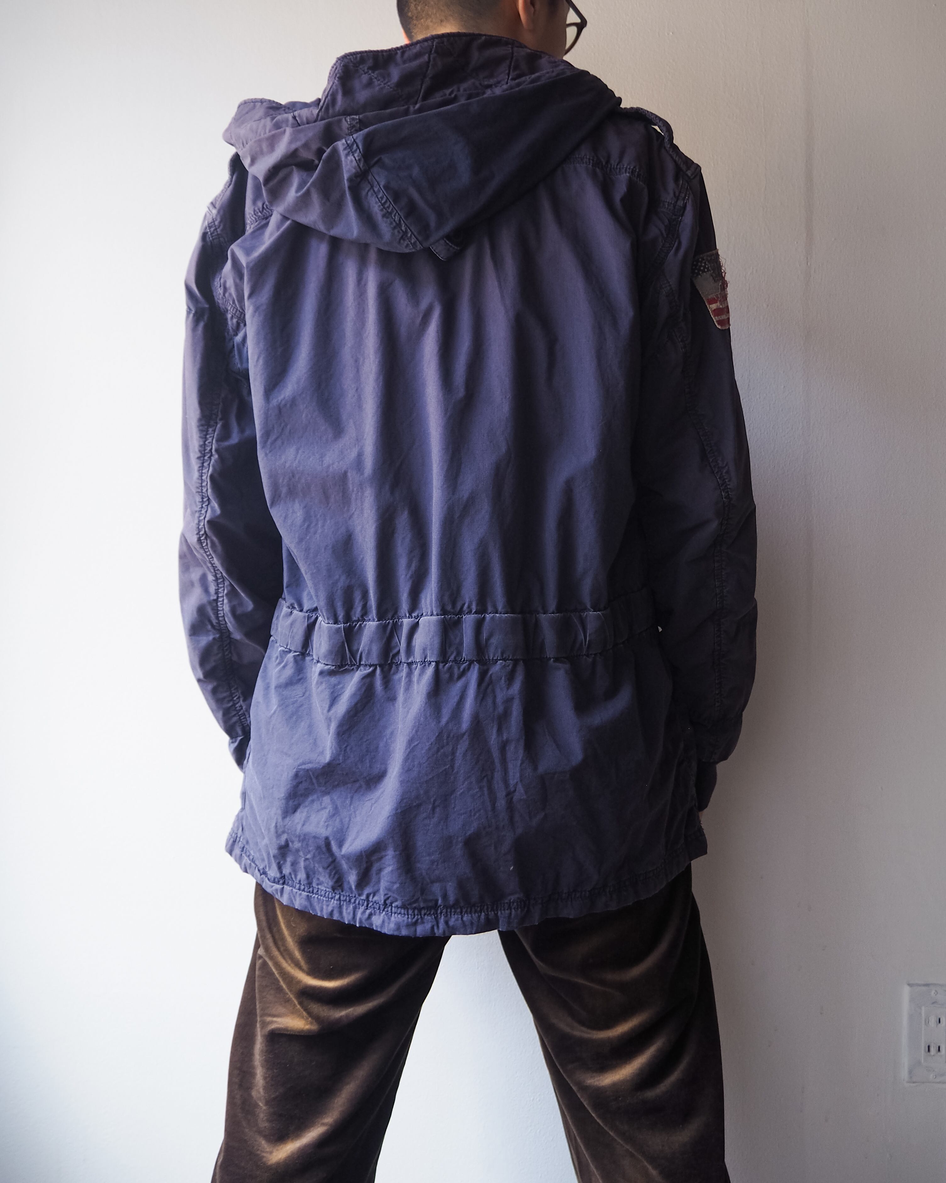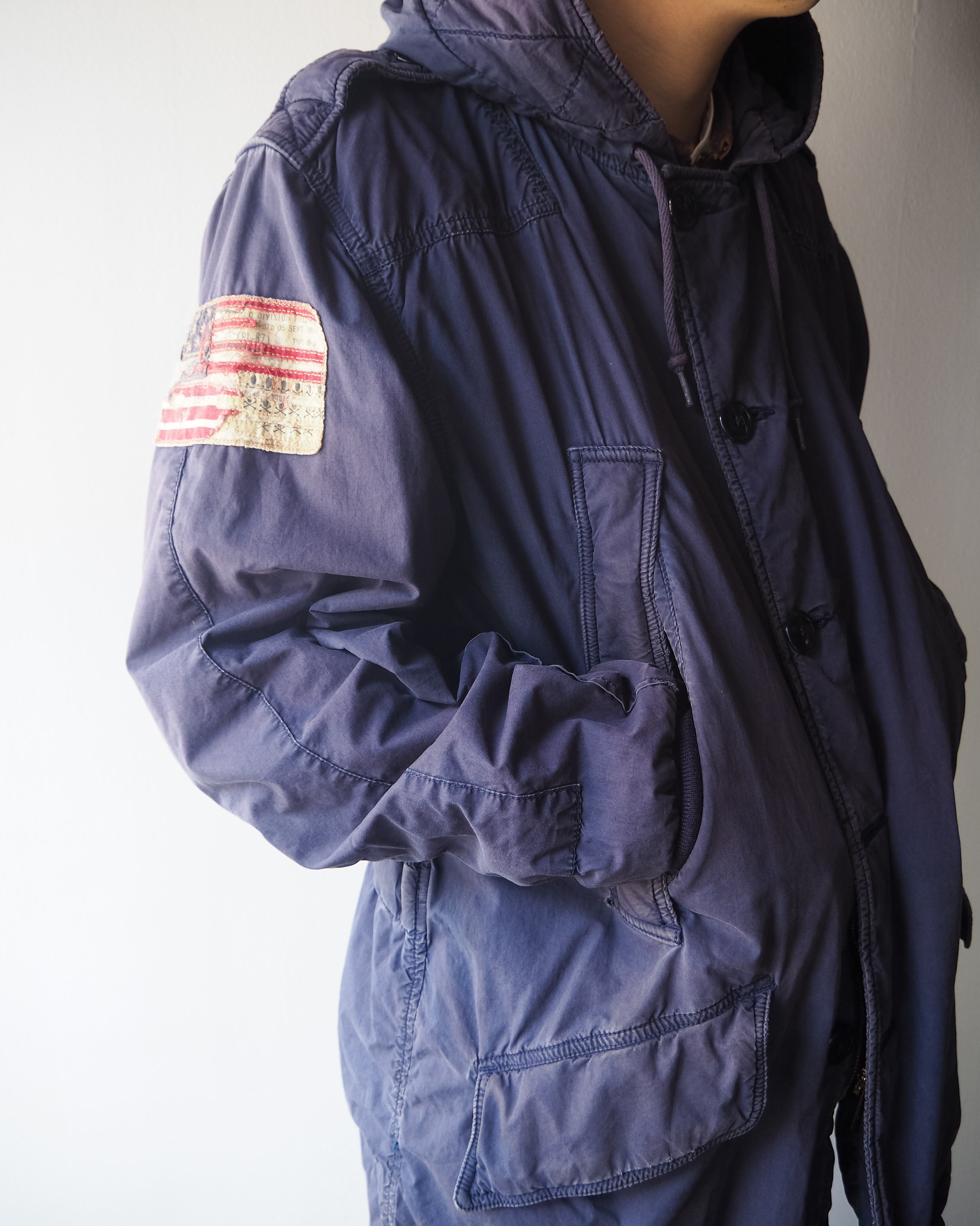 ネイビーに染め上げられたポロジーンズのミリタリーサンプリングシリーズ。特に驚くのが右肩に縫い付けられた星条旗のパッチ。