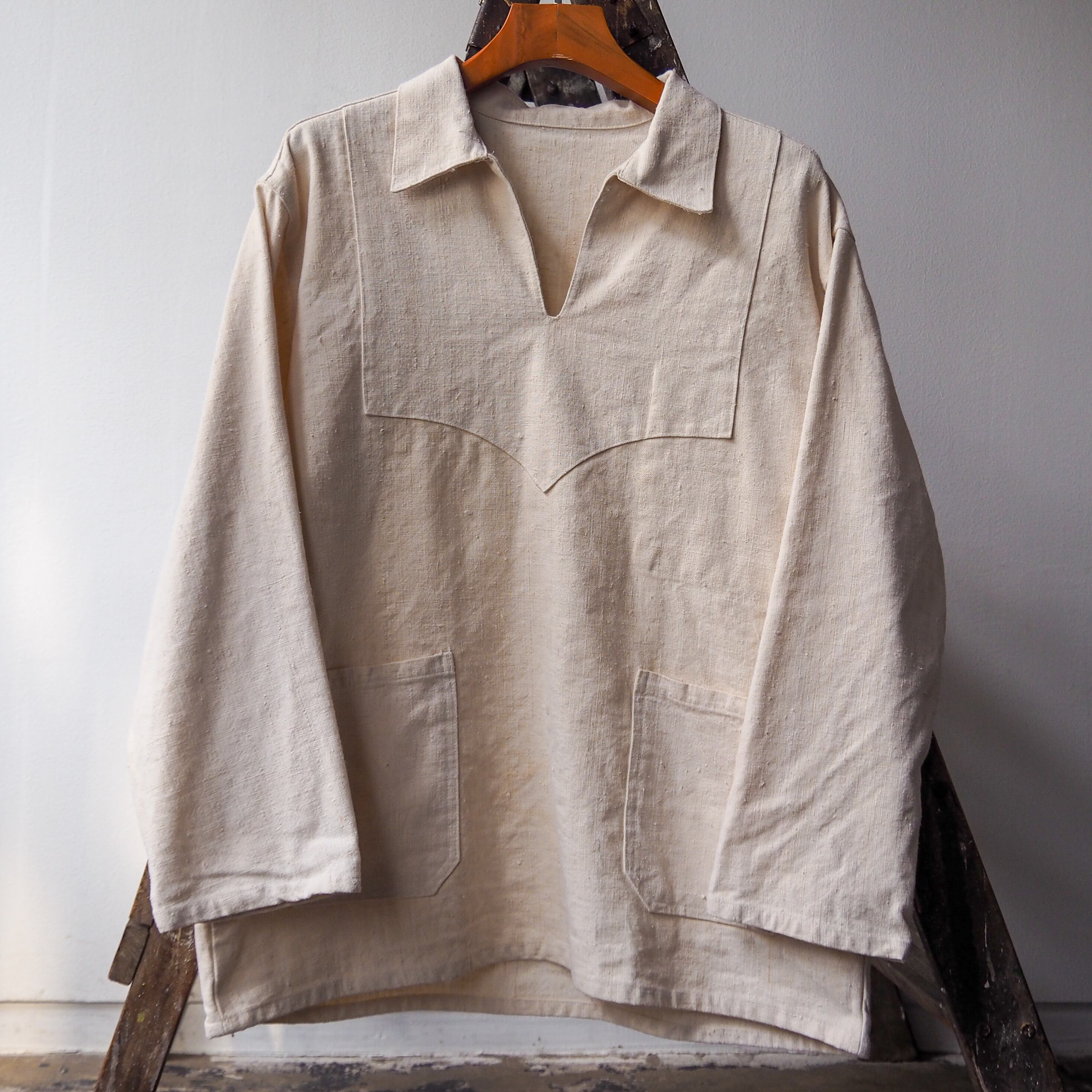 1940-50年代頃のフランスの古い生地が見つかったのでフランス沿岸部で古くから親しまれてきたスキッパータイプのフィッシャーマンスモックに仕立てました。