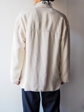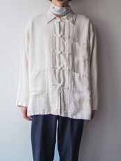 フロントにはフレンチワークらしい三つのポケットが付属していながら、前合わせは西洋の”洋服”に見られるボタン合わせではなく結び目を輪っかに通すチャイナシャツに特有の設計。