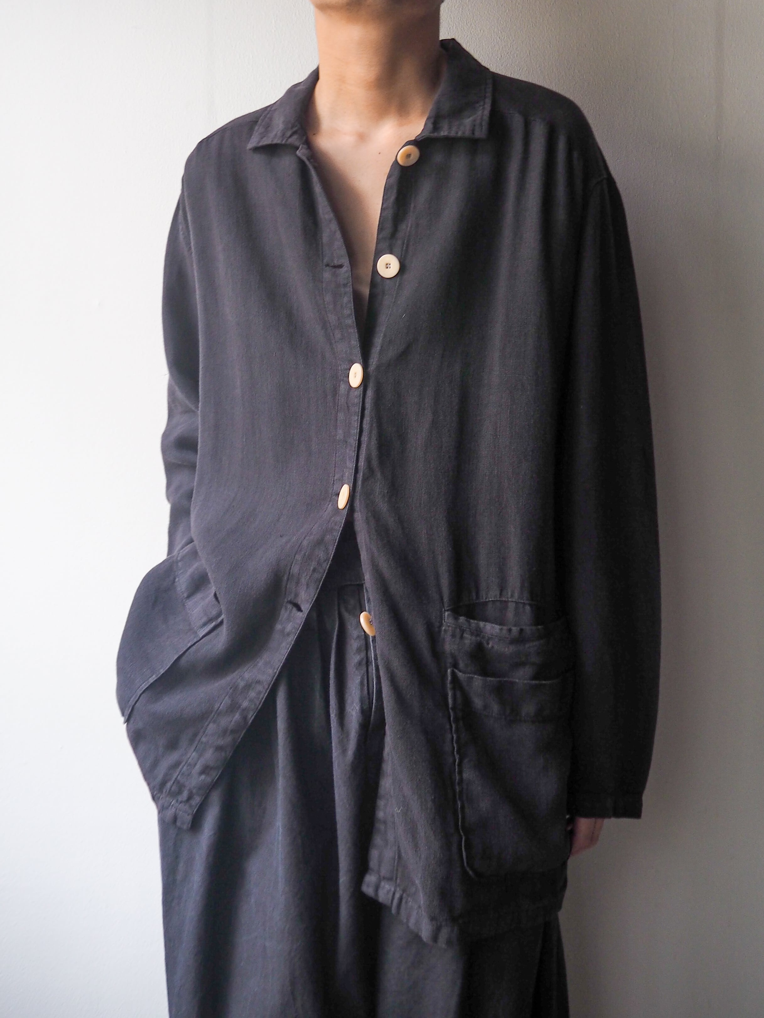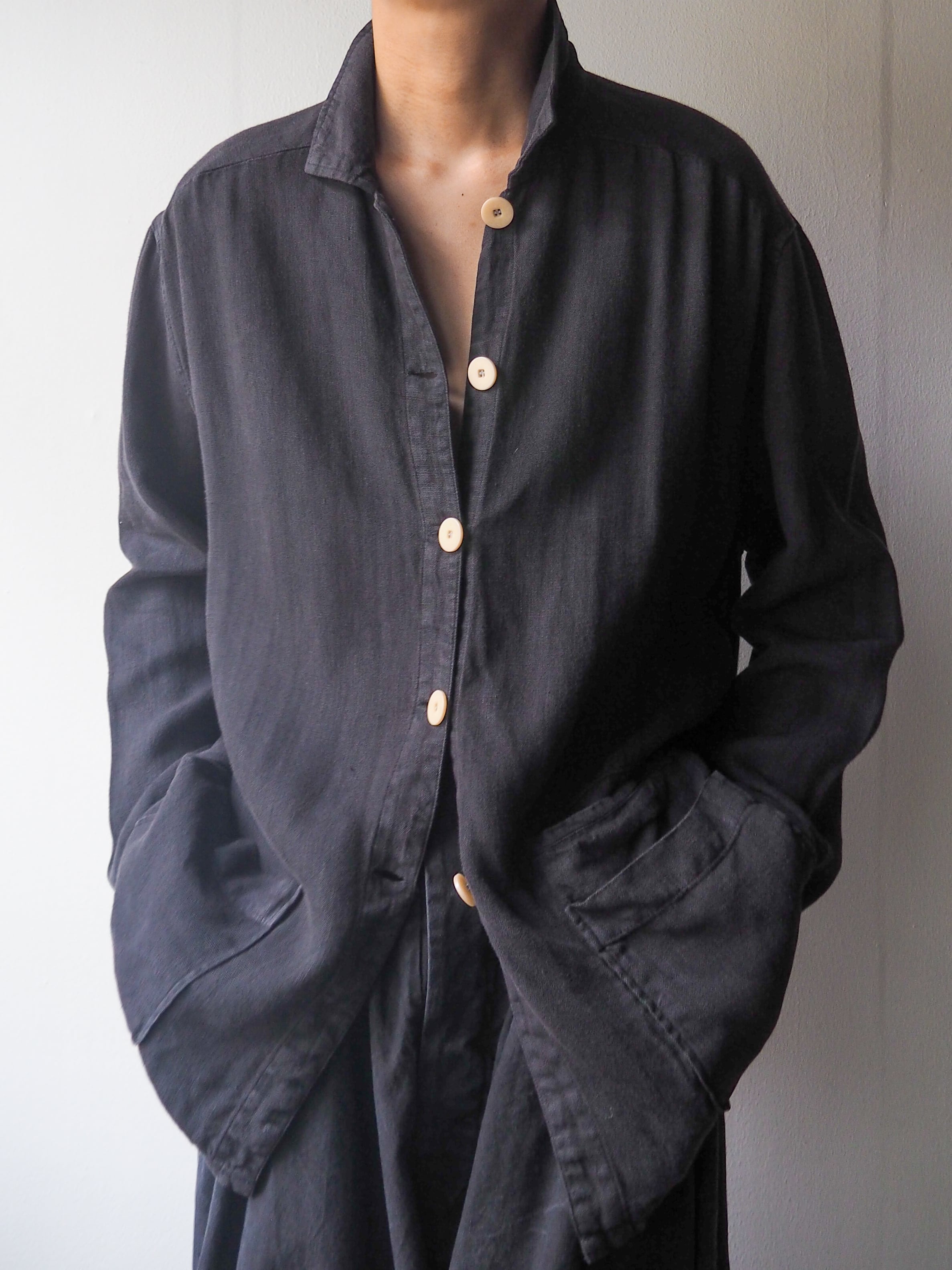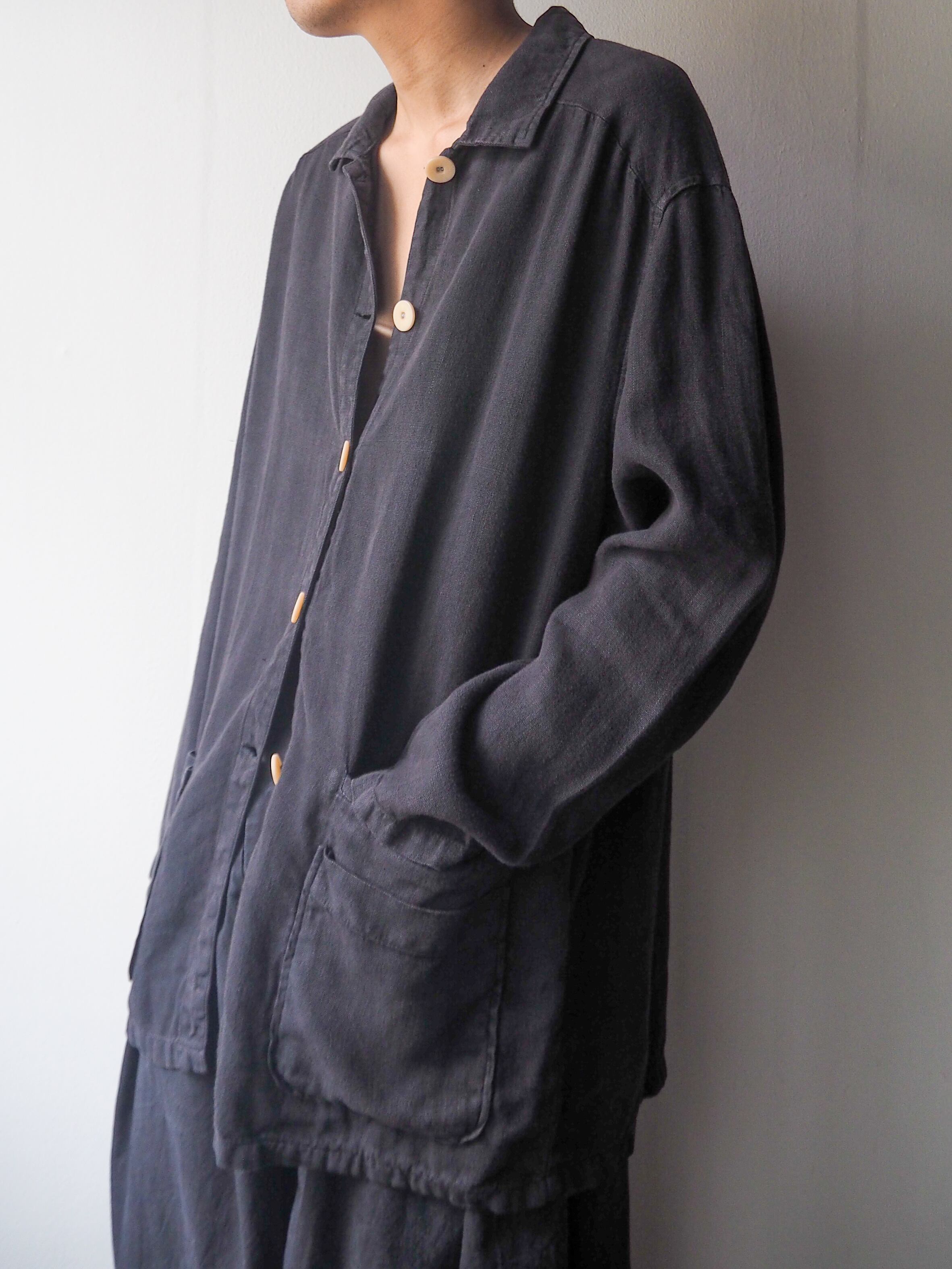 軽やかに織り込まれたブラックリネンの身体の動きに合わせて生まれるドレープ感のある表情はたいへんにモードな雰囲気。