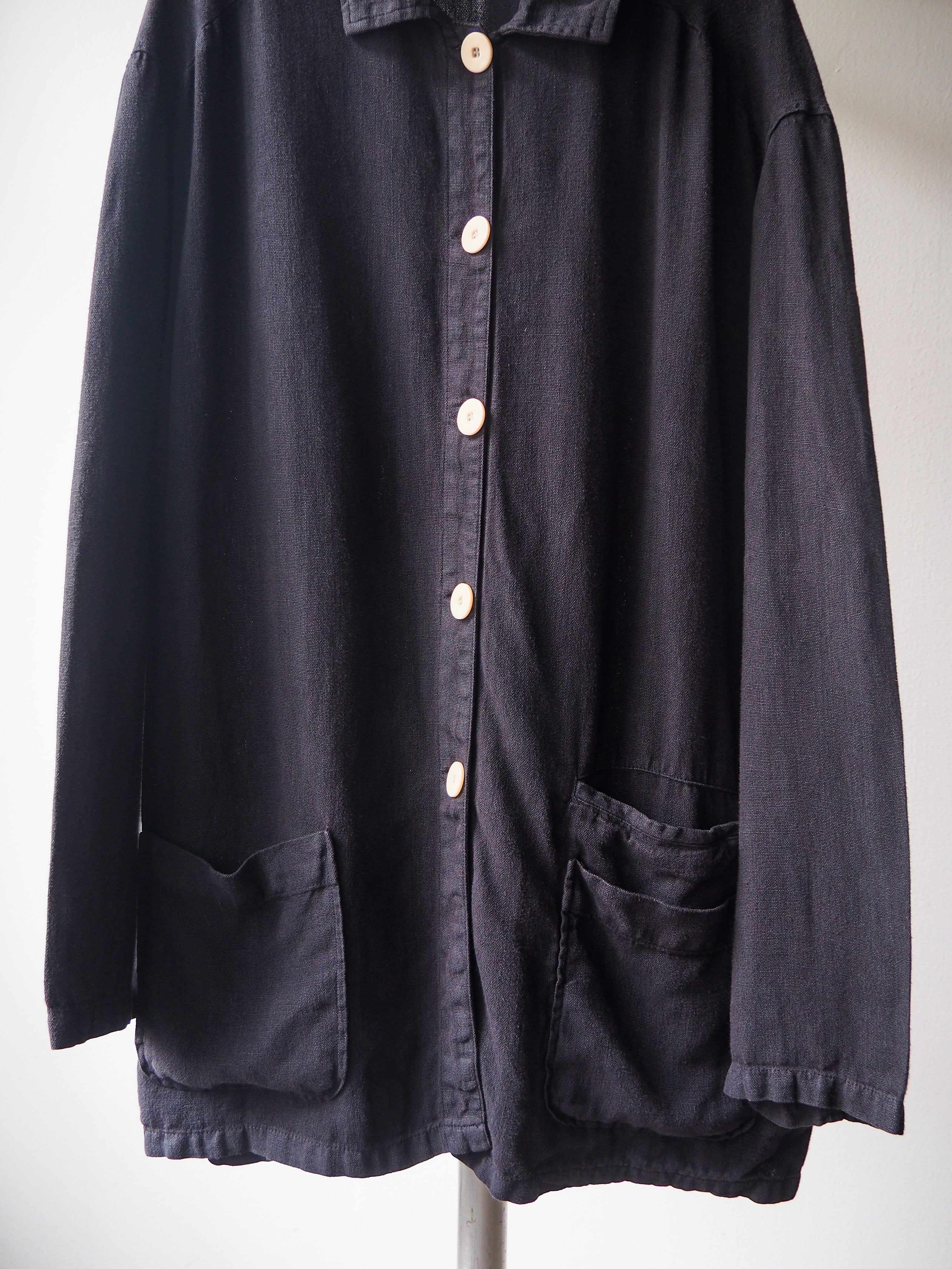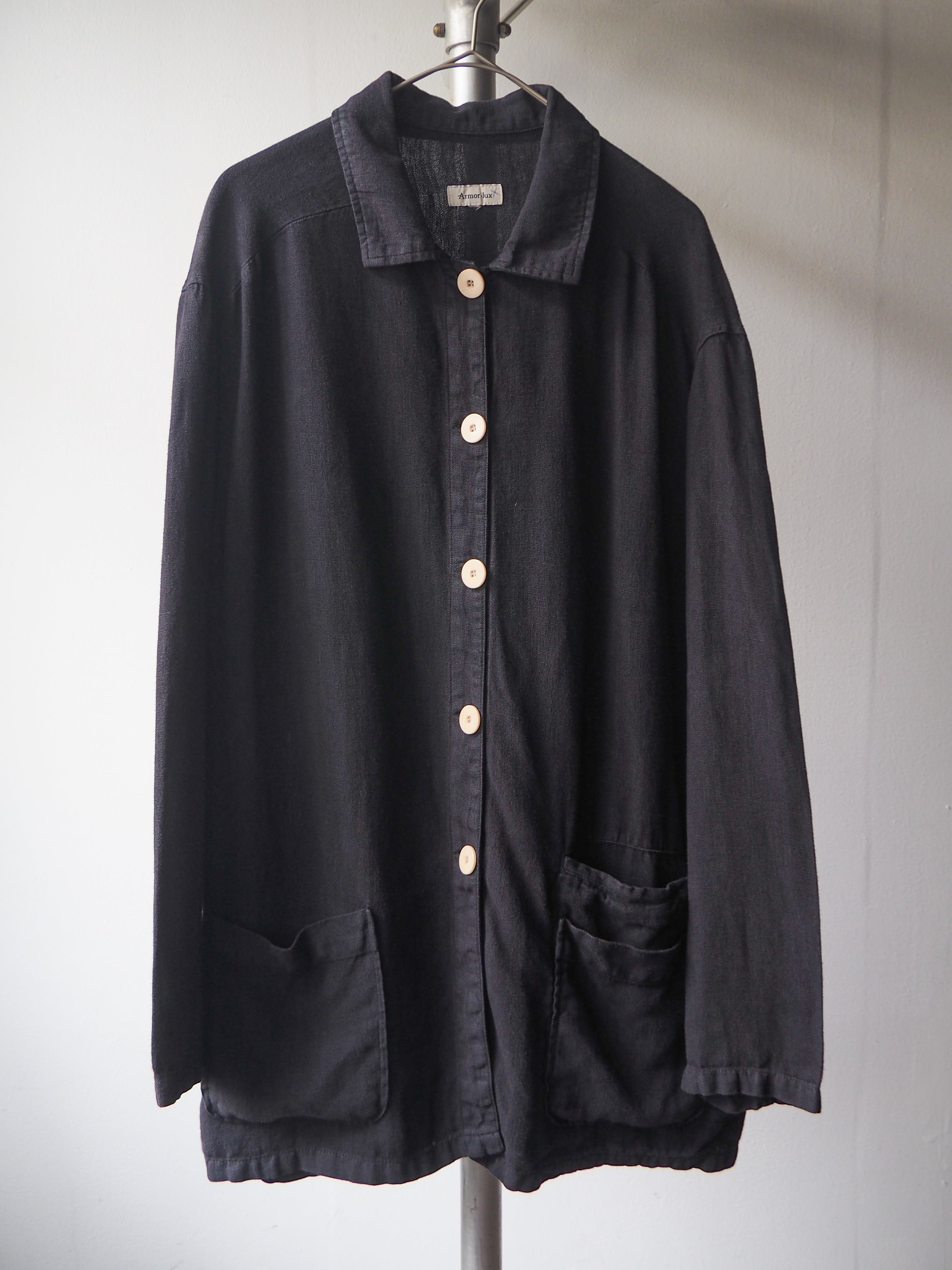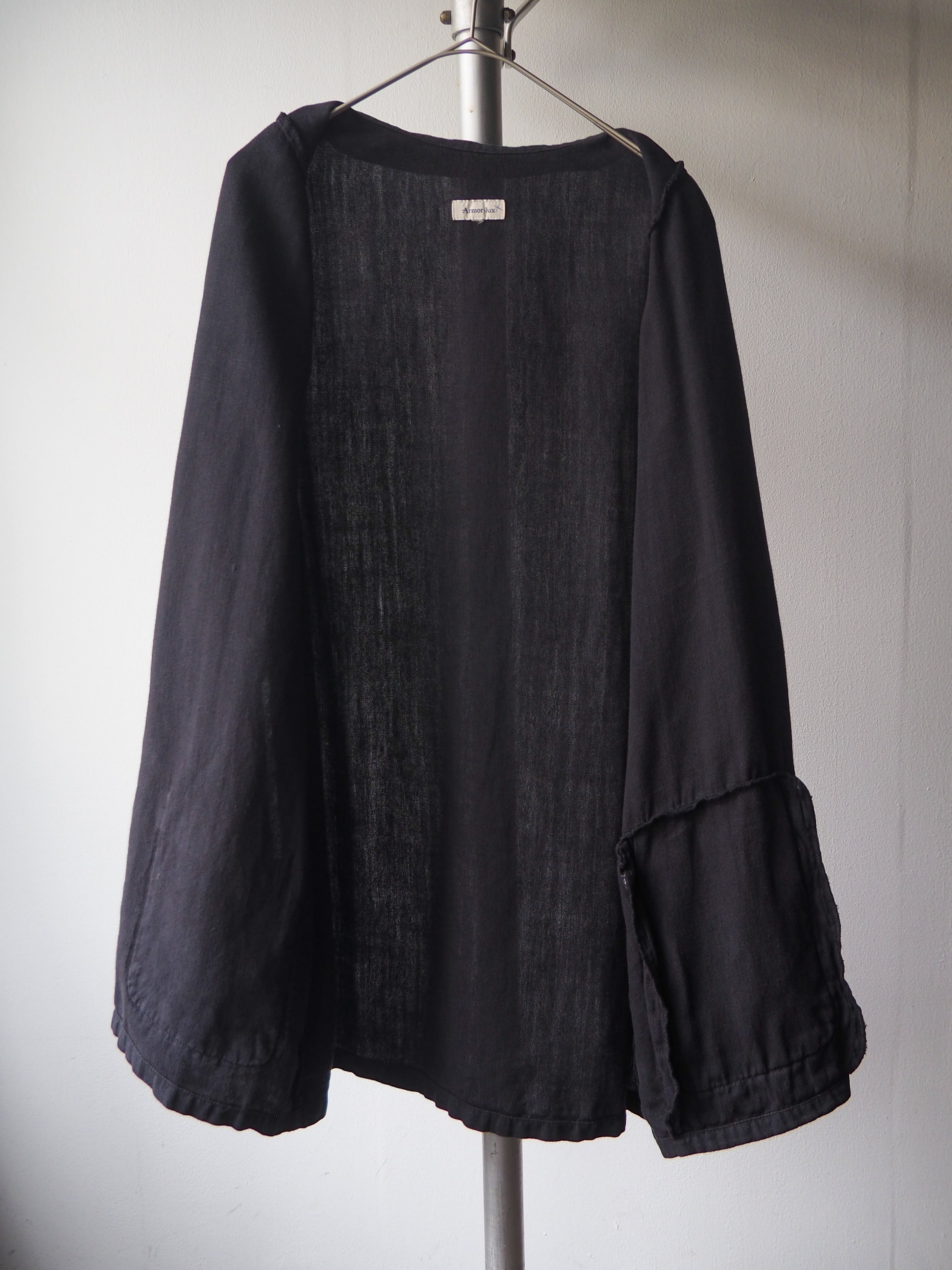 軽やかに織り込まれたブラックリネンの身体の動きに合わせて生まれるドレープ感のある表情はたいへんにモードな雰囲気。