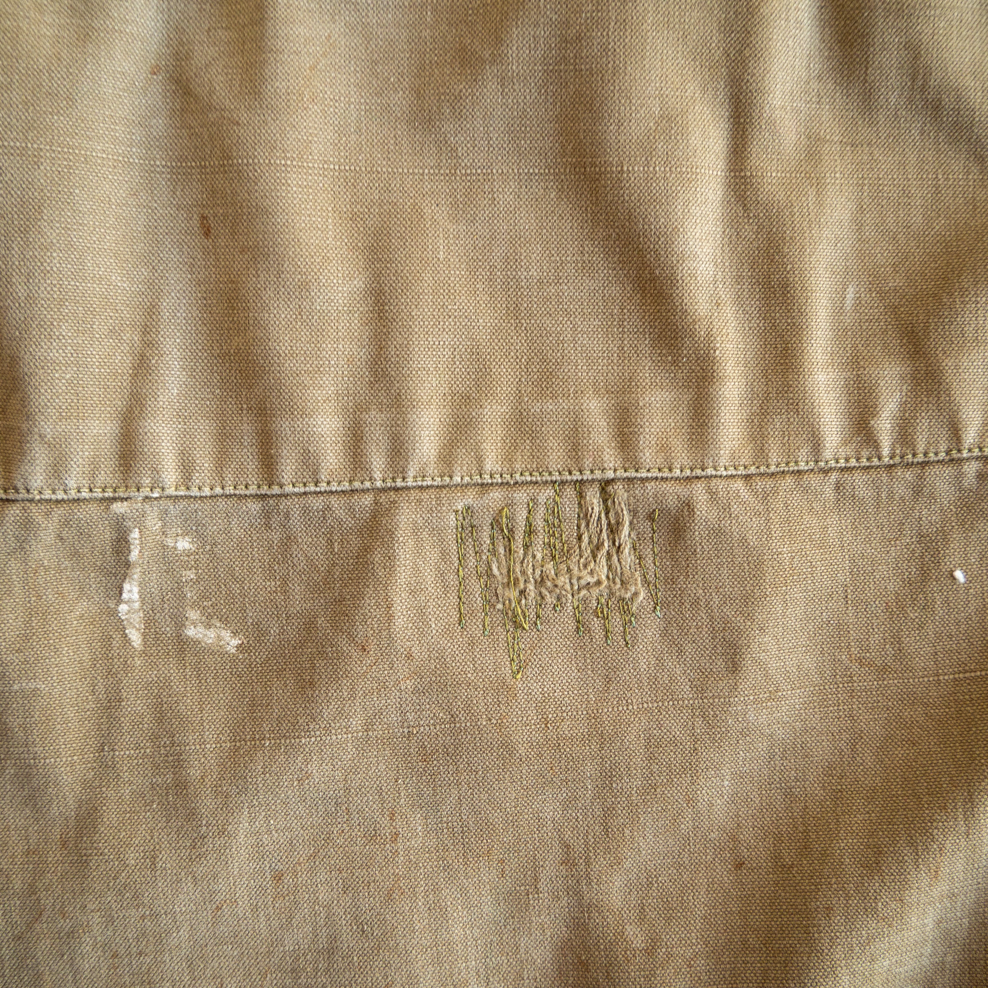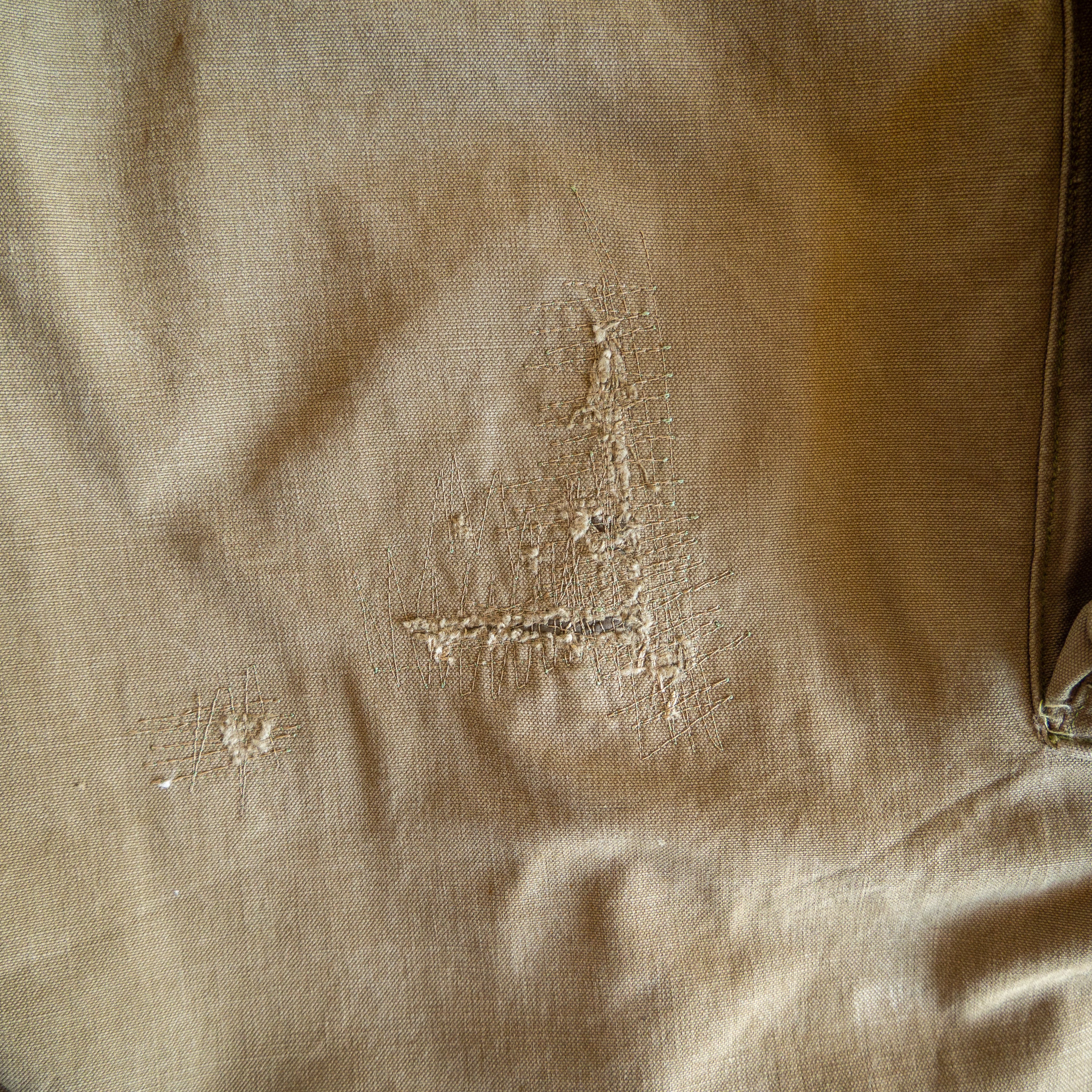 基本的にM-47は前期はツイル生地、後期はヘリンボーンツイル生地と分かれておりますがこちらは目の細かい平織りのコットンキャンバス生地で仕立てられた通称"Hopsack"と呼ばれるモデル。暑い地域での着用を想定し、試験的に採用されたM-47の中でも非常に希少な一本です。