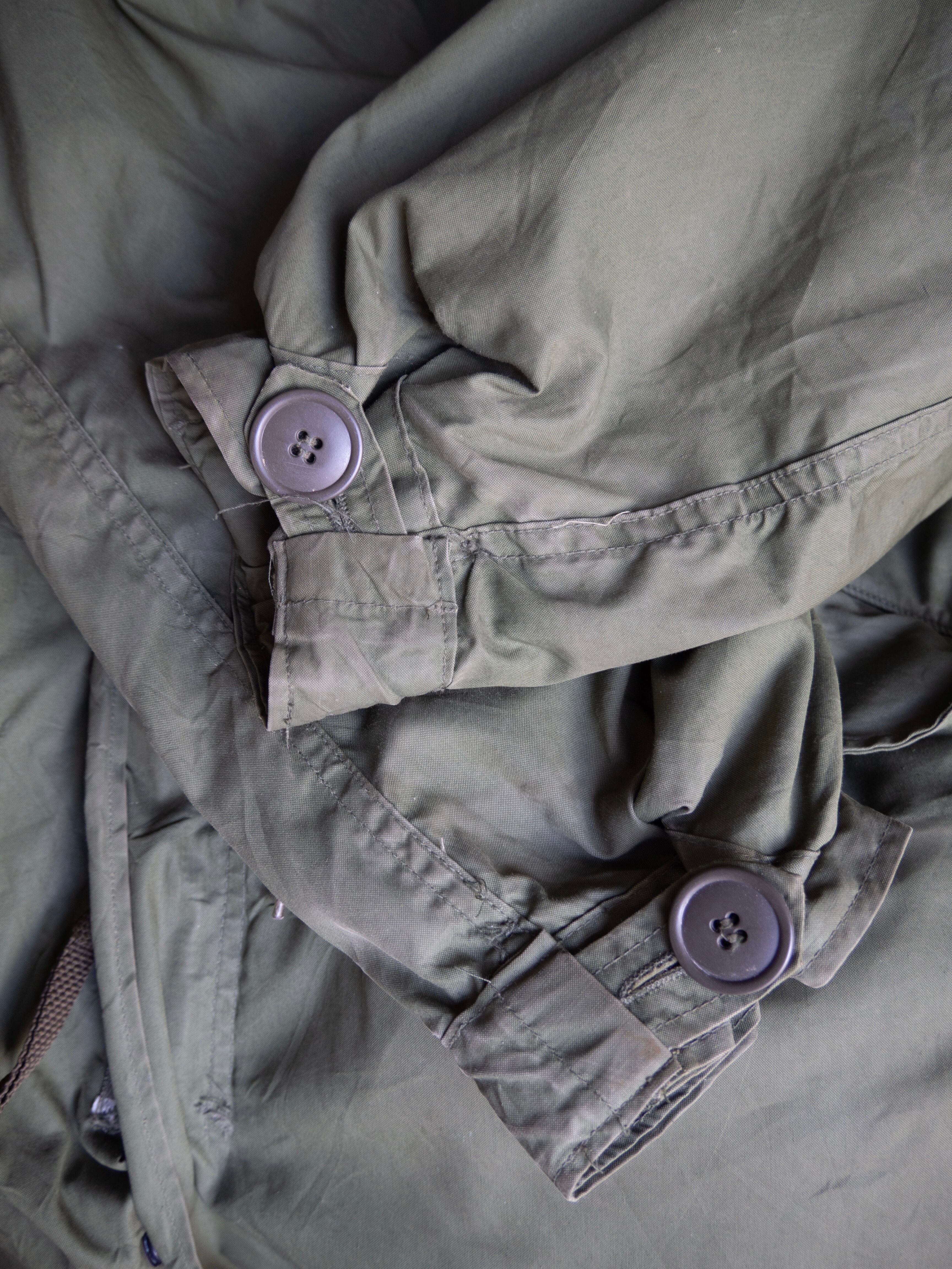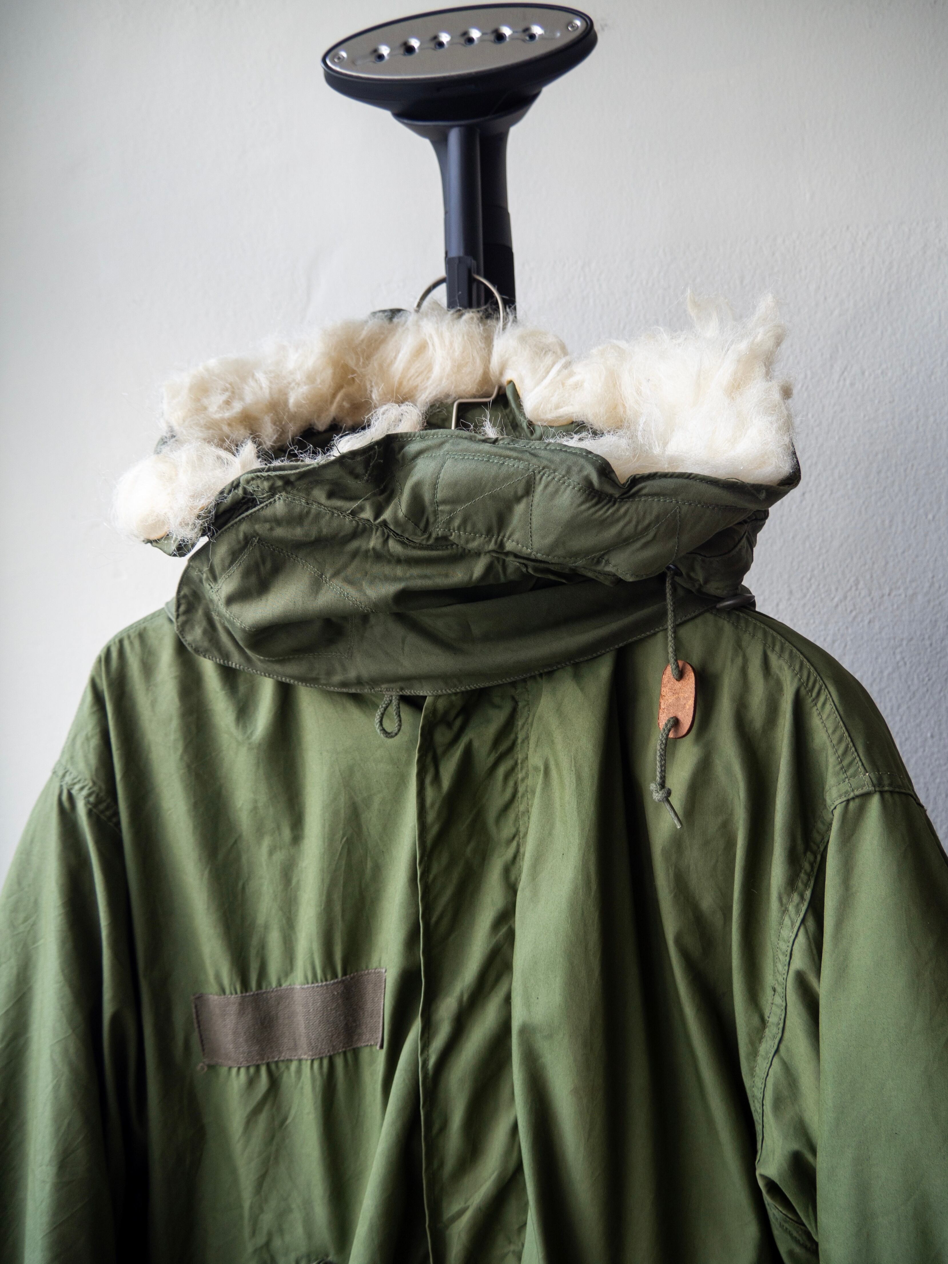 極寒地での戦闘や移動を想定して作られたこちらのパーカー。中にたくさん着込めるように、広めにとられた身幅とアームホールやウエストについたドローコードなど厳しい寒さから身を護るためのディティールが満載です。