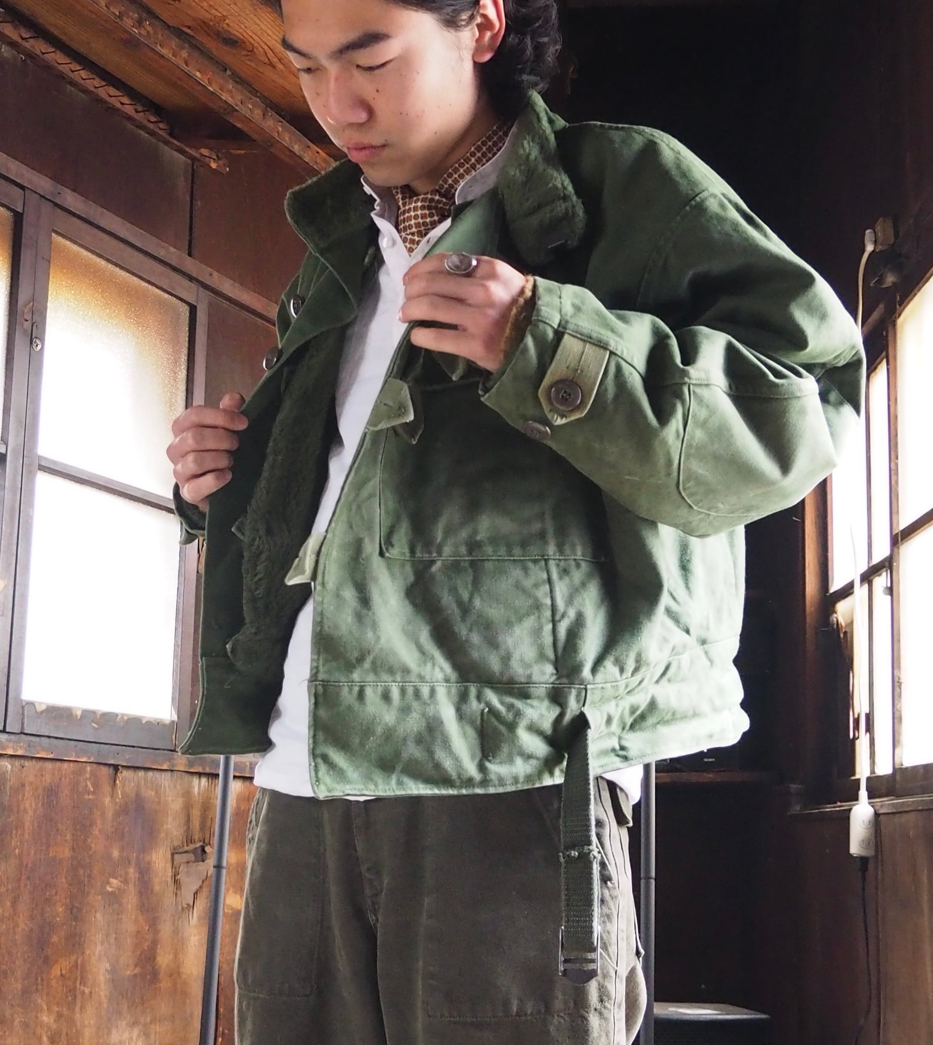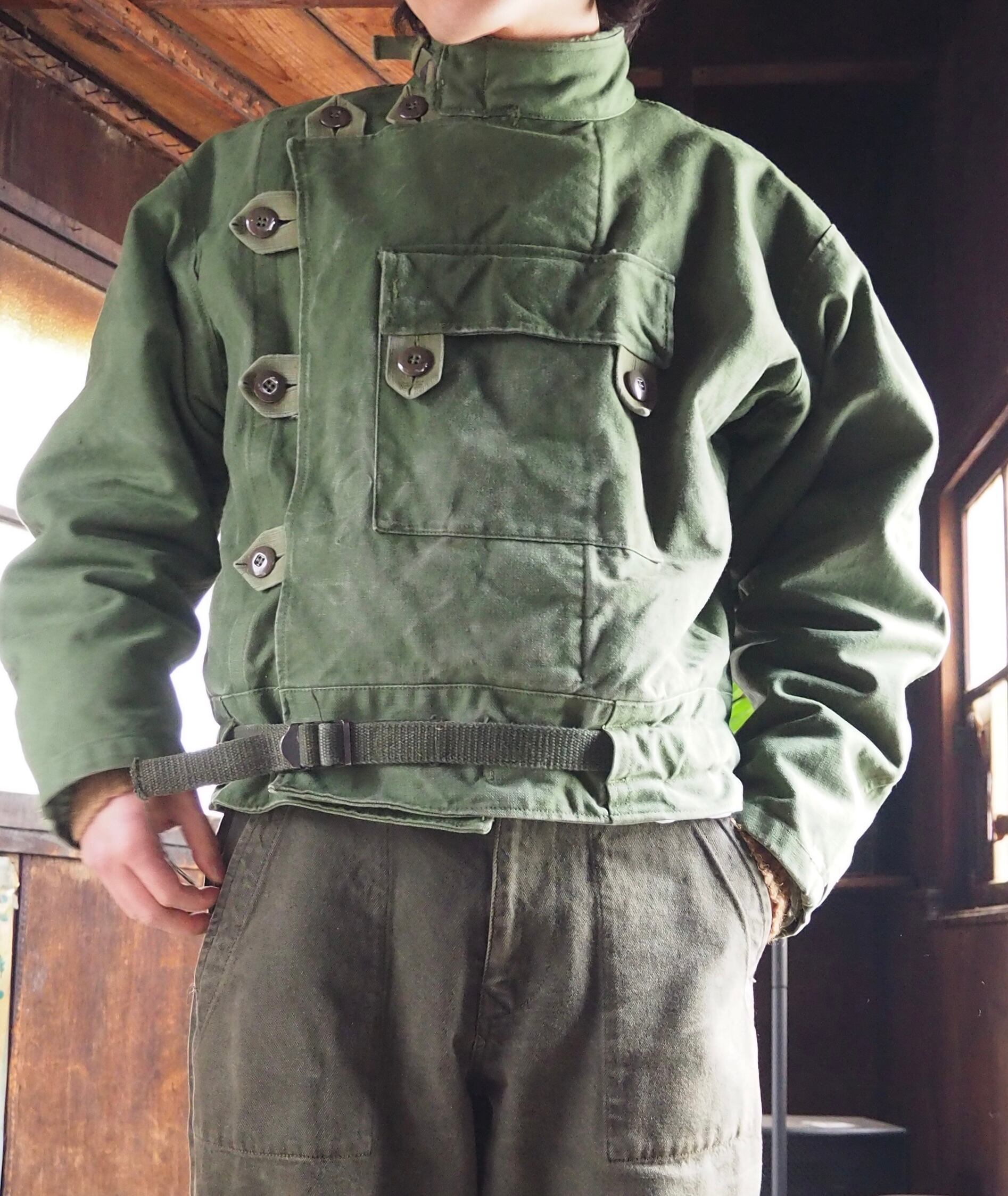 ベルト式のチンストラップ、ダブルのボタン、フロントについた四角い大きなポケット、ミリタリーとは思えないギミックが目白押しです。