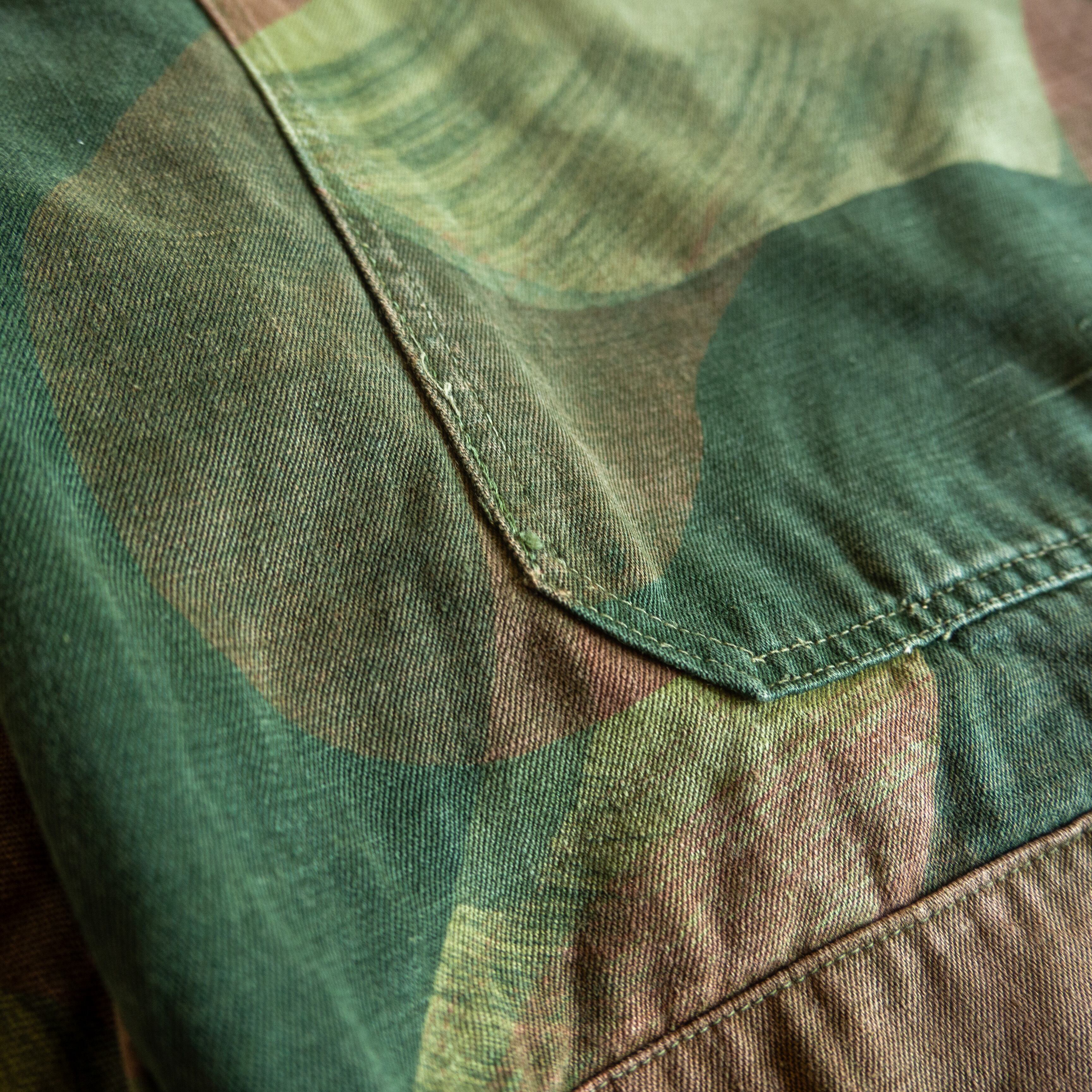 イギリス軍のパンツを元に作られたと言われているこちらの一本。読んで字の如くブラシで殴り書いたようなカモフラージュ柄とアシンメトリーなデザインが特徴です。