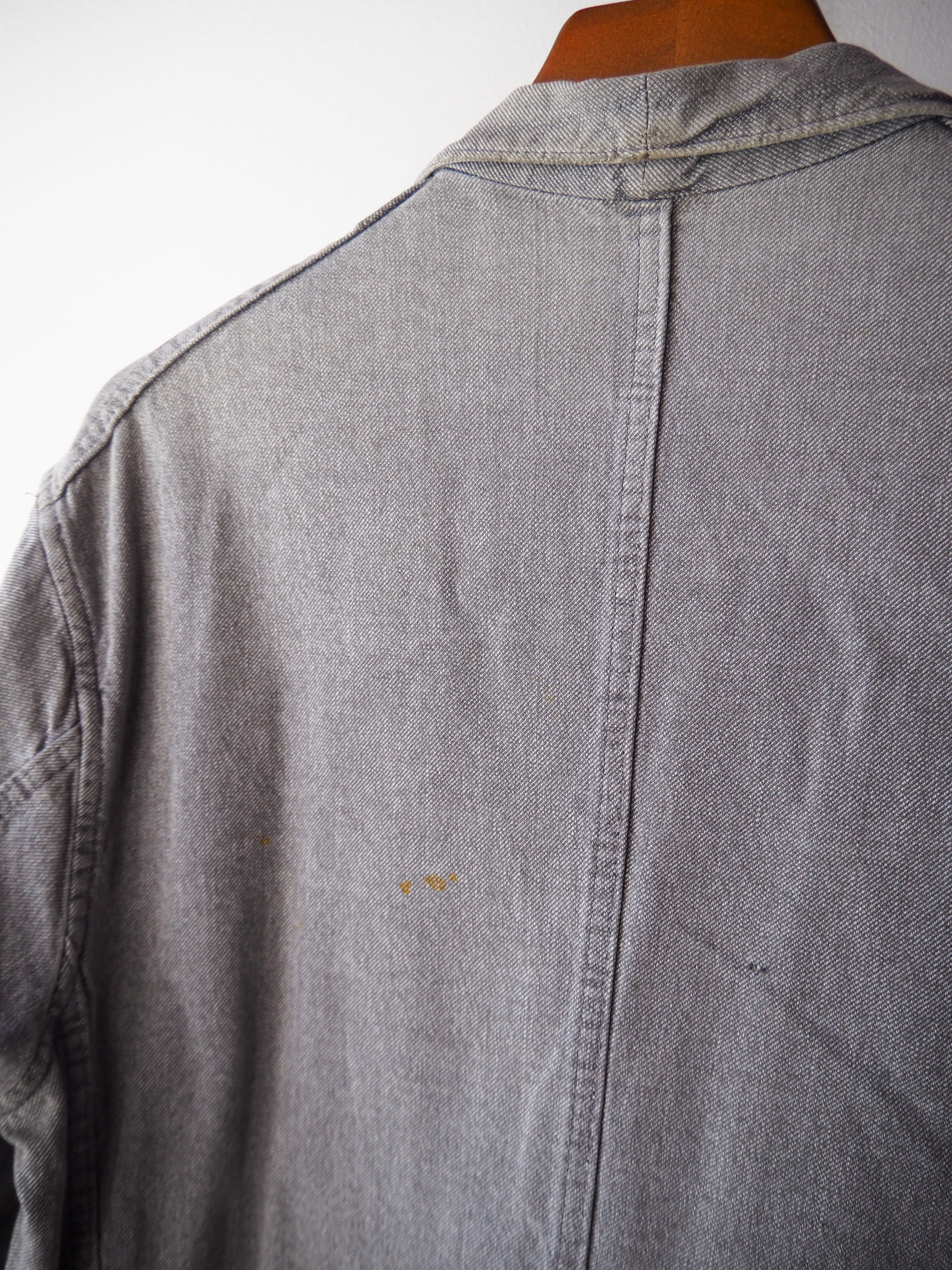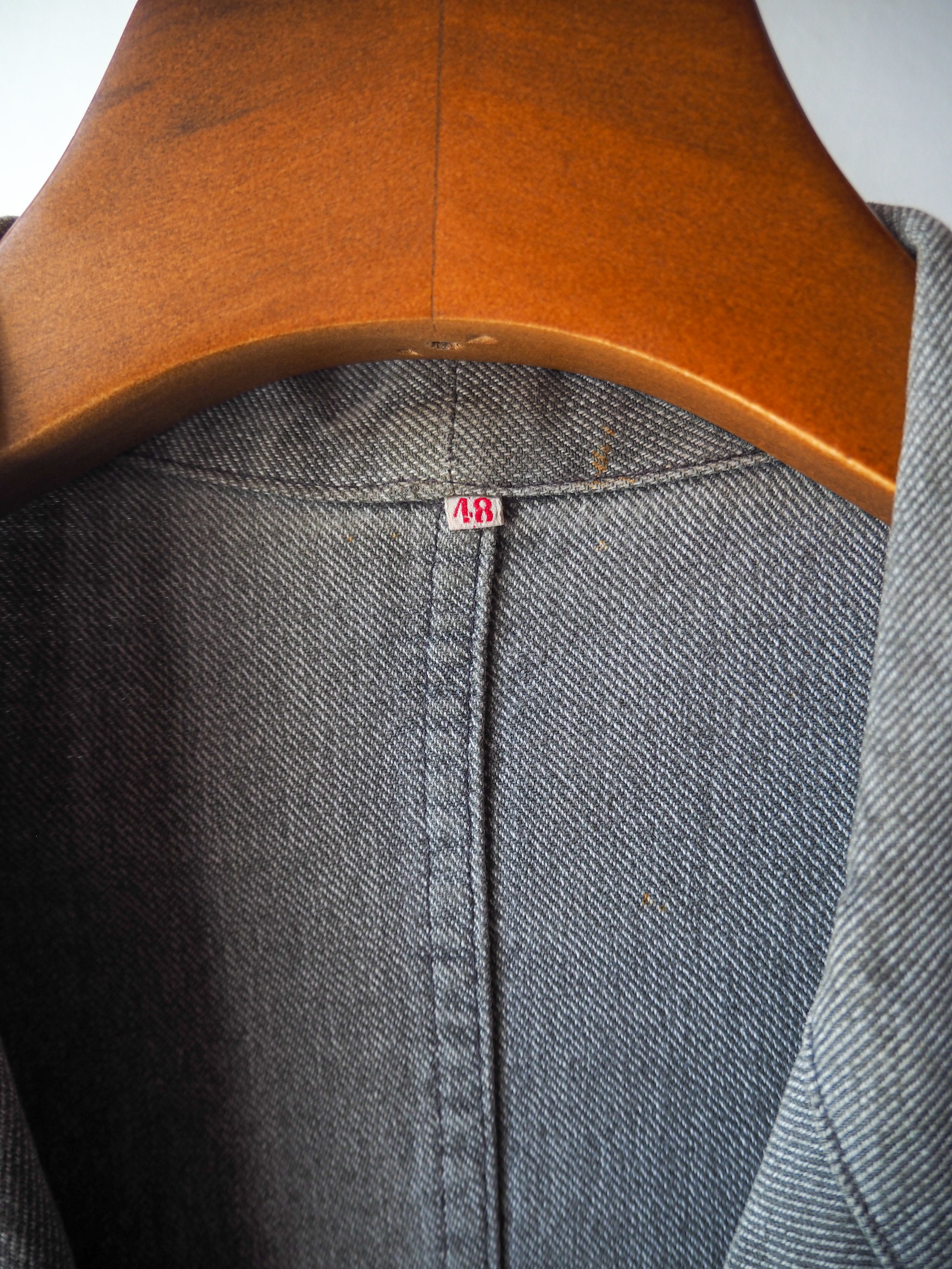 素材は「黒シャン」と呼ばれる、黒糸と白糸を掛け合わせて織られたブラックシャンブレー生地。凸凹感のあるザラッとした質感でこの生地感に惚れ込む方も多く、フレンチヴィンテージを代表する素材の1つです。