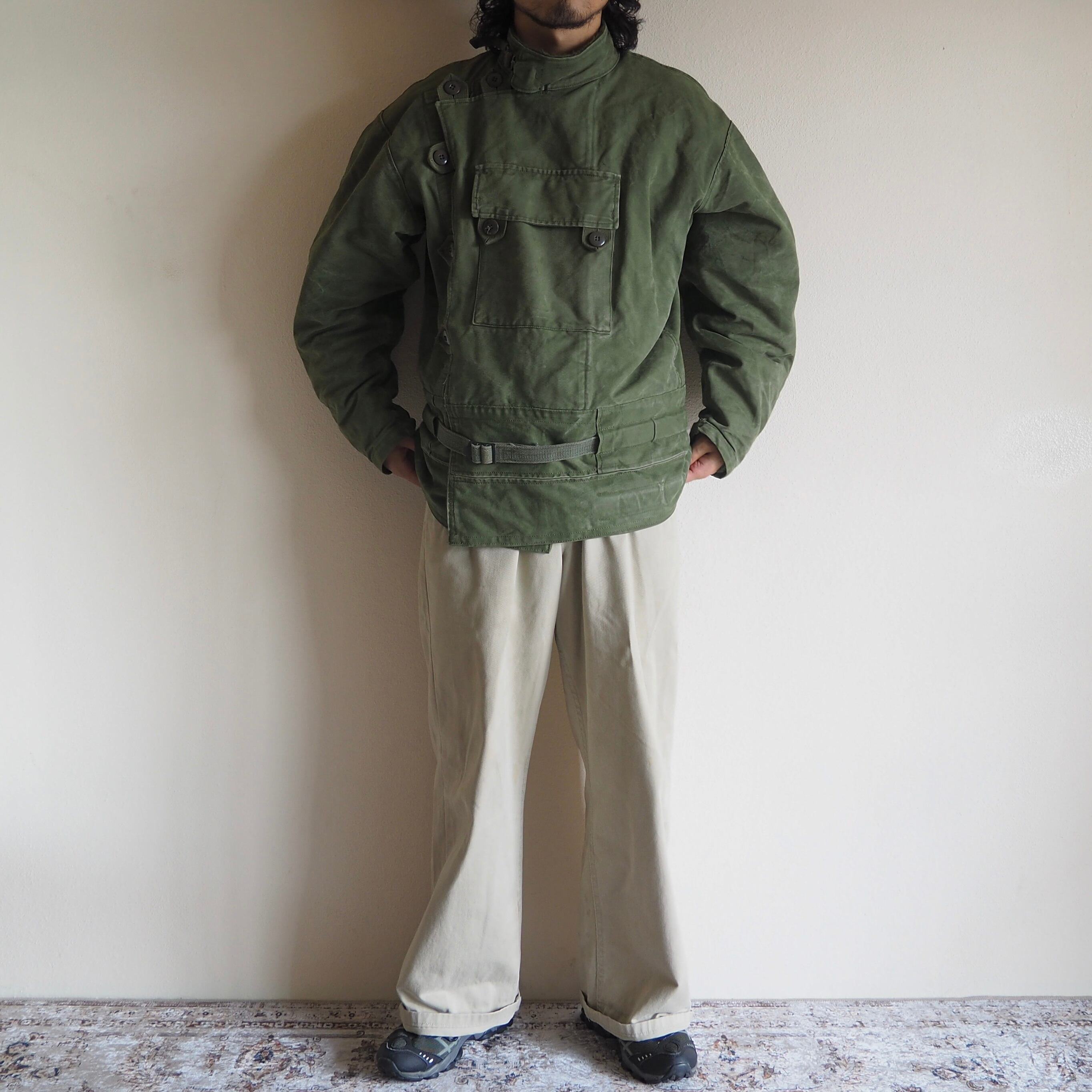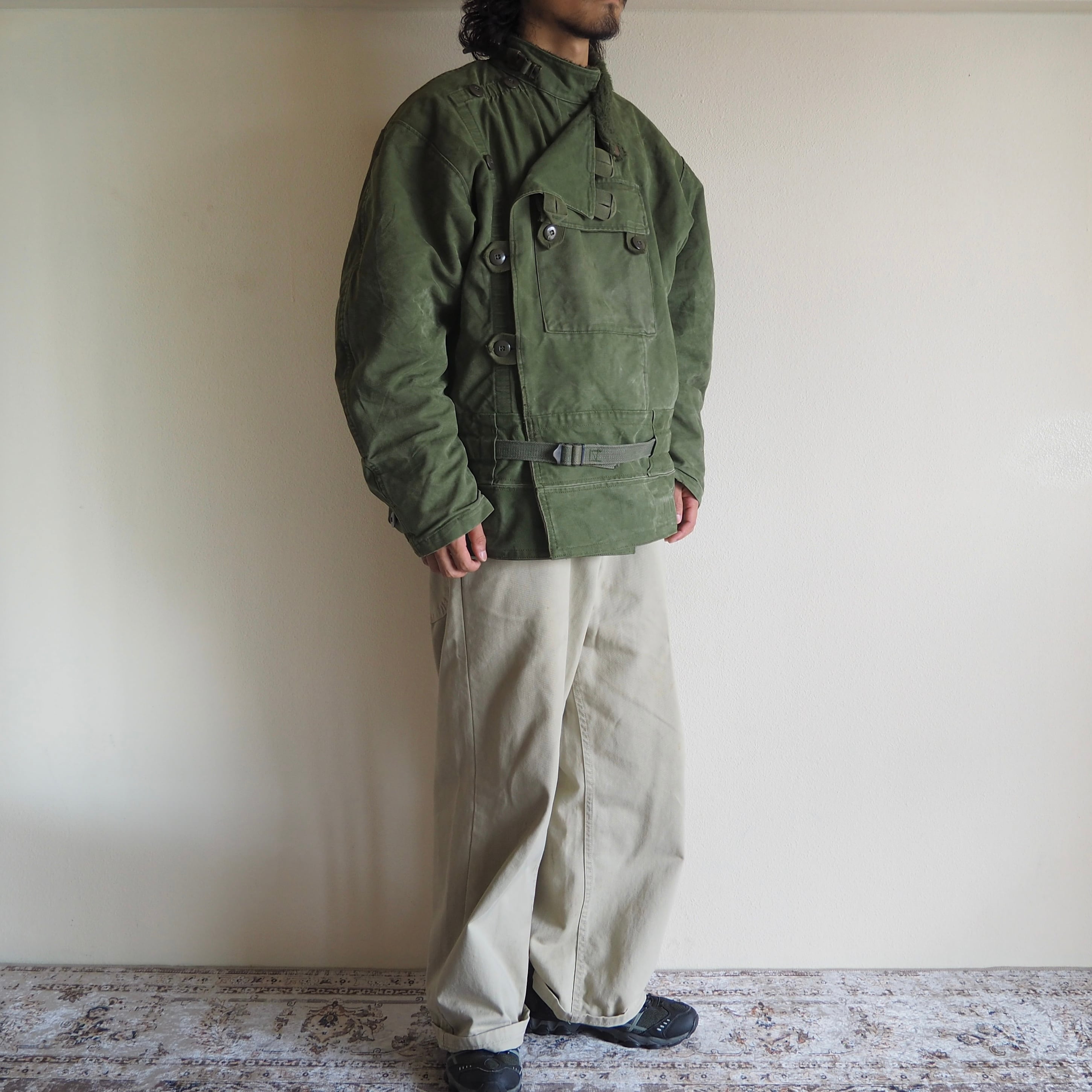 通常のスウェーデン軍のモーターサイクルジャケットは着丈が短く、ボックス型のシルエットがその特徴。しかし本個体はウエストベルトの下に生地が足されており、通常モデルに比べるとやや長めの着丈となっております。