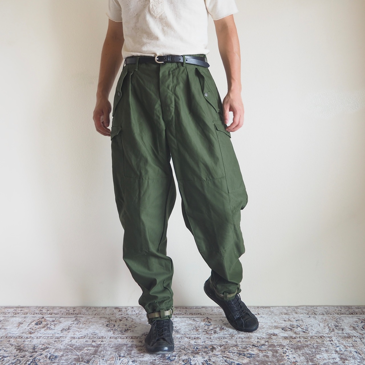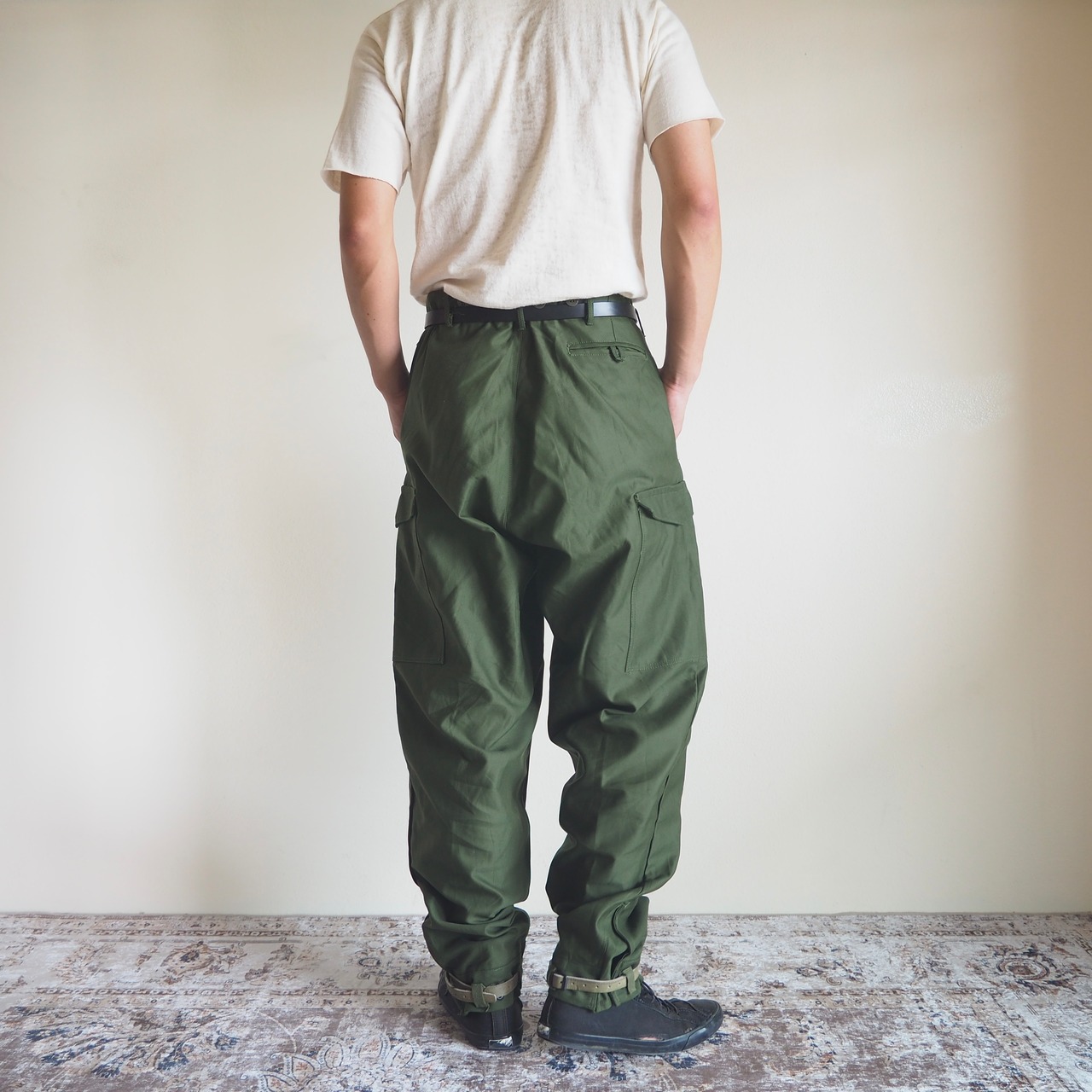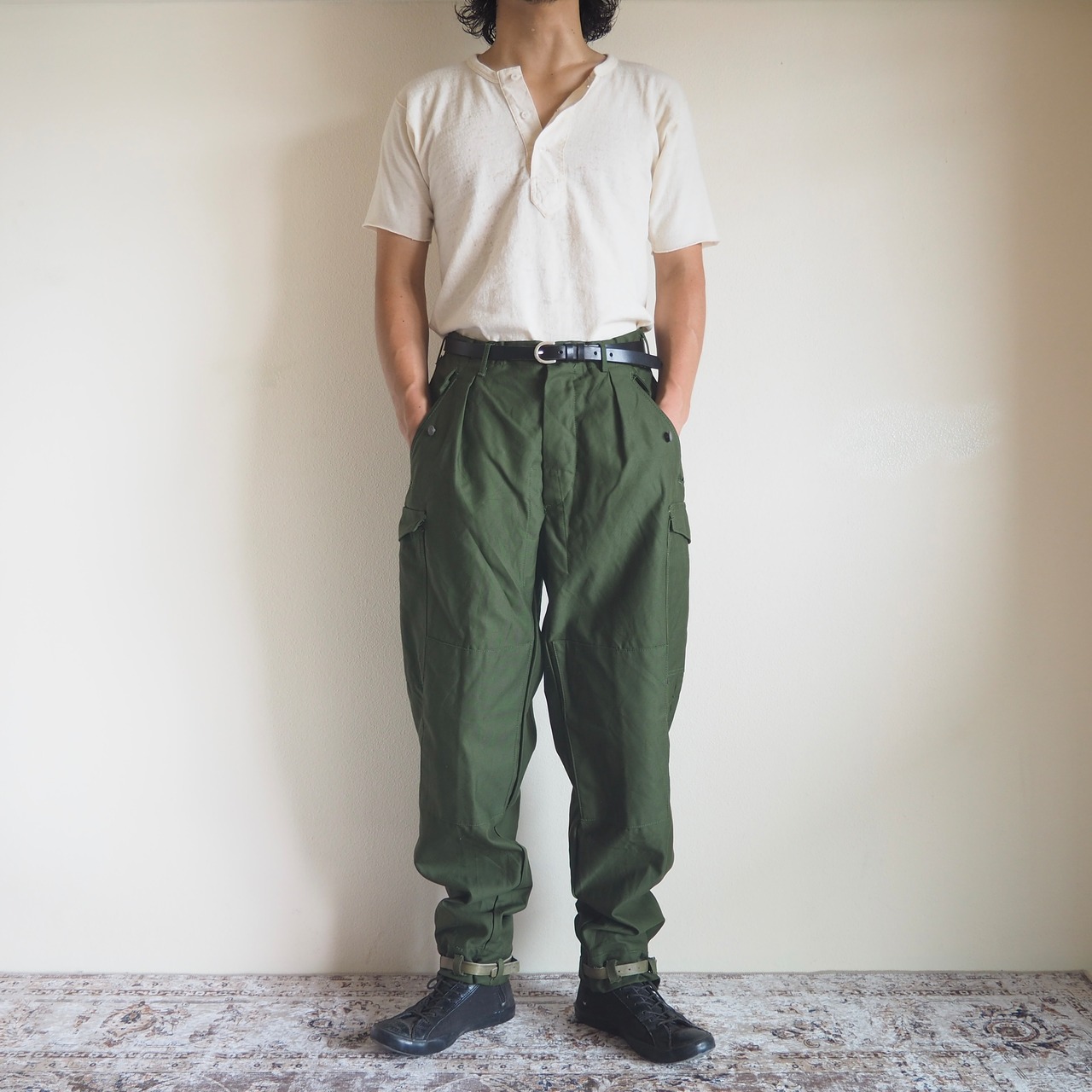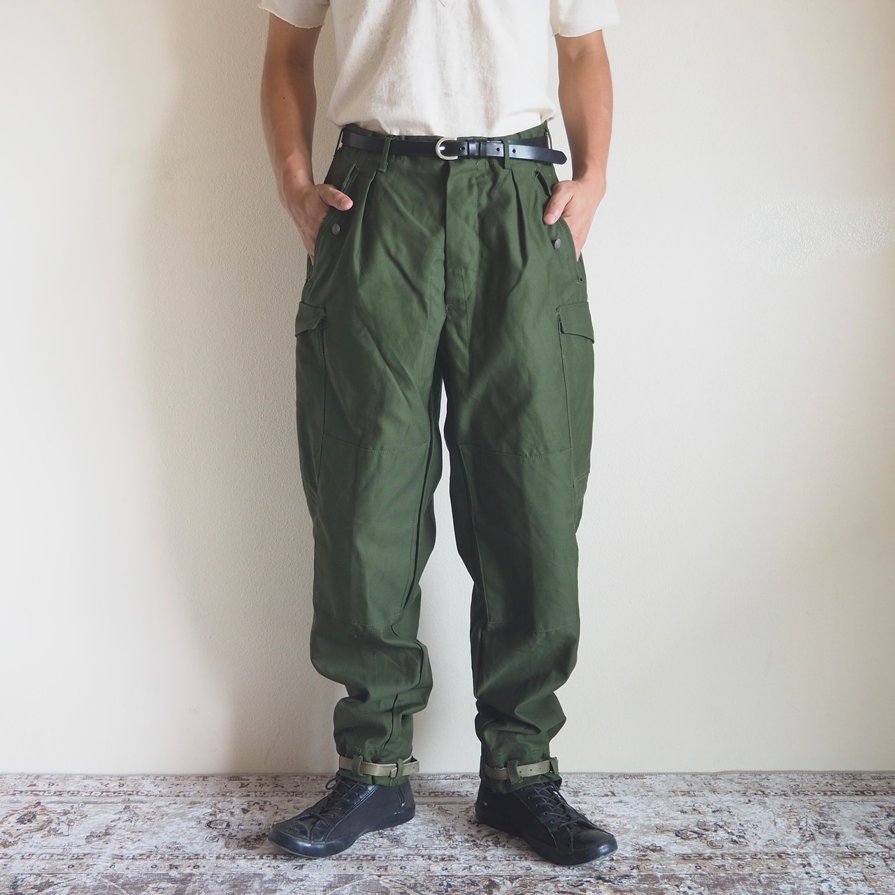 スウェーデン軍独特のグリーンカラーとレザーベルトの付属した裾が特徴的な一本。今回はデッドストックでの提案となります。