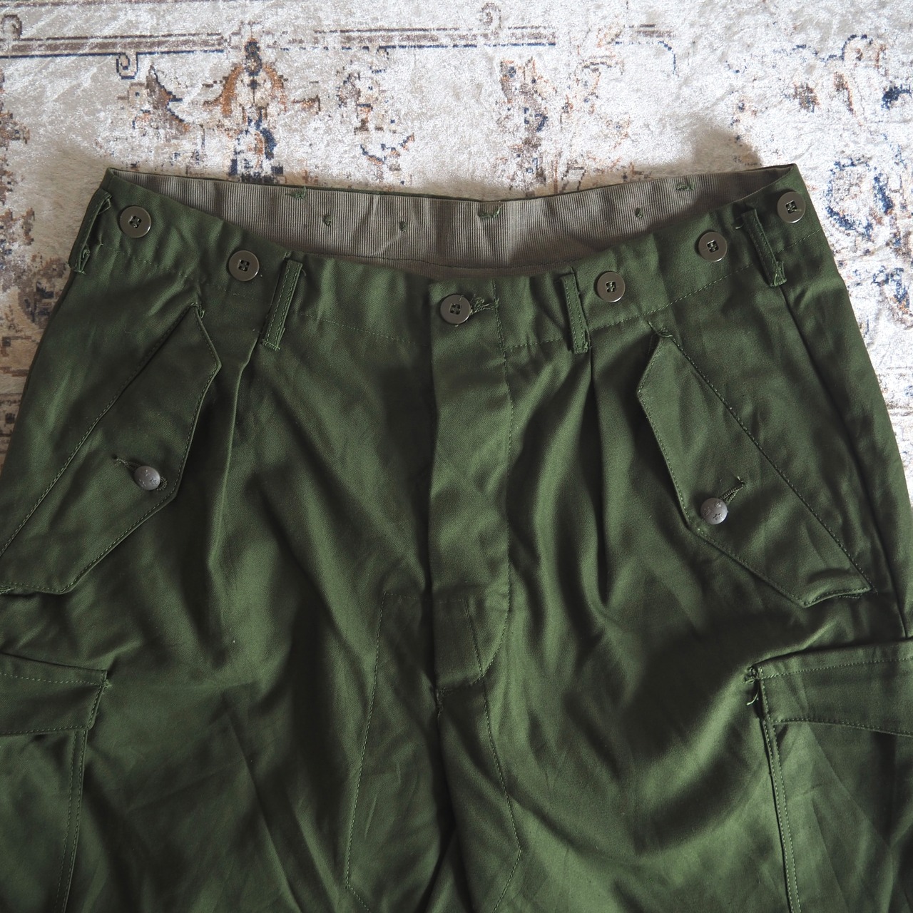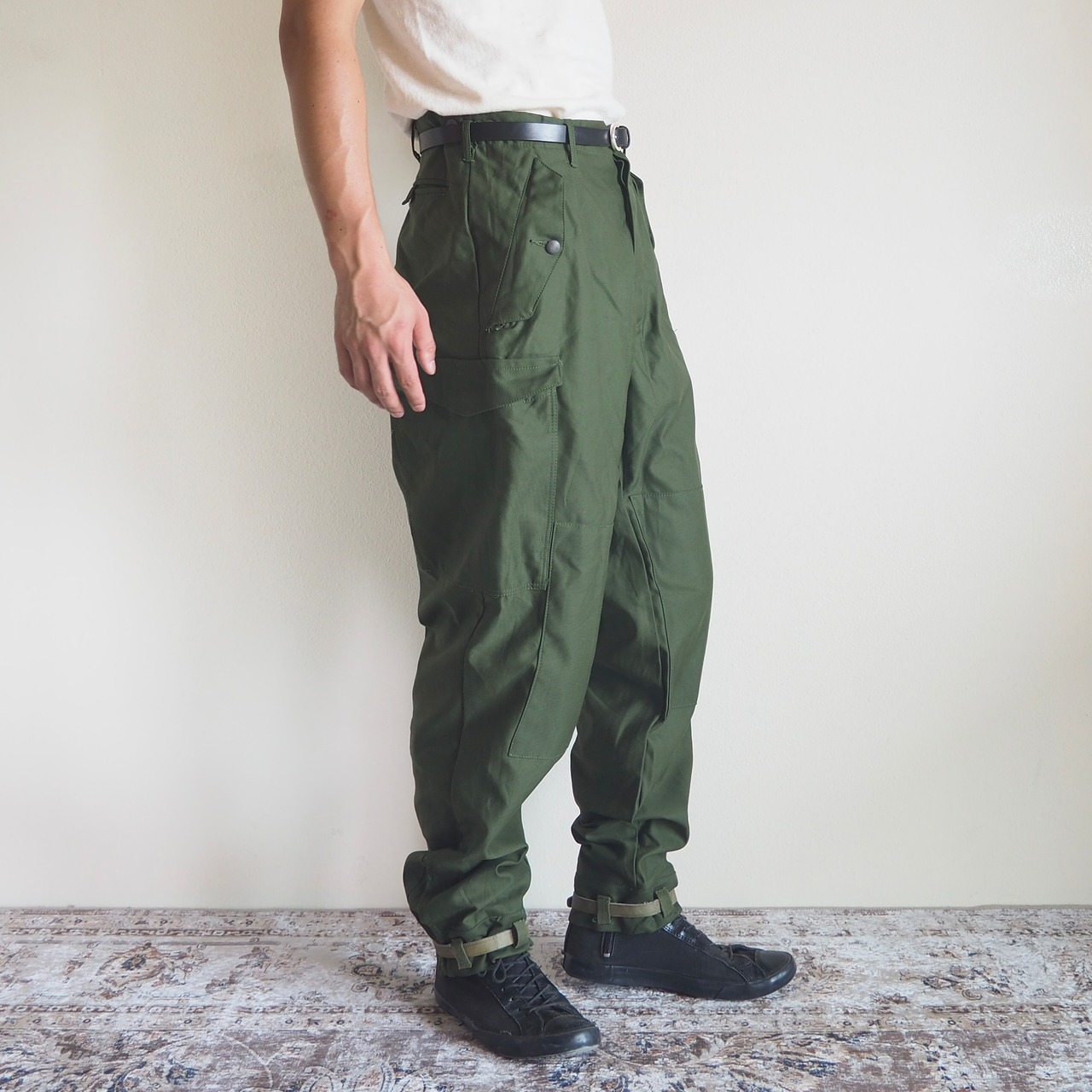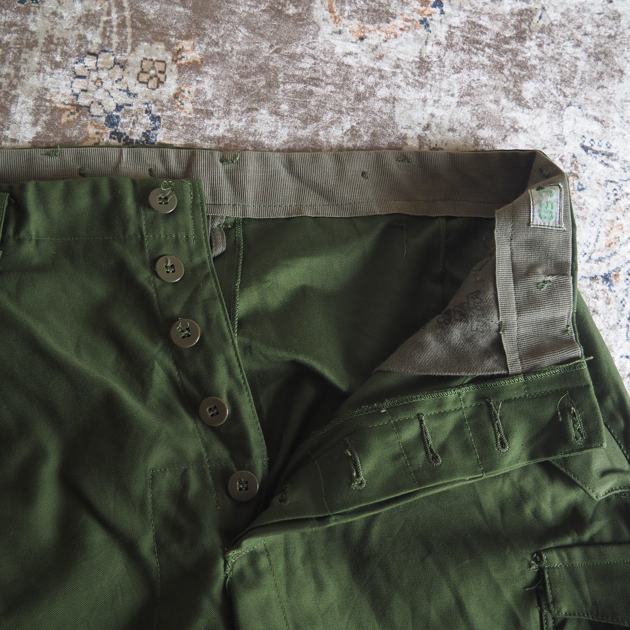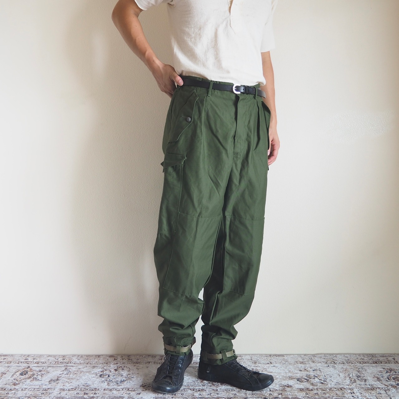 スウェーデン軍独特のグリーンカラーとレザーベルトの付属した裾が特徴的な一本。今回はデッドストックでの提案となります。