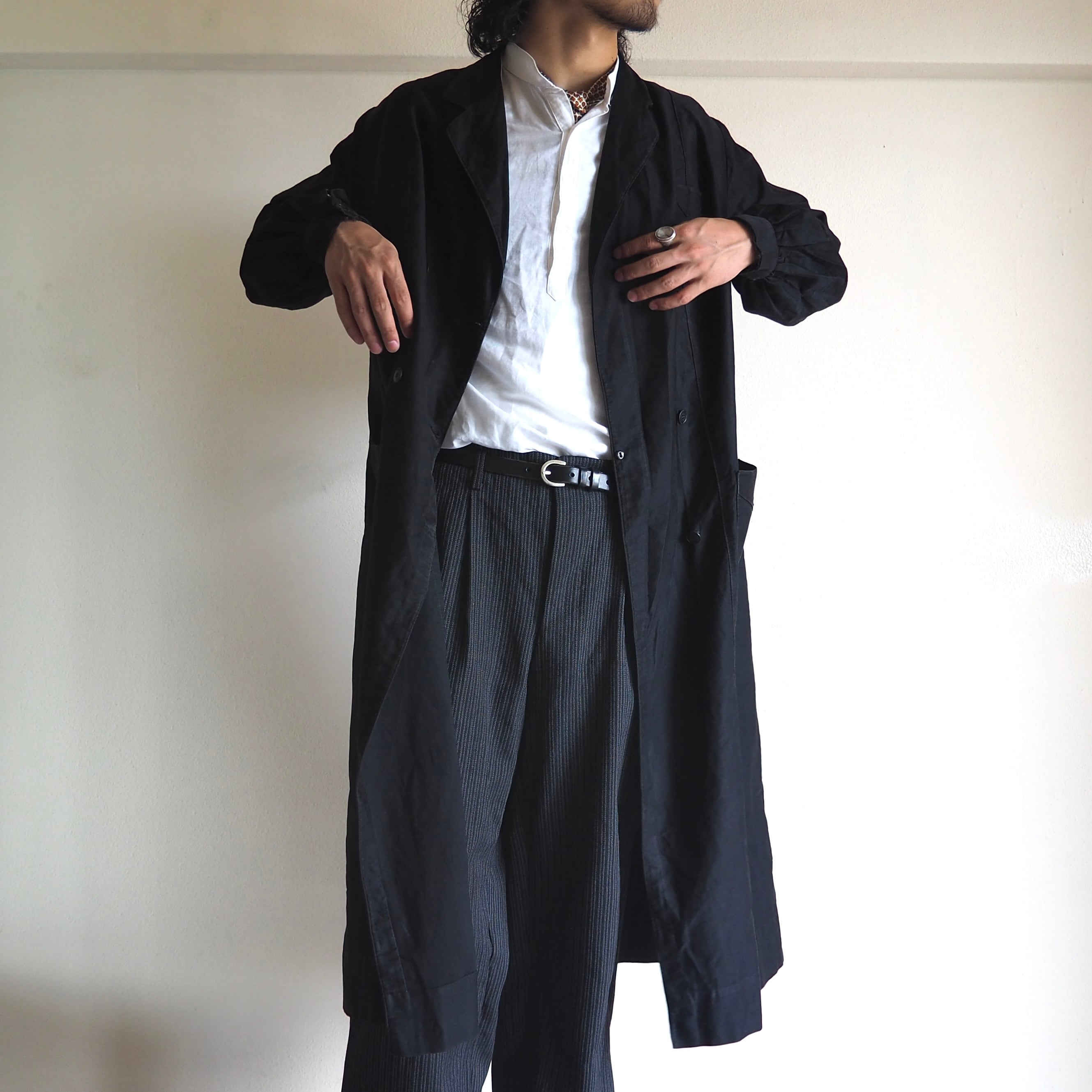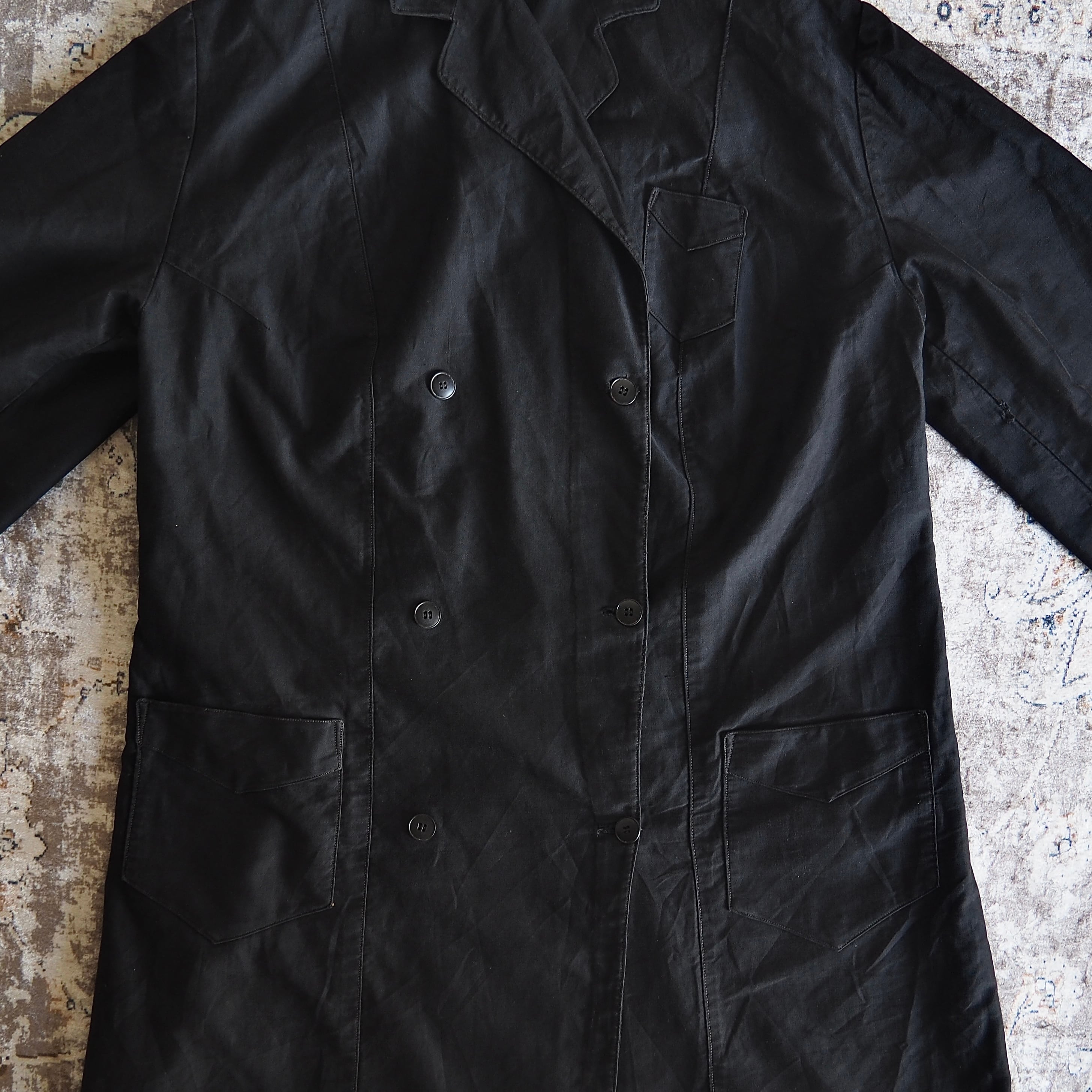 ライトオンスのブラックモールスキン生地を使って作られたワークコート。当時は仕立屋や裁縫師などの服飾関係、教職などに従事する方々を主に着用されていたそうです。