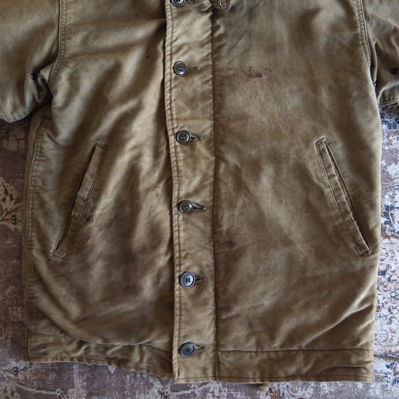 タグの表記が消えてしまっているため定かではございませんが、サイズはおおよそ "38" 程度であると思われます。男らしく、ザックリと羽織っていただけるサイズ感です。