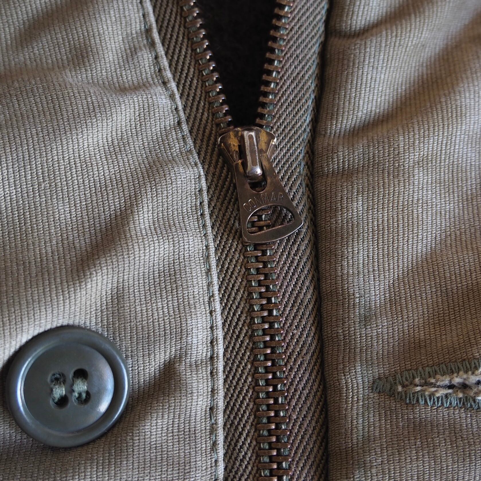 フロントは風の侵入を防ぐための、ジッパーとボタンの二重構造。グローブを付けたままでも開閉しやすいようにと大きめのボタンが付属しております。フロントには三大ジップメーカーが一つ "CONMAR" 社製のブラスジップを採用。
