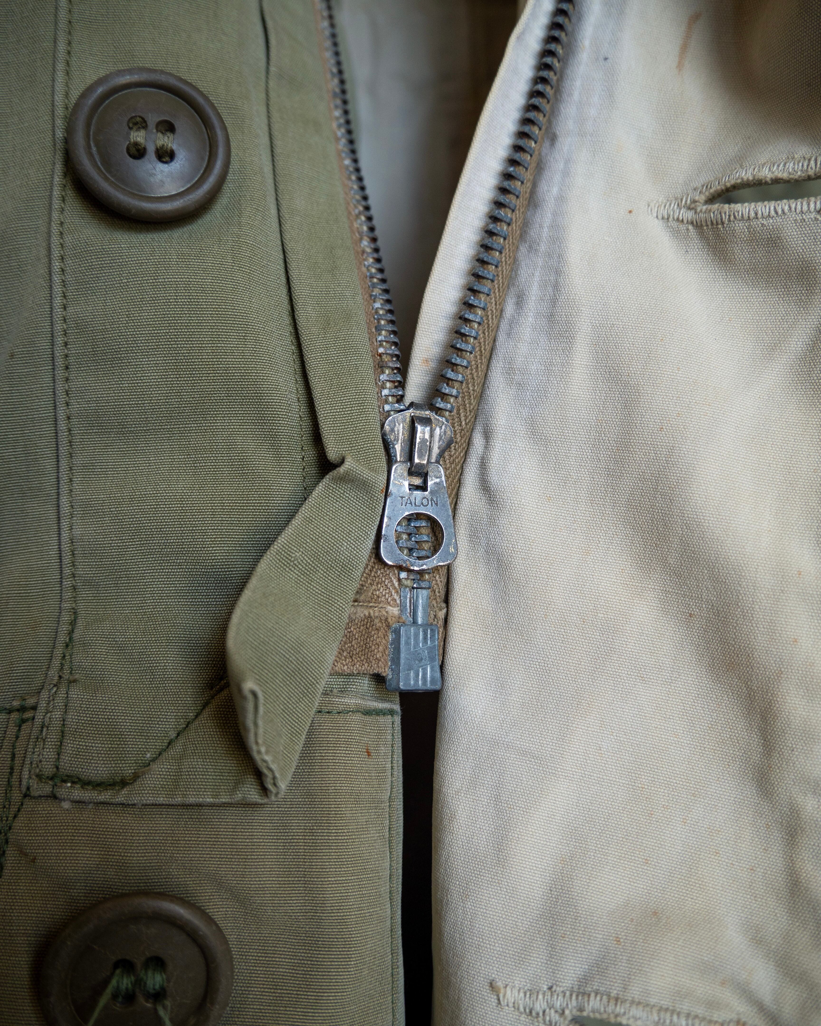 フロントは風の侵入を防ぐためのジッパーとボタンの二重構造。フロントジッパーには1893年に世界で初めてファスナーを開発したアメリカの高級ジップメーカー "TALON" 社製ベル型ジップを採用。フロント下部にはスナップボタンも付属しているため遮蔽製は抜群です。