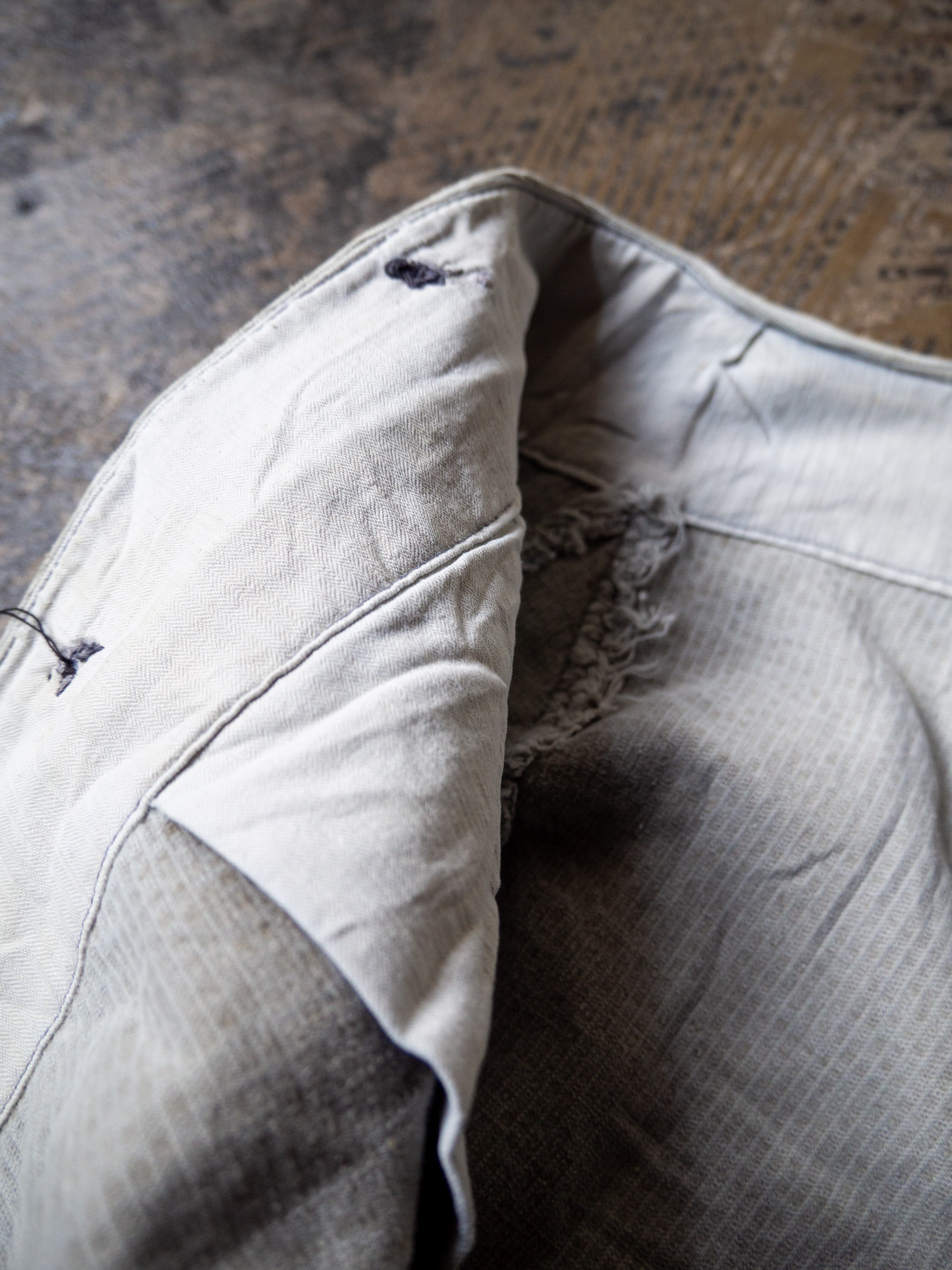 珍しいオフホワイトのようなカラーリングに、雑にカットオフされた裾先、経年によりやれた表情が最高にモード。