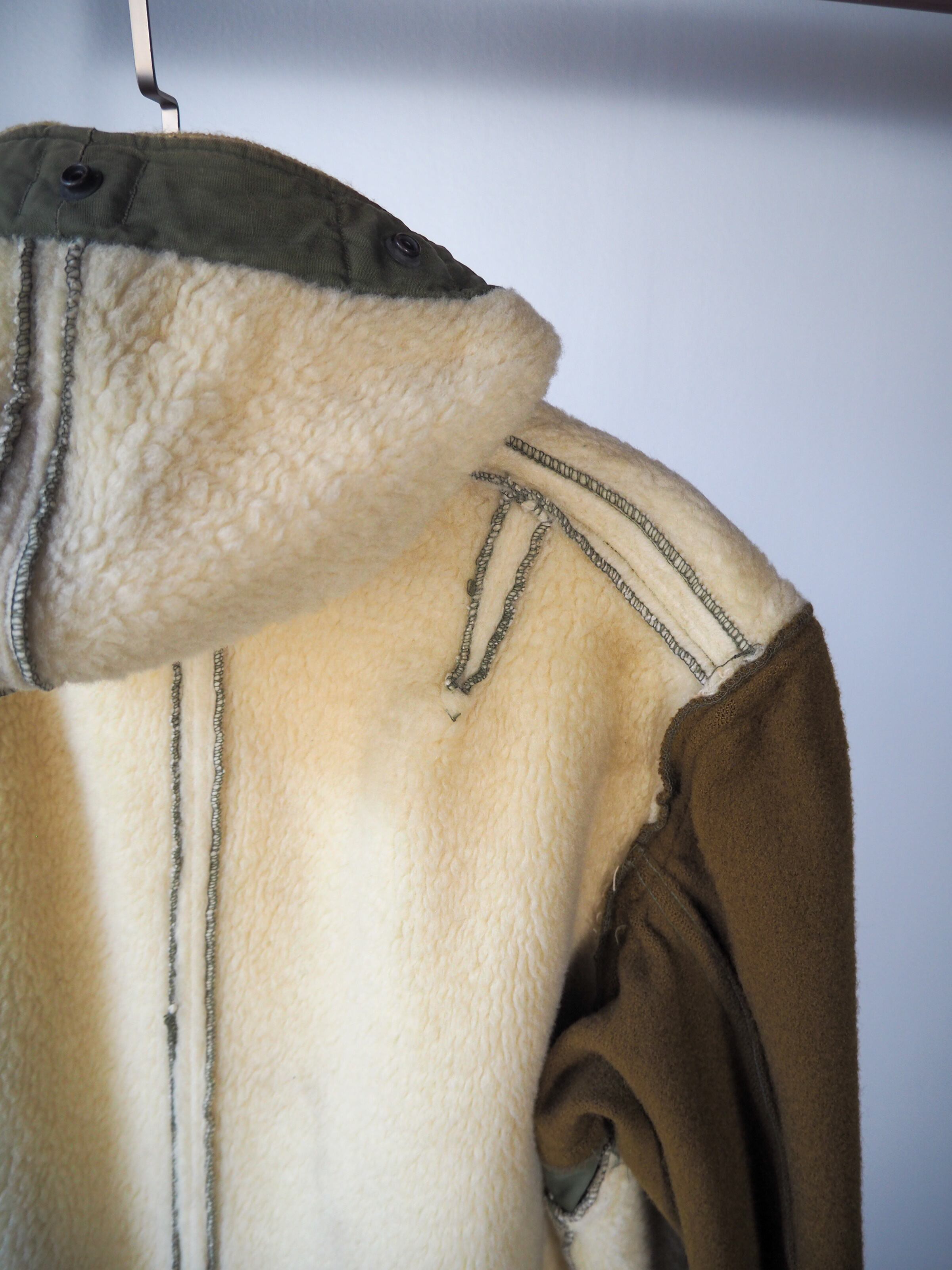 ODグリーンカラーの高密度に織り込まれたコットン100%のシェルに内側にはウールライナー。このライナーがまた秀逸でして、アイボリーカラーのモコモコと立体感のあるウール生地にアームの切り返し。ライナー単体でも服として成立してしまうほど優れたデザインです。