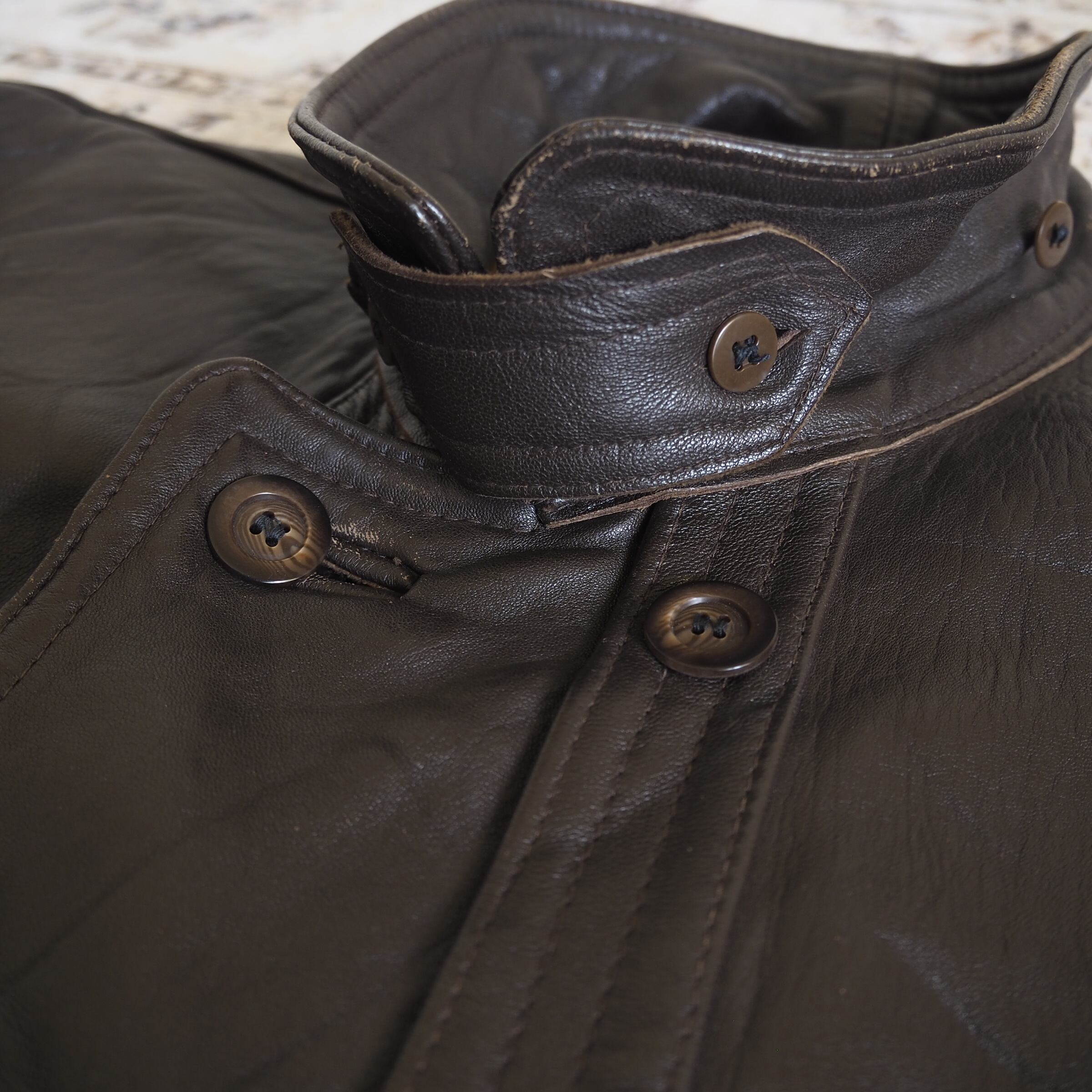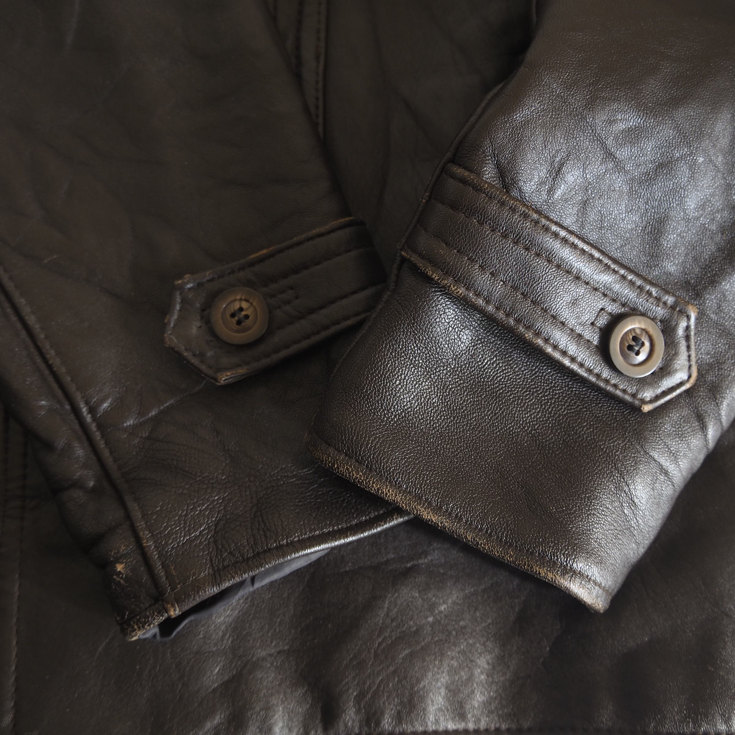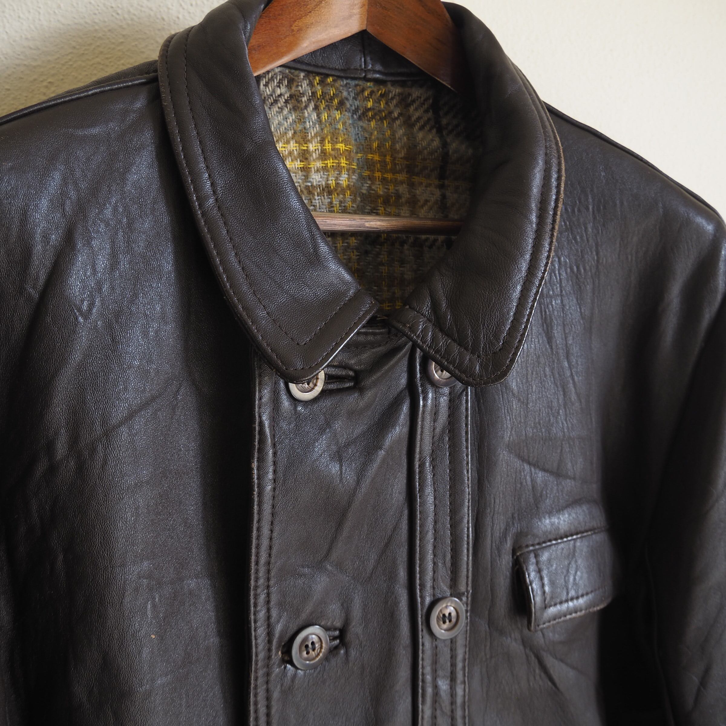 鈍い光沢を孕んだレザー生地は程よく使い込まれ、柔らかさが出始めているためコルヴィジェジャケットにありがちな「ボタンの通しにくさ」によるストレスは一切ございません。