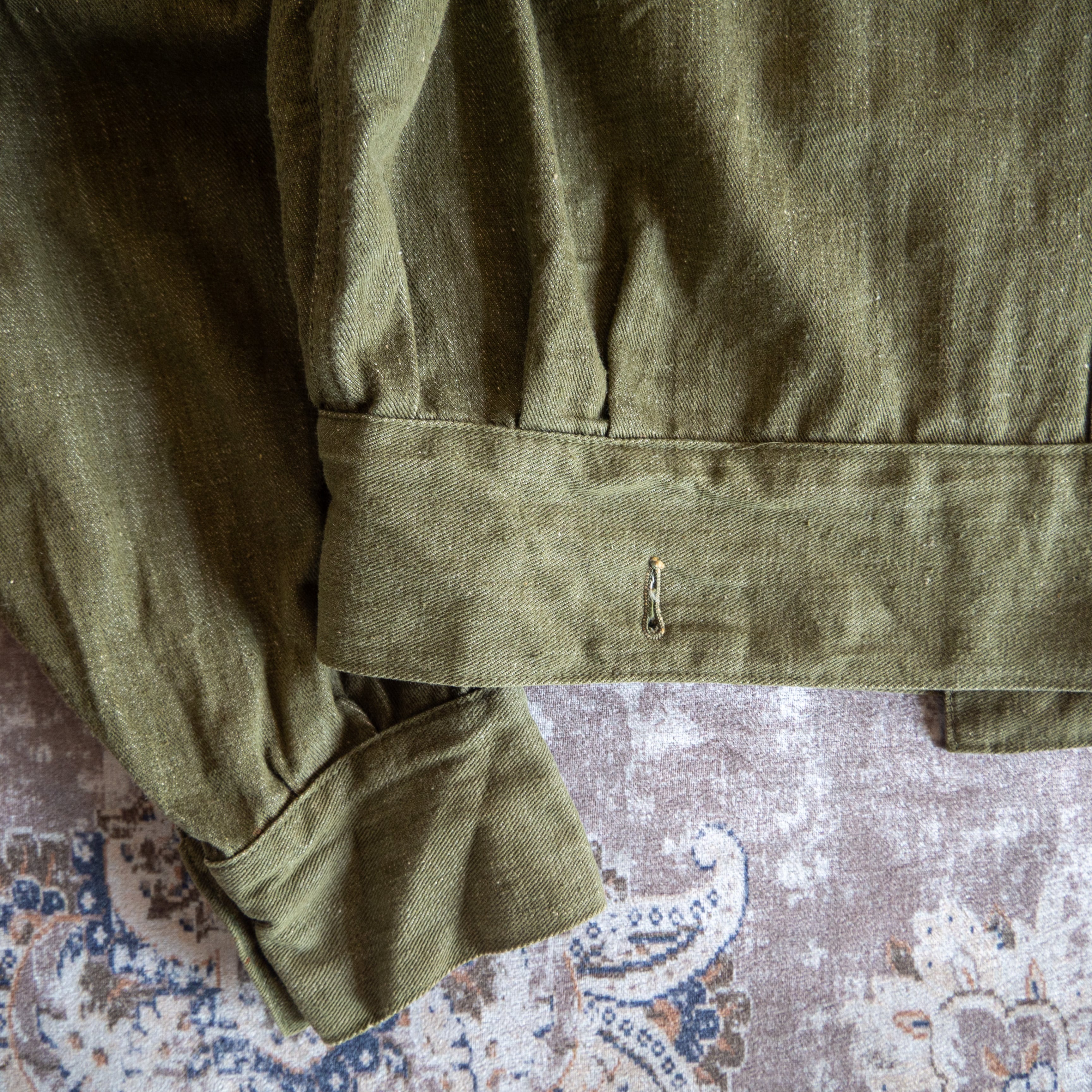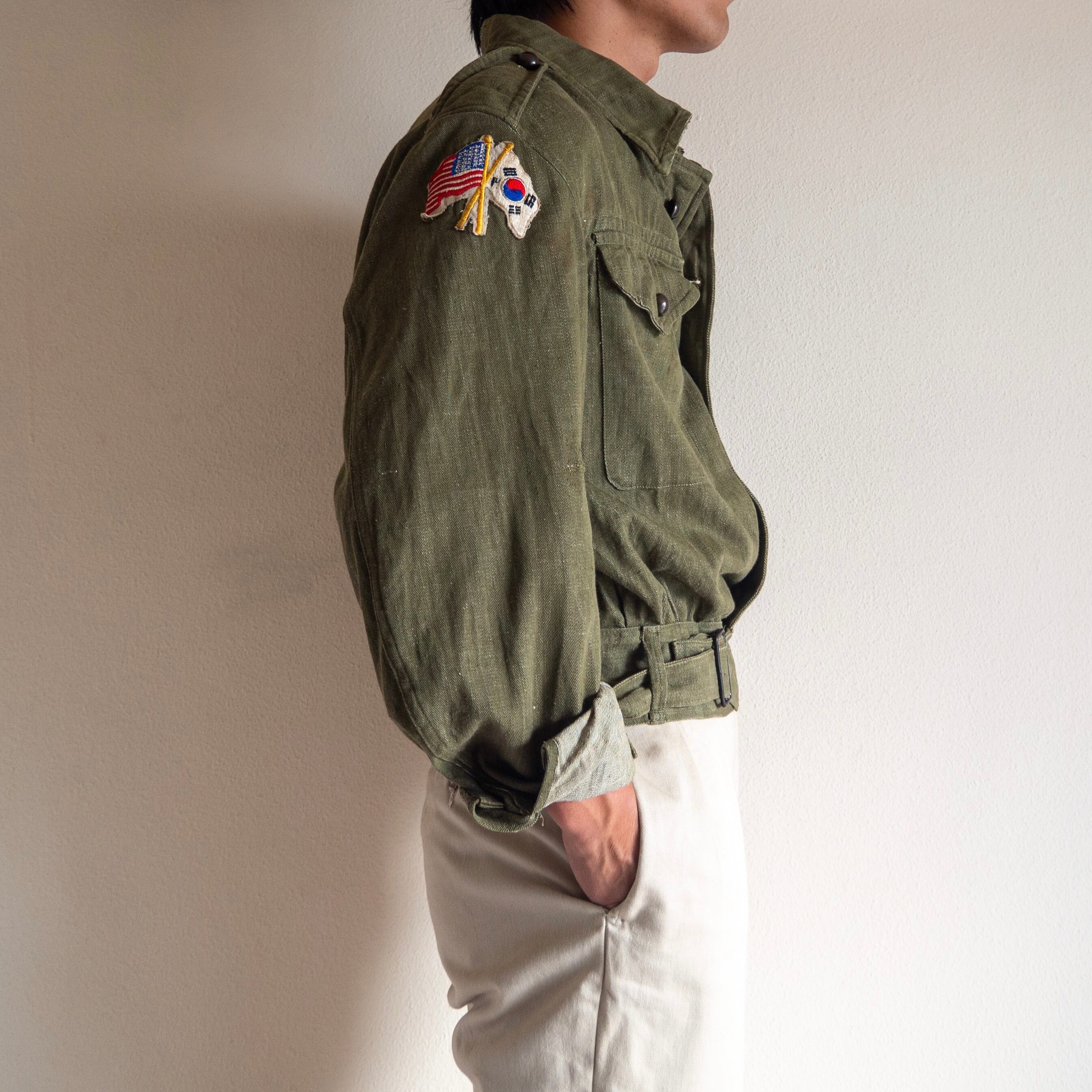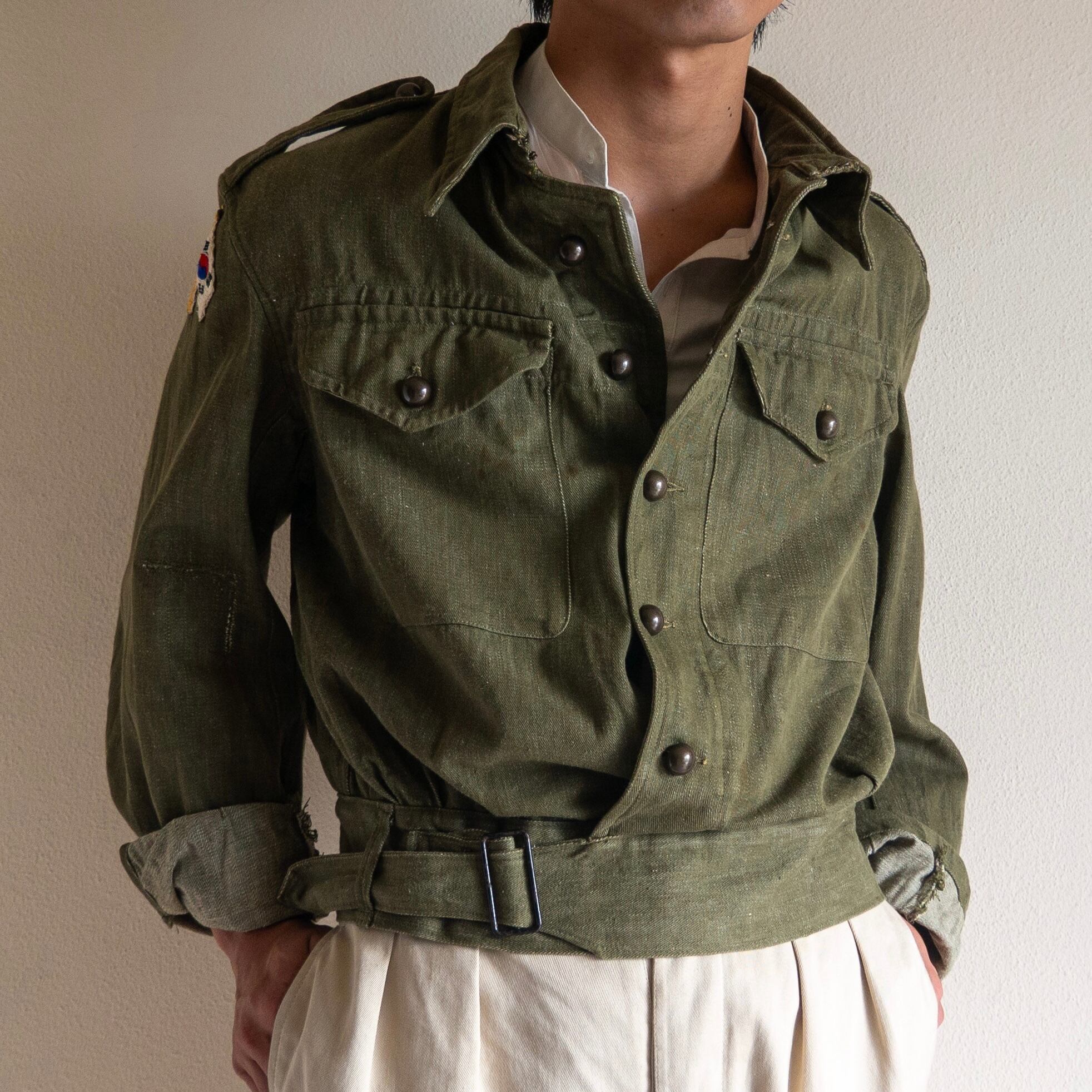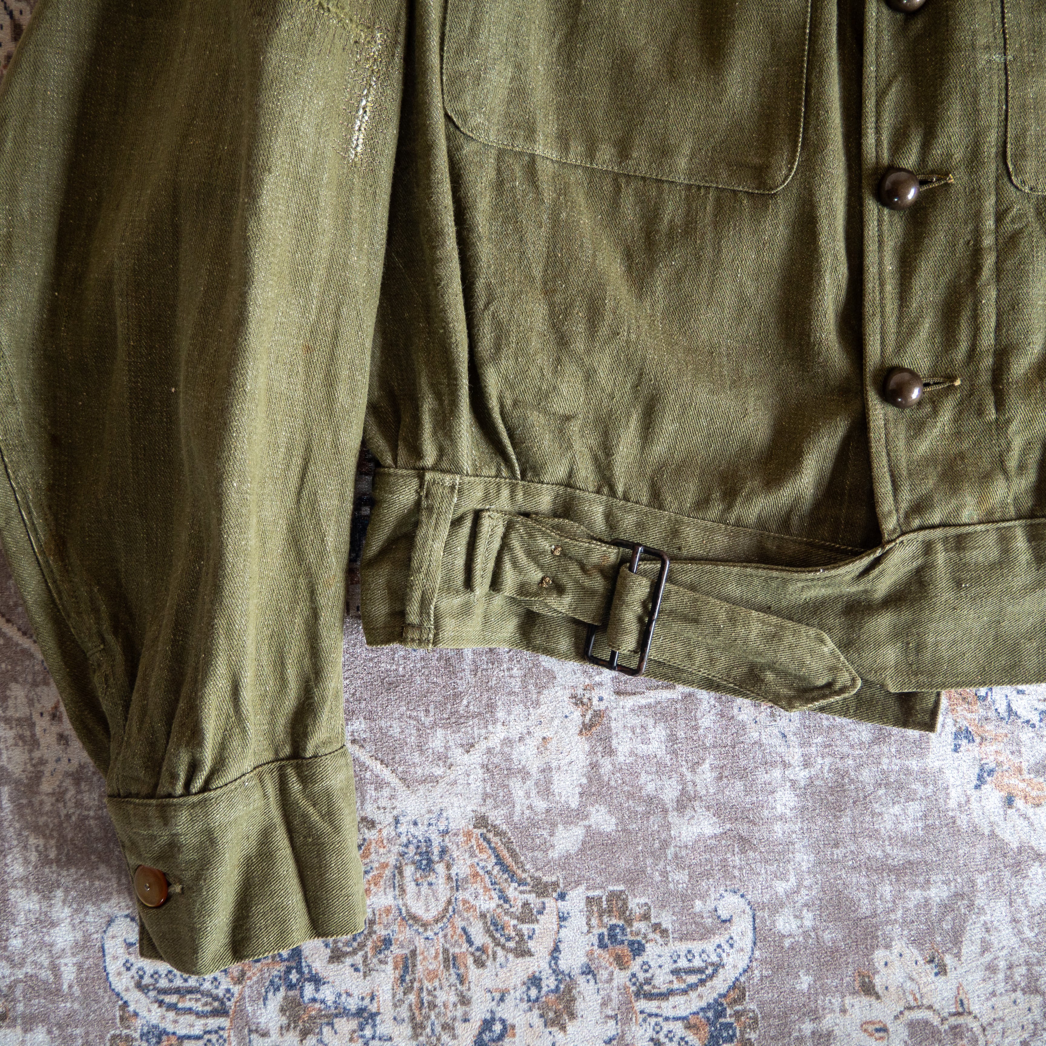 同型のウールタイプ素材のものも有名なジャケットですが圧倒的に希少なタイプがこのグリーンデニムを採用したモデル。戦場では不向きとされたデニム素材を使用したためその生産期間は短く、市場にも中々出回ることのないコレクタブルな1着です。