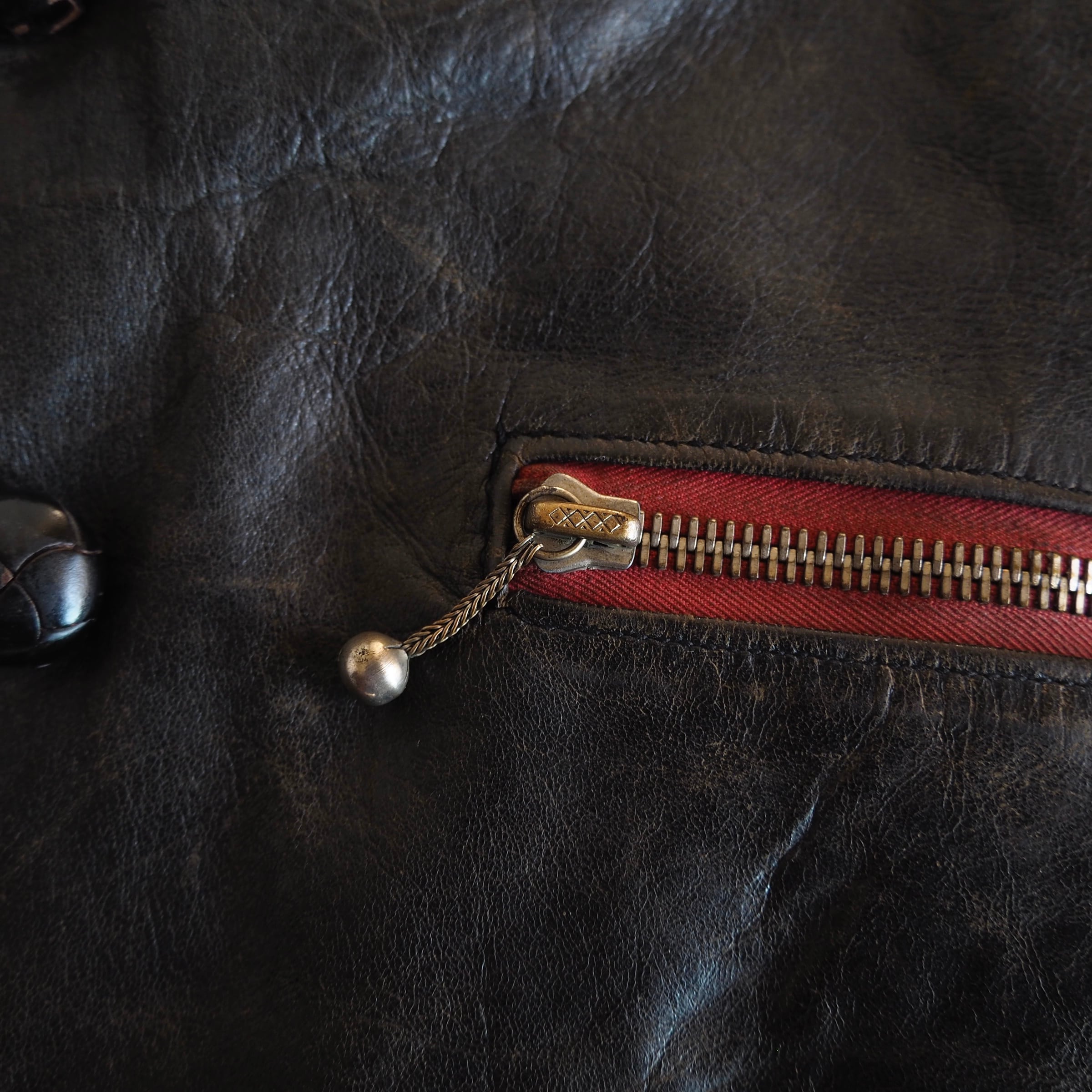 肩には赤と黒、2本のレザーを交互に編み込んだなんとも洒落の効いたレザーエポレットが付属。四つのポケット、両リブのジッパーには非常に加工難易度の高い、目の細かいボールチェーンジップが付属しております。