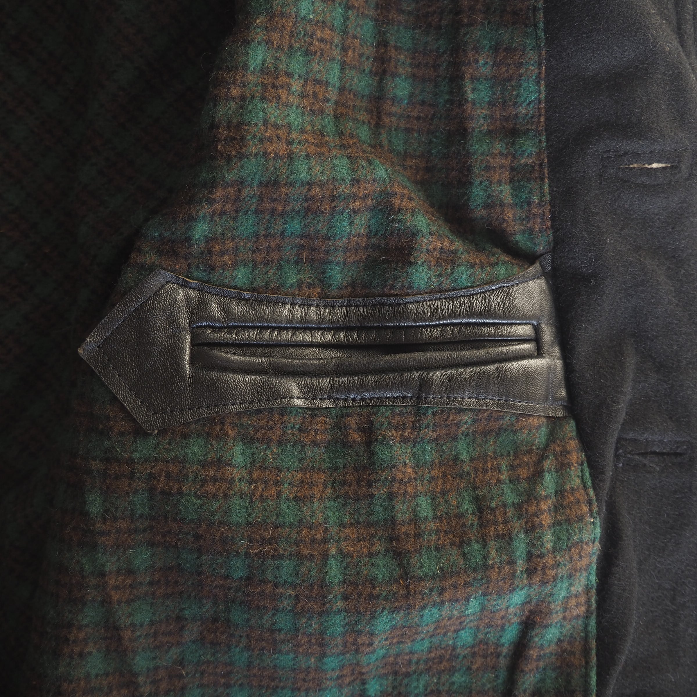 裏地には上質なフランネルウールが採用されており防寒性、保温性には文句の付けようがございません。赤と緑から成る、落ち着いた色味のタータンチェックはクラシカルかつ上品な佇まい。ボタン裏、ボタンホール裏はブラックカラーのウール生地で切り返されていることによって、密閉感が強まり更なる保温性の向上が図られております。