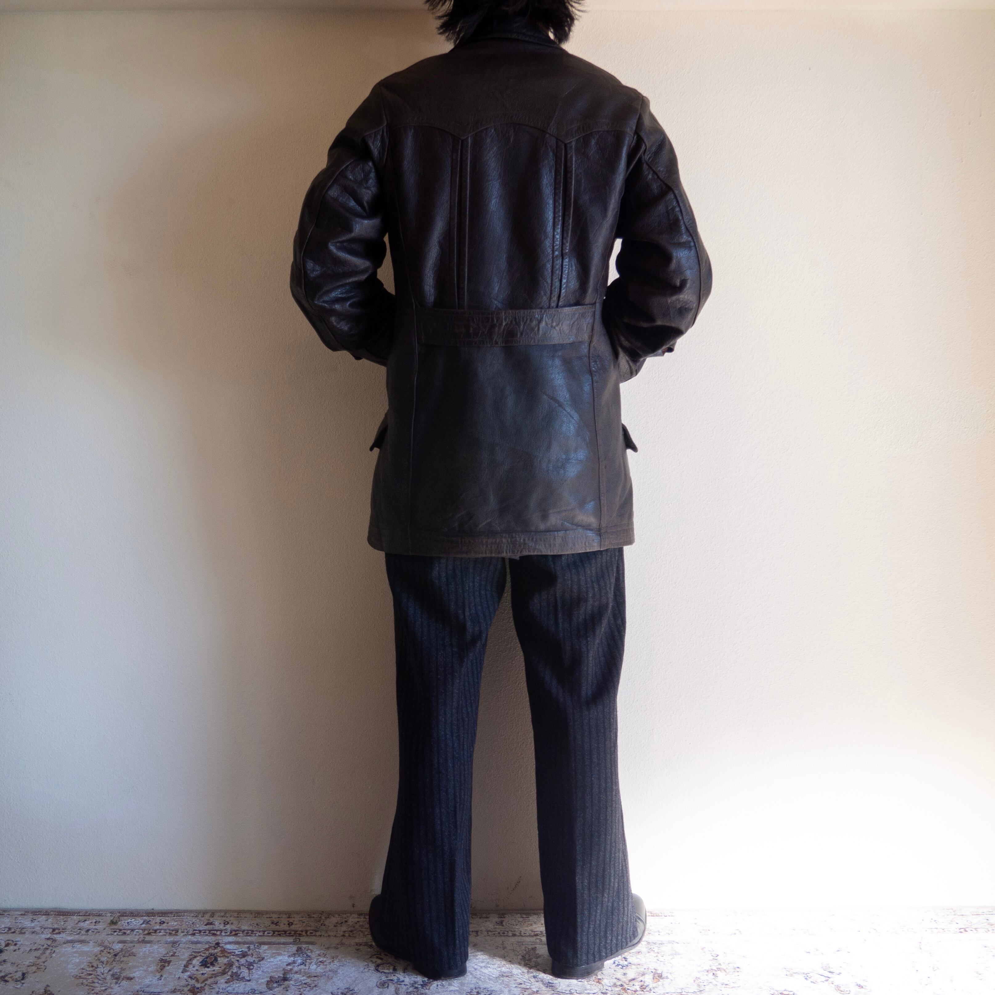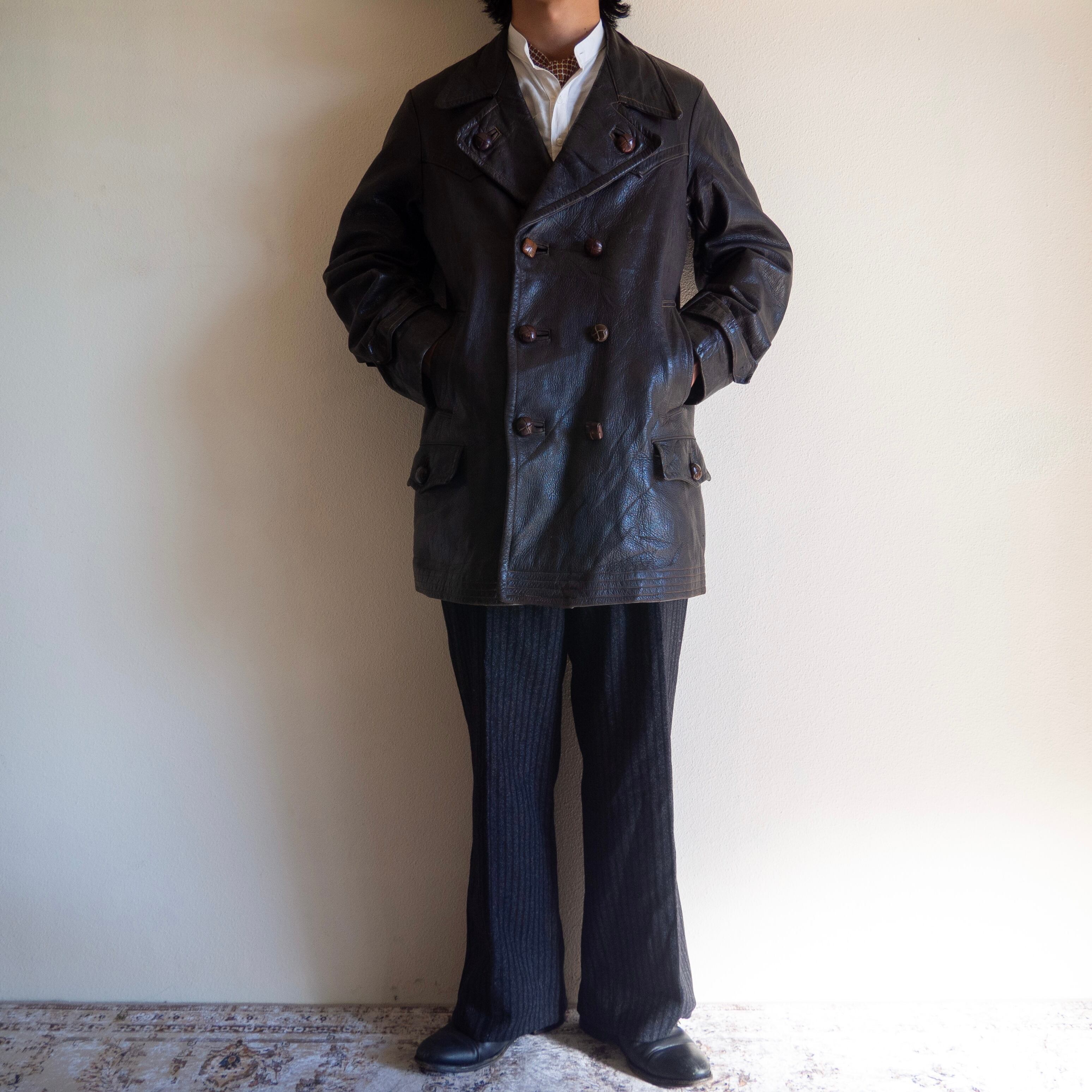 サイズはメンズのXLほどに該当するかと。どっしりと分厚く、存在感抜群の牛革のレザーボディは着用により程よく柔らかくなっておりますので、スラックスにスカーフやネクタイ等と合わせていただけますと意外とサラッと着こなしていただけるかと思います。