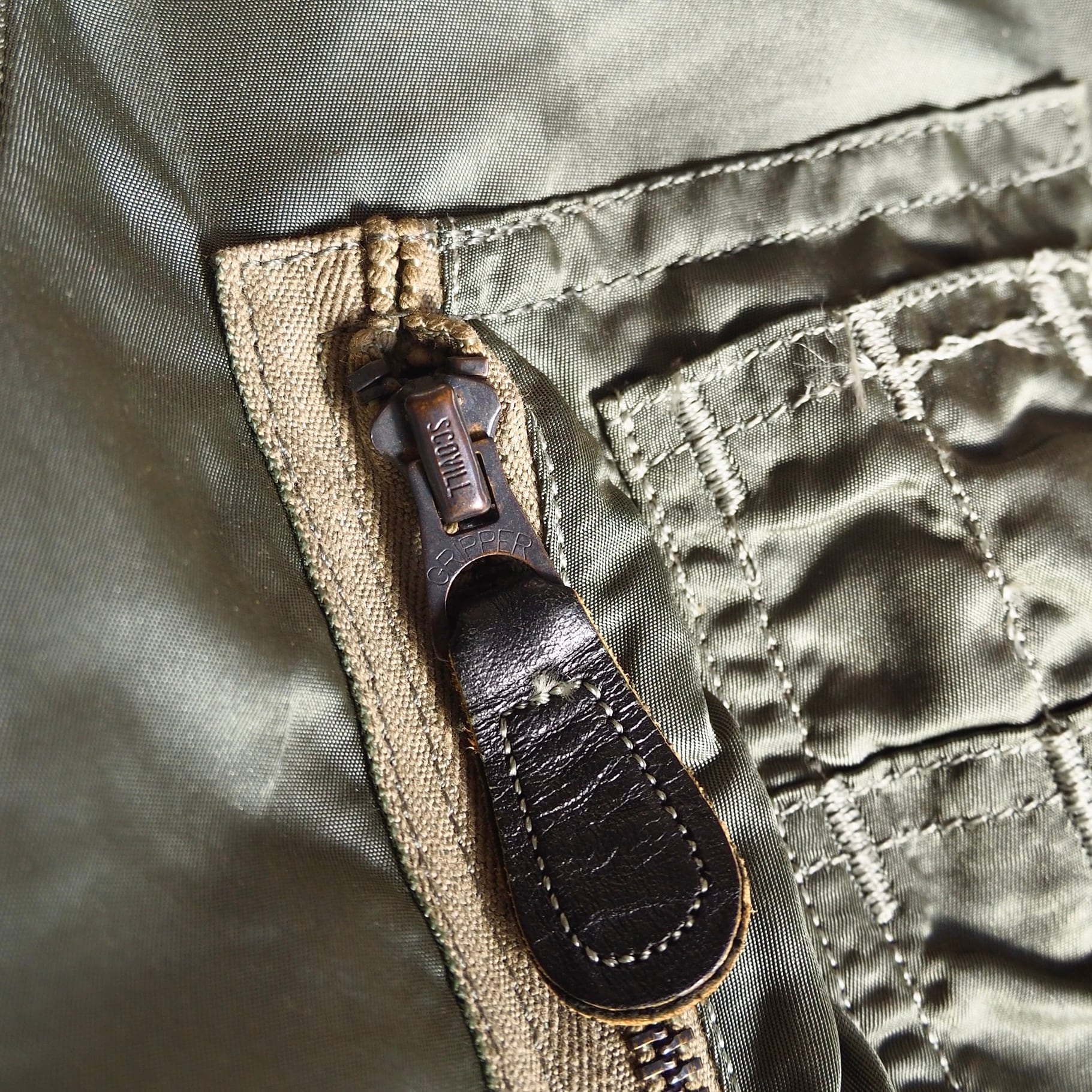 左右のフラップボタン付きのポケットはジャケットの上からでも内部にアクセスすることができる貫通ポケットとスレーキ(内袋)付きポケットから成る二重構造。フロントはグローブをはめたままでも開閉可能な大きめのボタンと"SCOVILL"社製のジッパーが付属する防風性に非常に優れた仕様です。