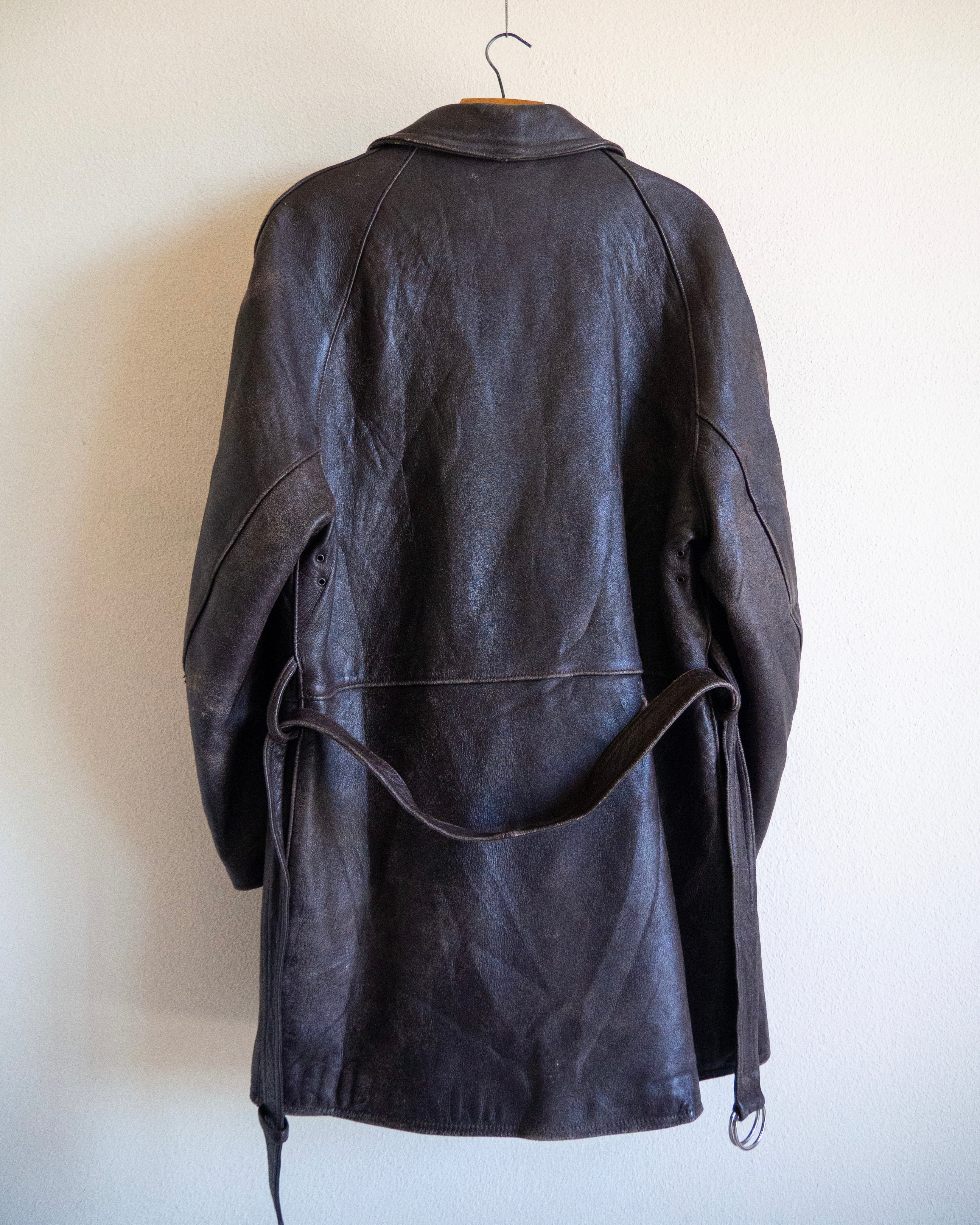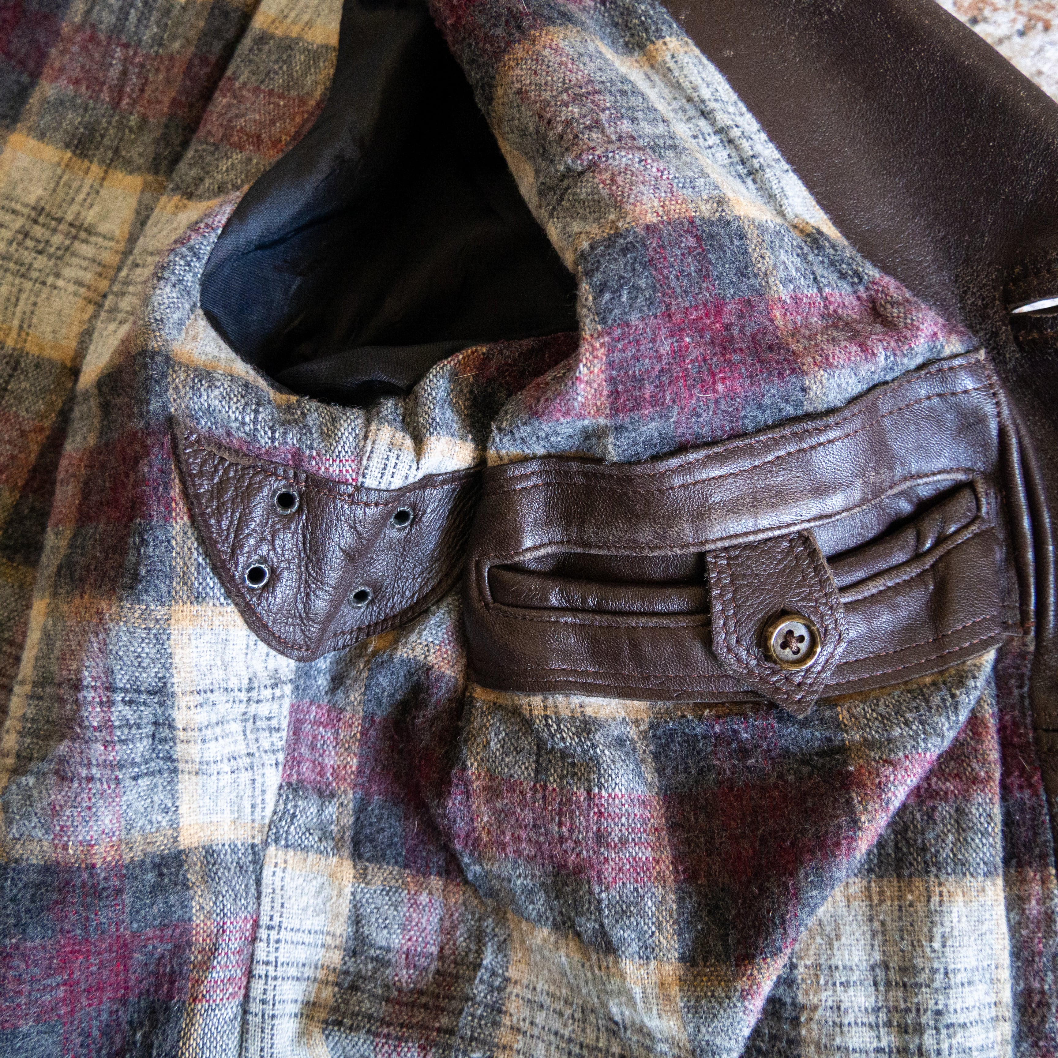 経年によりスレ、アタリのでた雰囲気抜群のレザー生地にシンプルながらも意匠仕様が効いた秀逸なデザインセンスが光る1着。