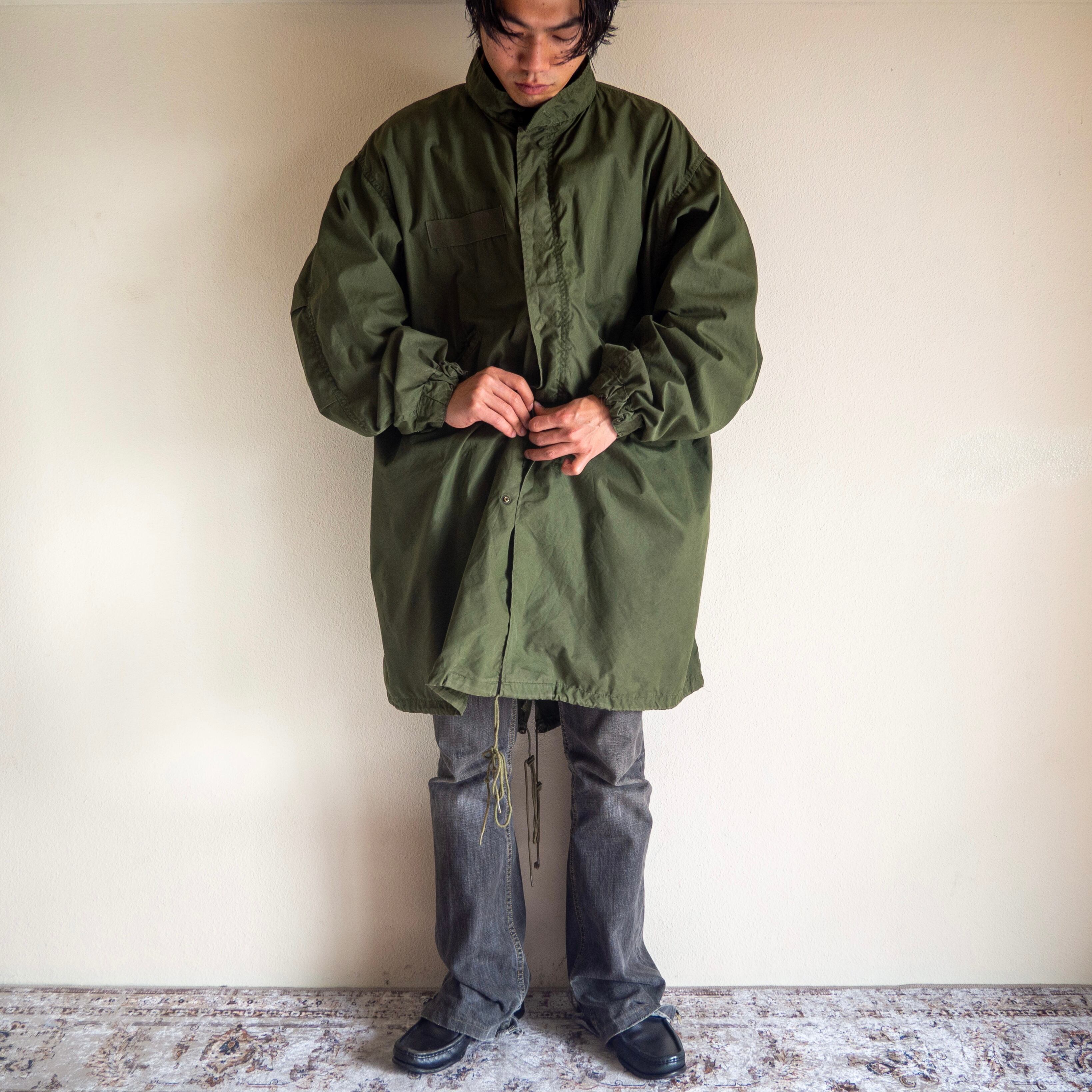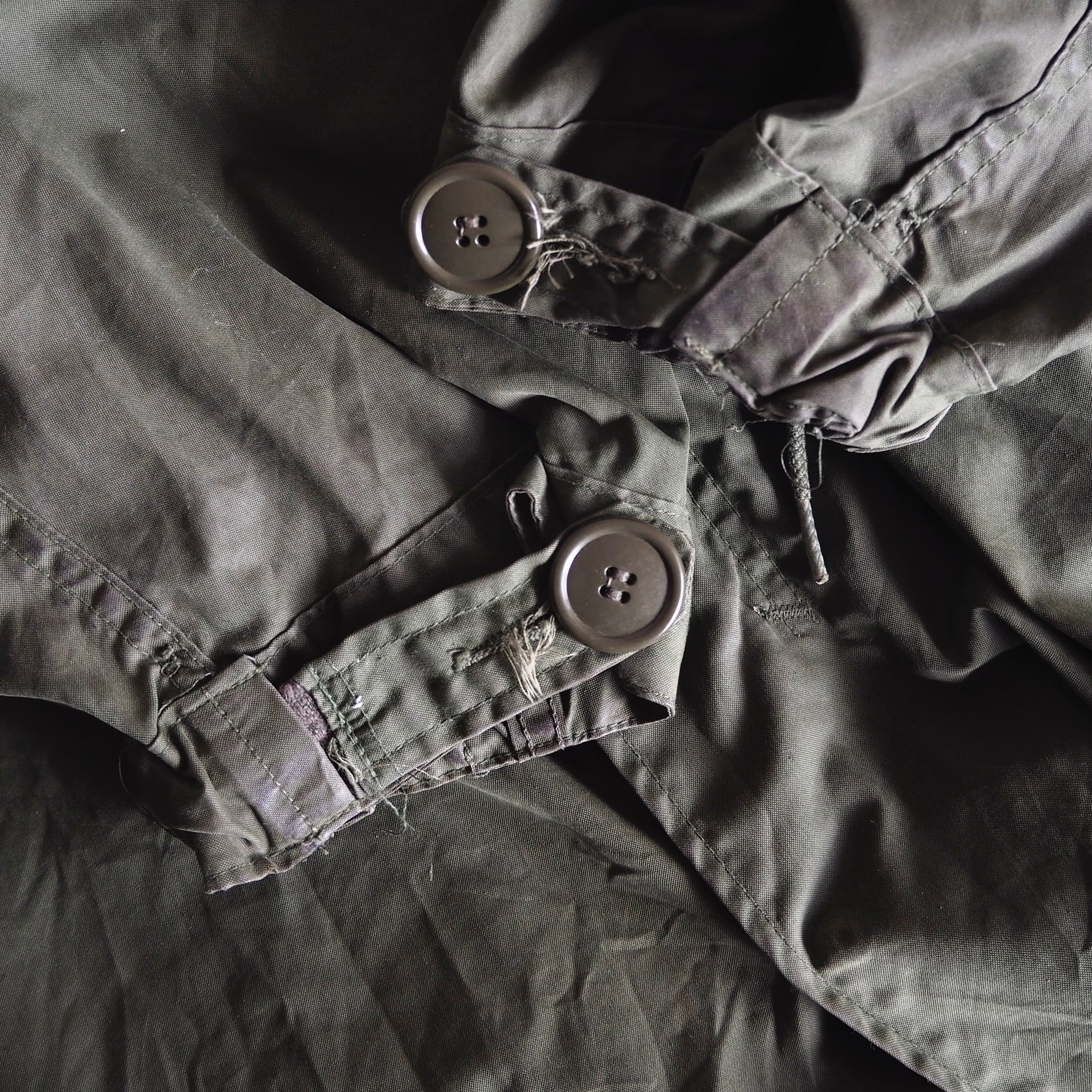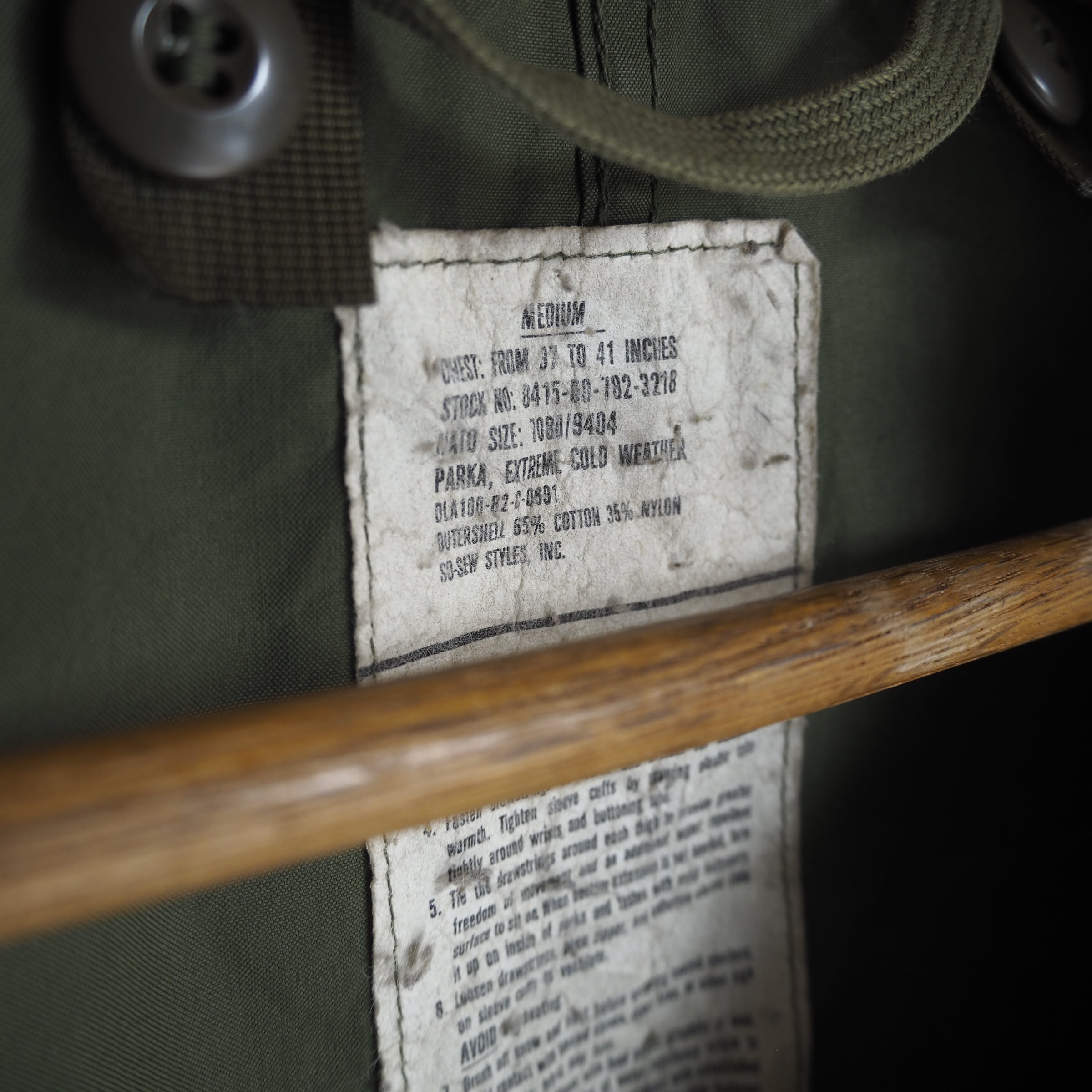 極寒地での戦闘や移動を想定して作られたこちらのパーカー。中にたくさん着込めるように、広めにとられた身幅とアームホールやウエストについたドローコードなど厳しい寒さから身を護るためのディティールが満載です。
