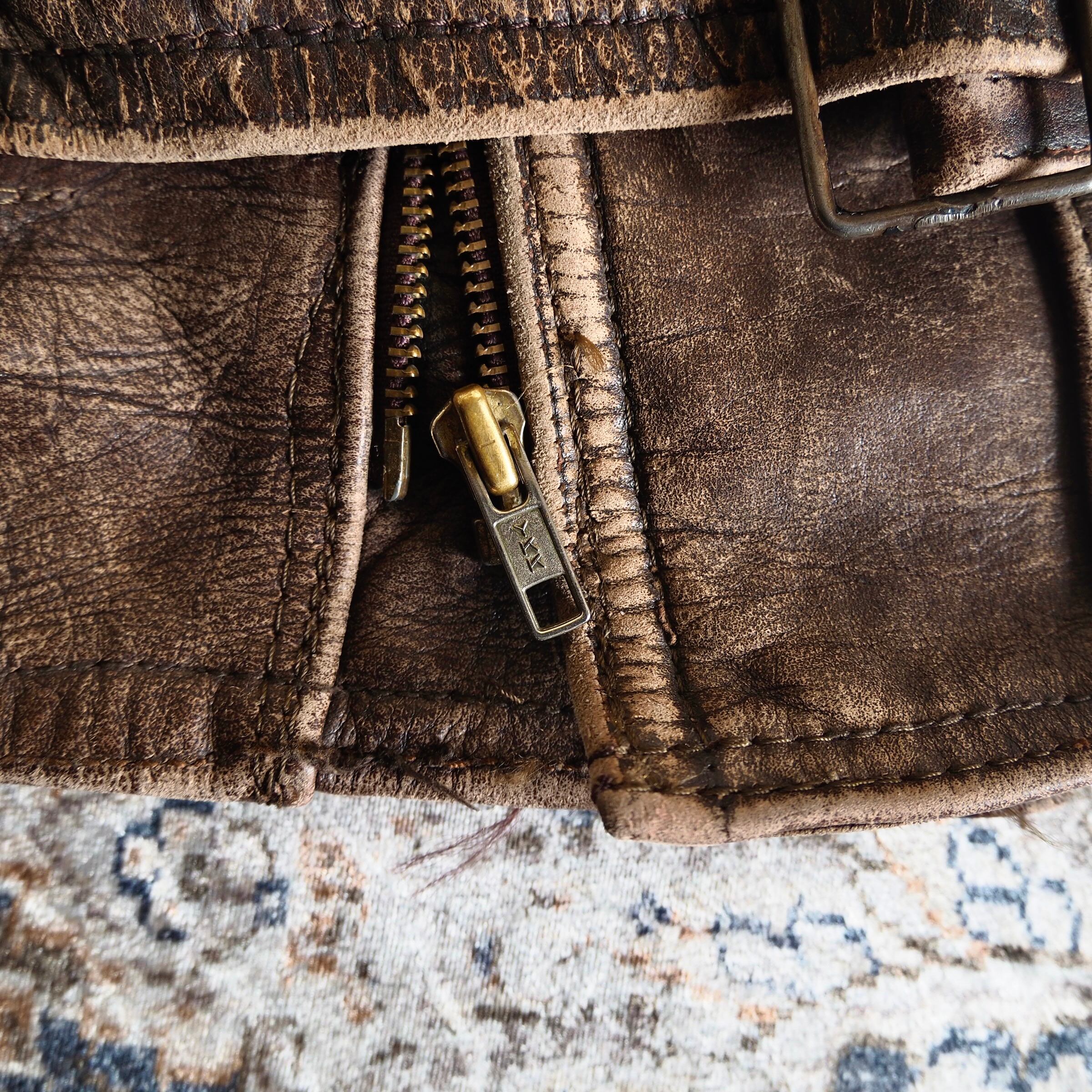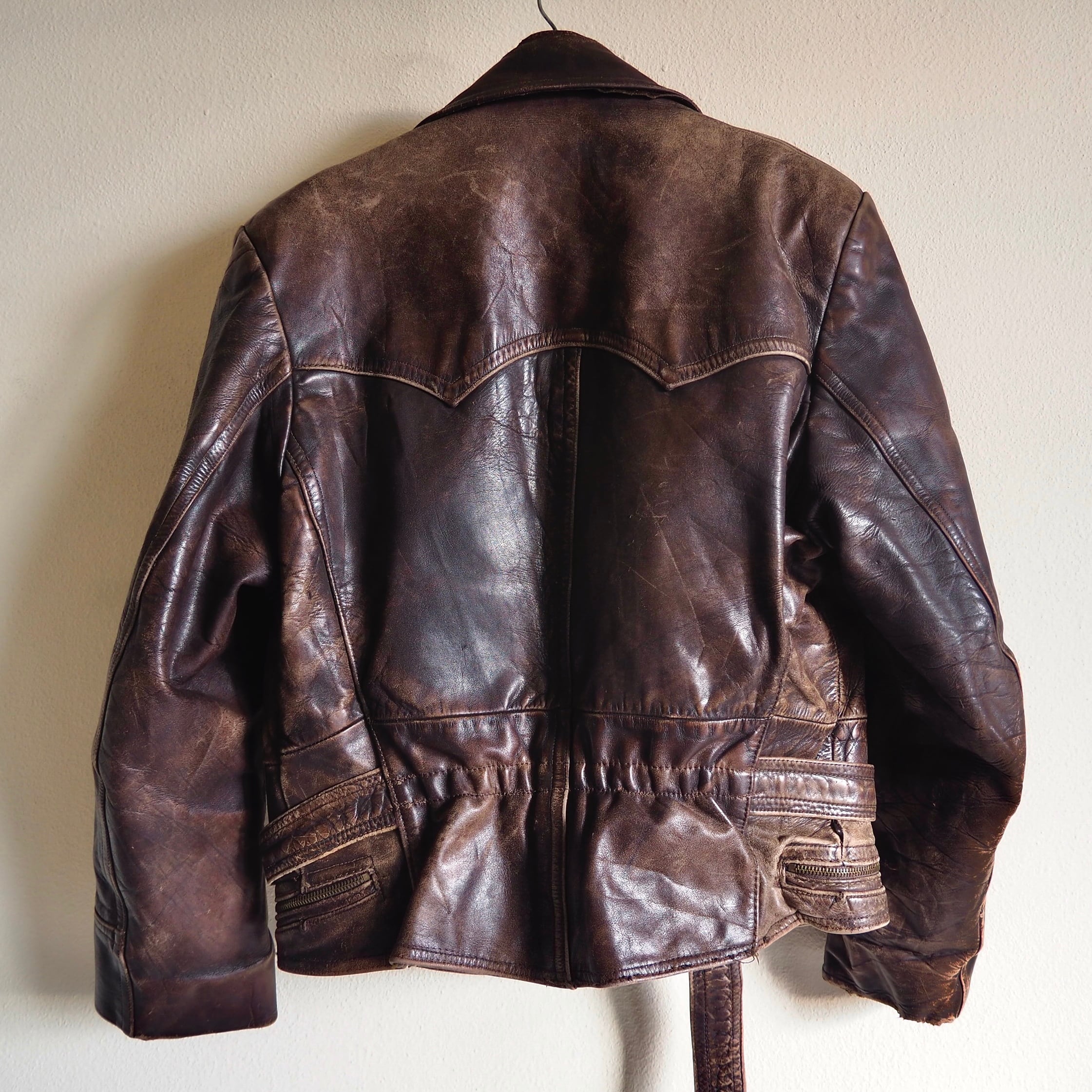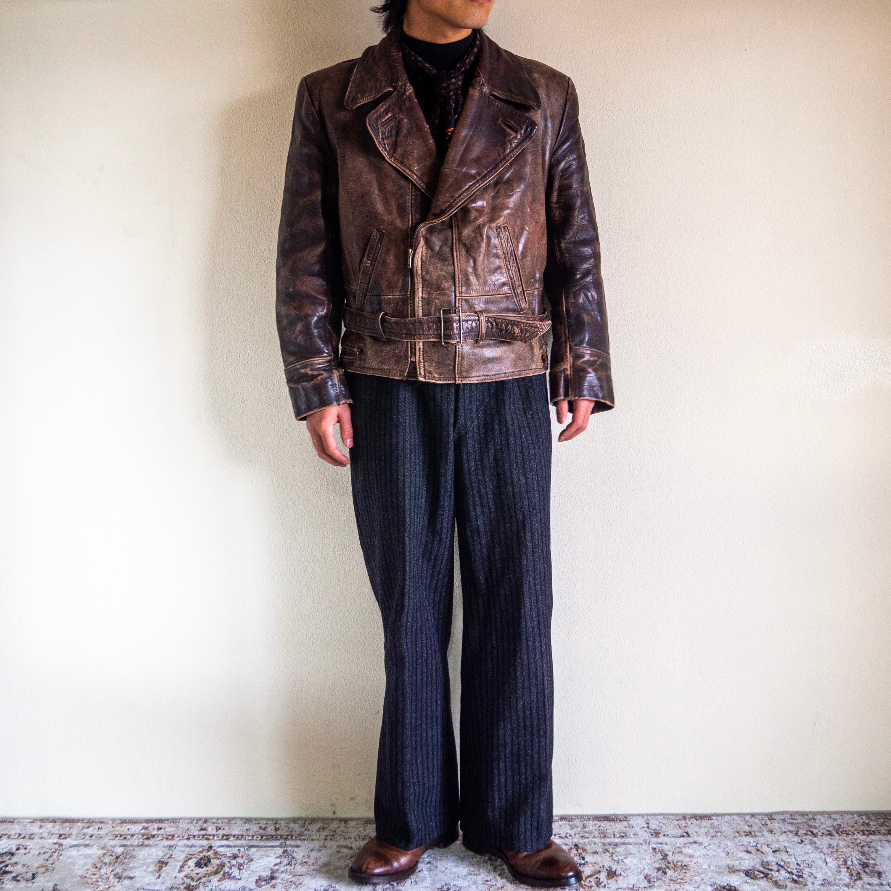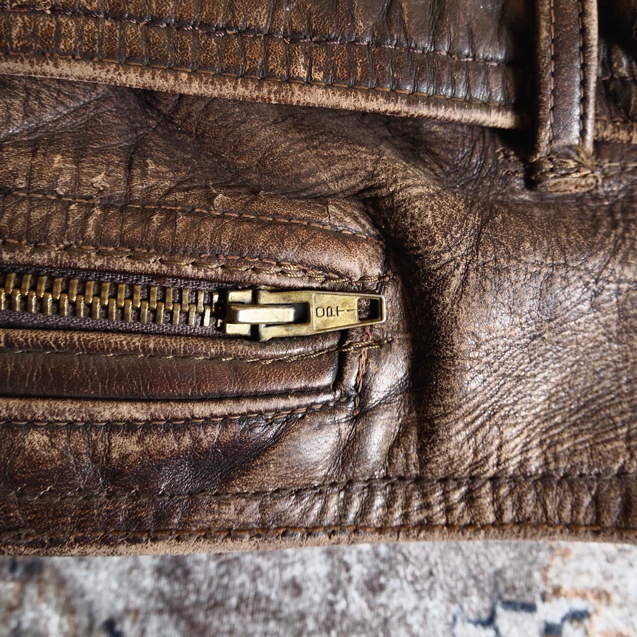 古い年代のモーターサイクルジャケットに特有の贅沢な素材使い。堅牢かつ意匠に富んだプロダクトデザイン。経年により表出した茶芯に、雰囲気をプラスする細かな皺、傷。ヴィンテージレザージャケットの魅力の詰まった逸品です。