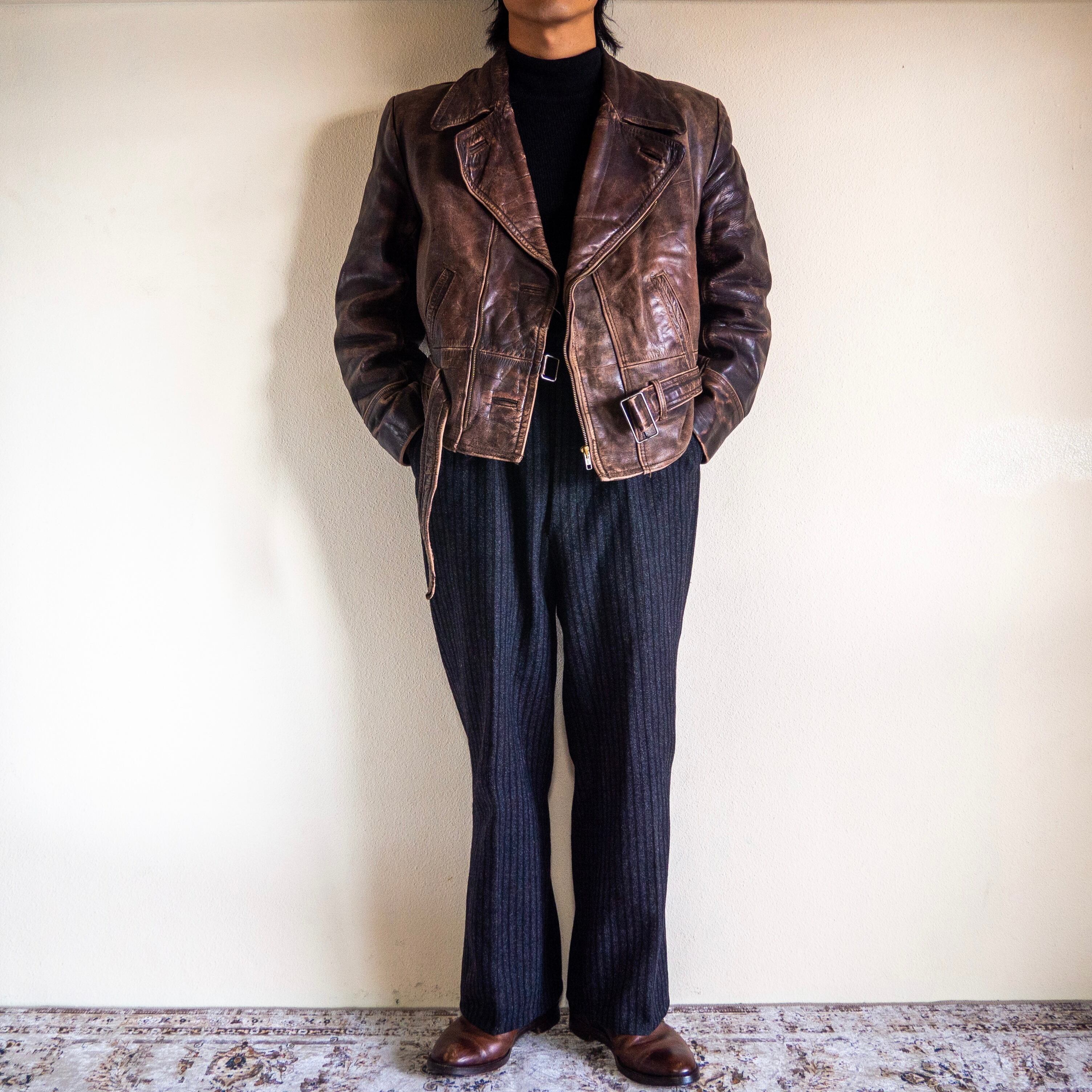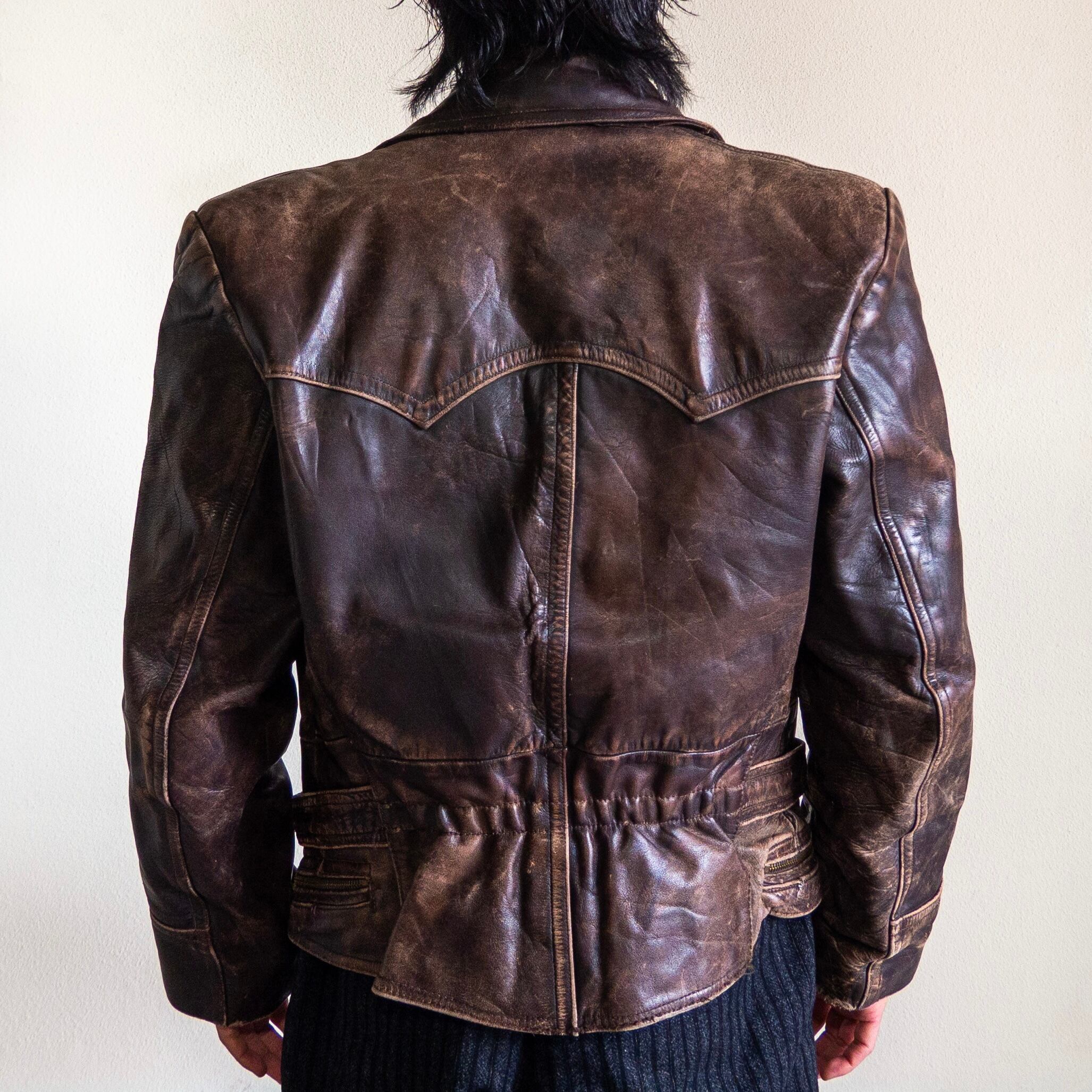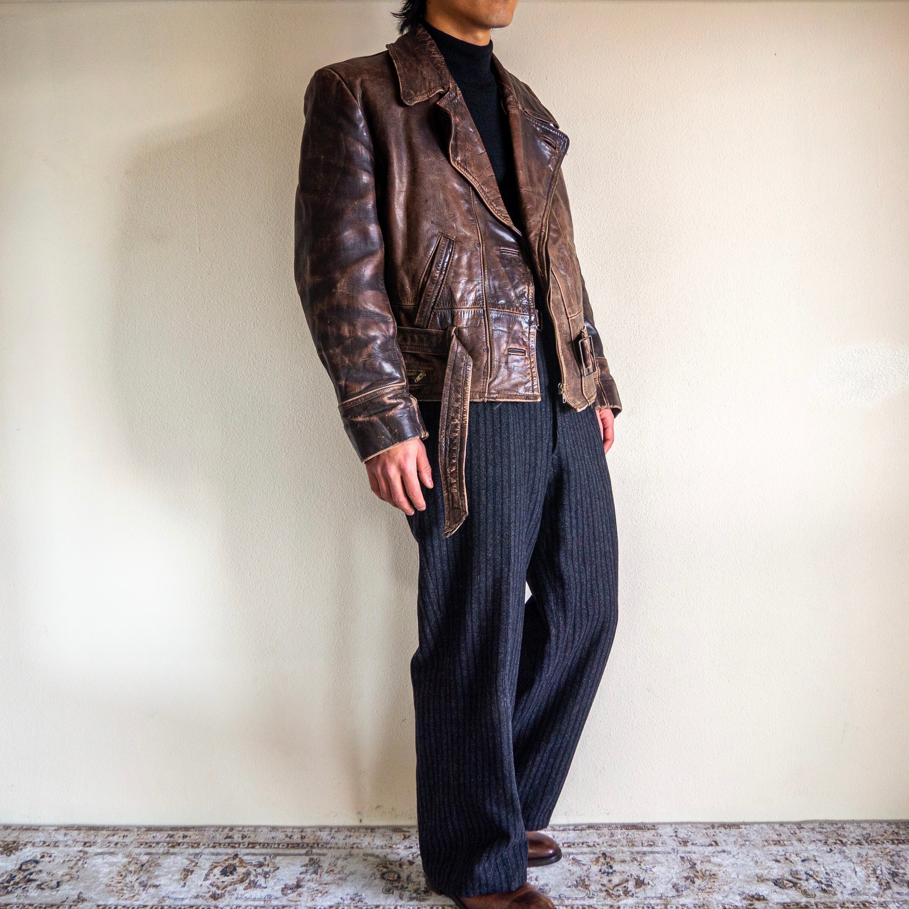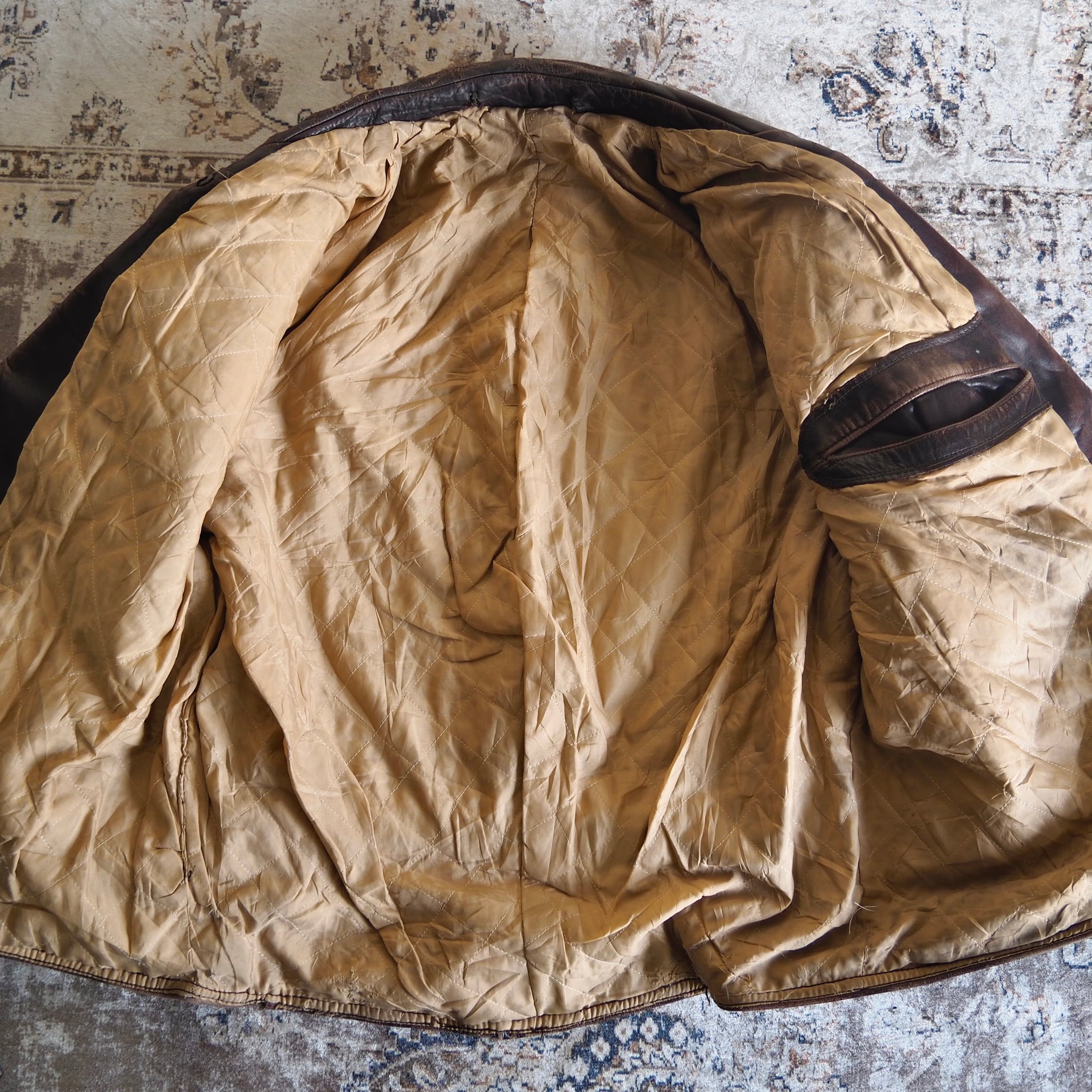 古い年代のモーターサイクルジャケットに特有の贅沢な素材使い。堅牢かつ意匠に富んだプロダクトデザイン。経年により表出した茶芯に、雰囲気をプラスする細かな皺、傷。ヴィンテージレザージャケットの魅力の詰まった逸品です。