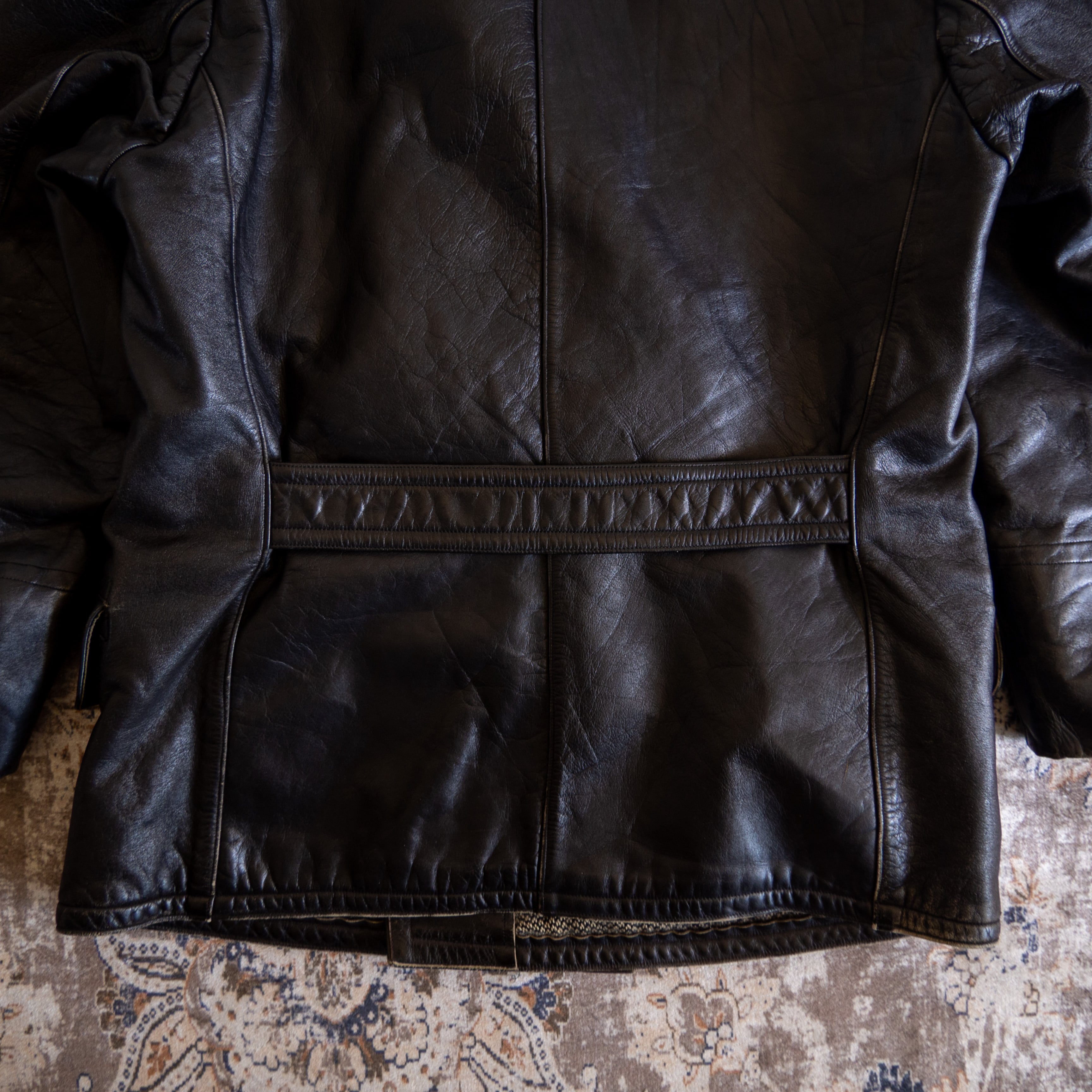 テーラリングの効いた迫力のある襟元に三四半世紀の年月を経てもなお光沢を失わない上質なレザー生地。襟裏の刺繍やアーム部分の切り返しなど細部の作り込みを見ても飛び抜けて作りの良いジャケットです。