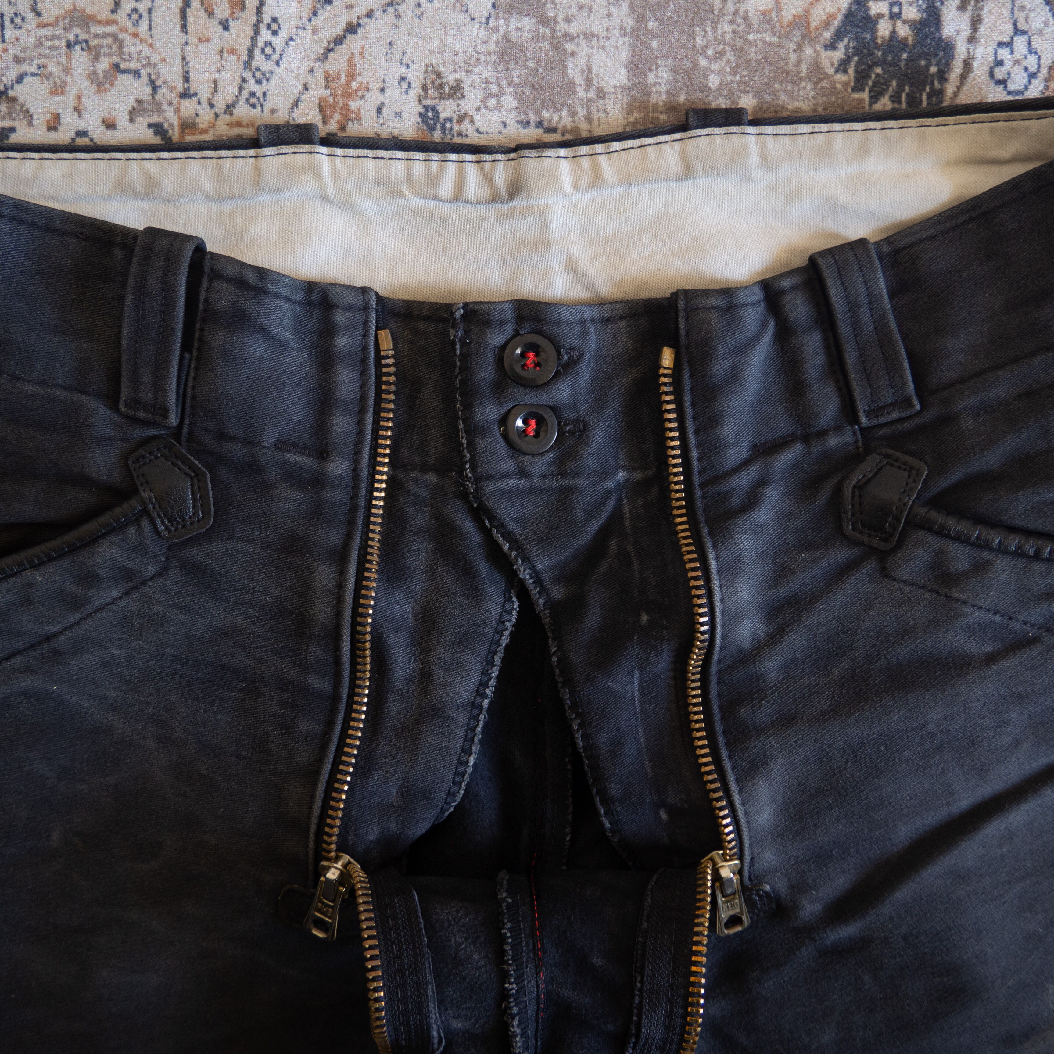 左右両方からアクセス可能なフロントジッパー。耐久性向上の為のポケット縁に施されたレザーパイピングと五角形のレザーパッチ。タフな労働をこなすワーカーのために設計されたディティールの詰まった一本ですが、必然として派生した機能美、純粋なデザイン性の高さには特筆すべきものがございます。