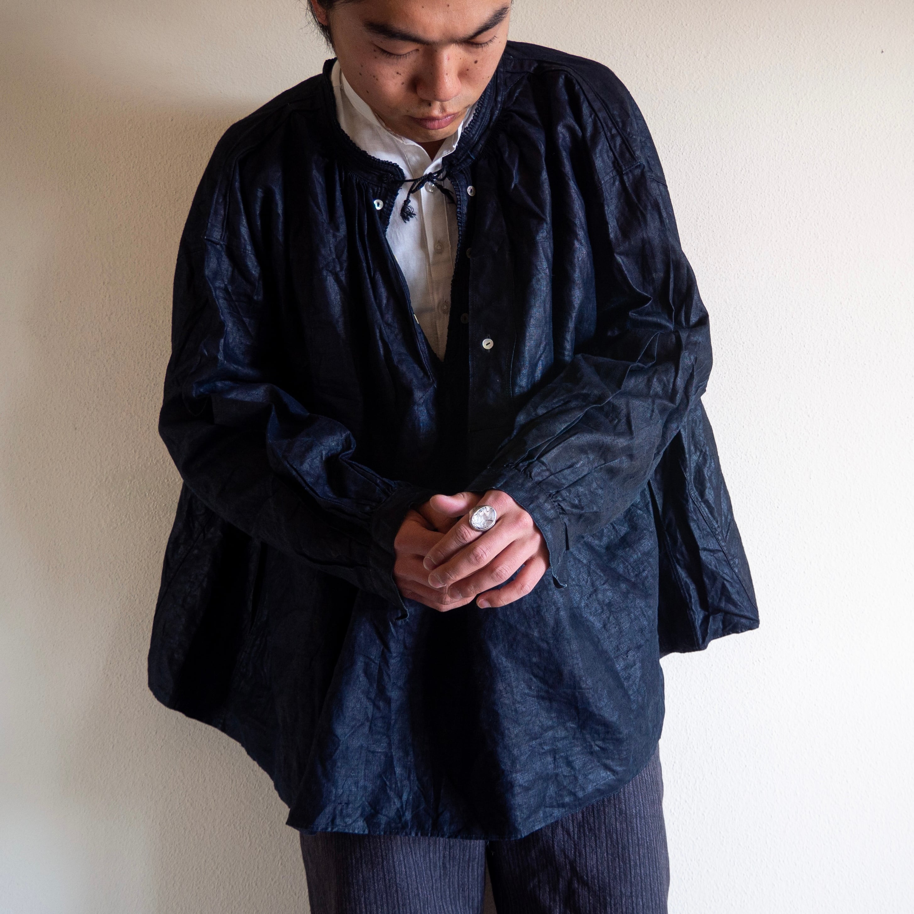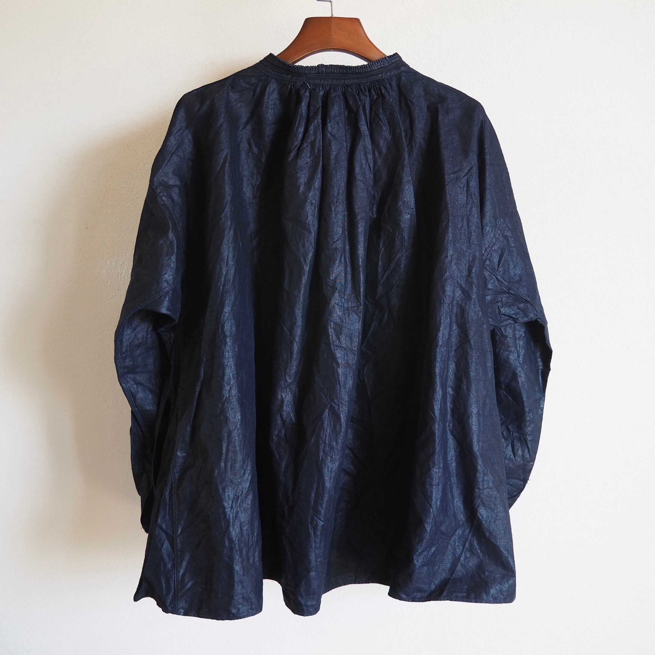 未だ袖ボタンの通されていないデッドストックコンディションならではの深く、濃い藍。表面に施された卵白コーティングがツヤツヤと、身体の動きに合わせて独特の光沢感をなびかせます。
