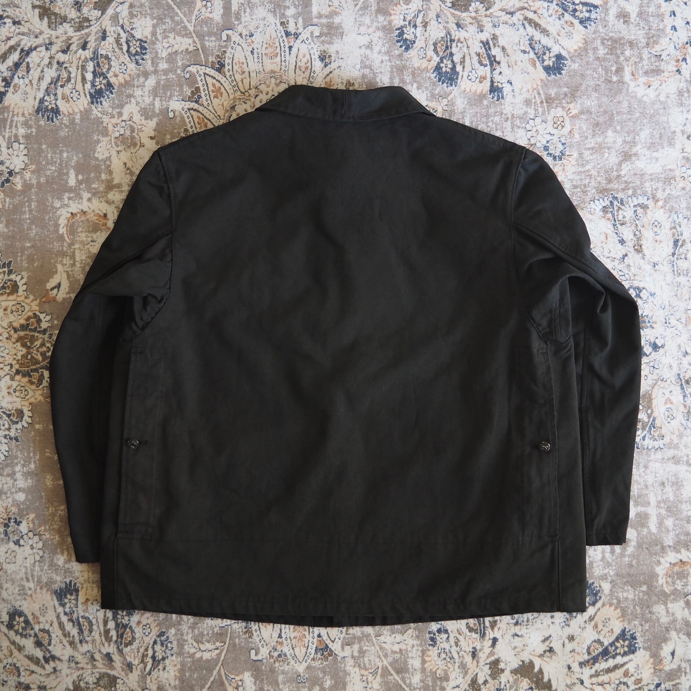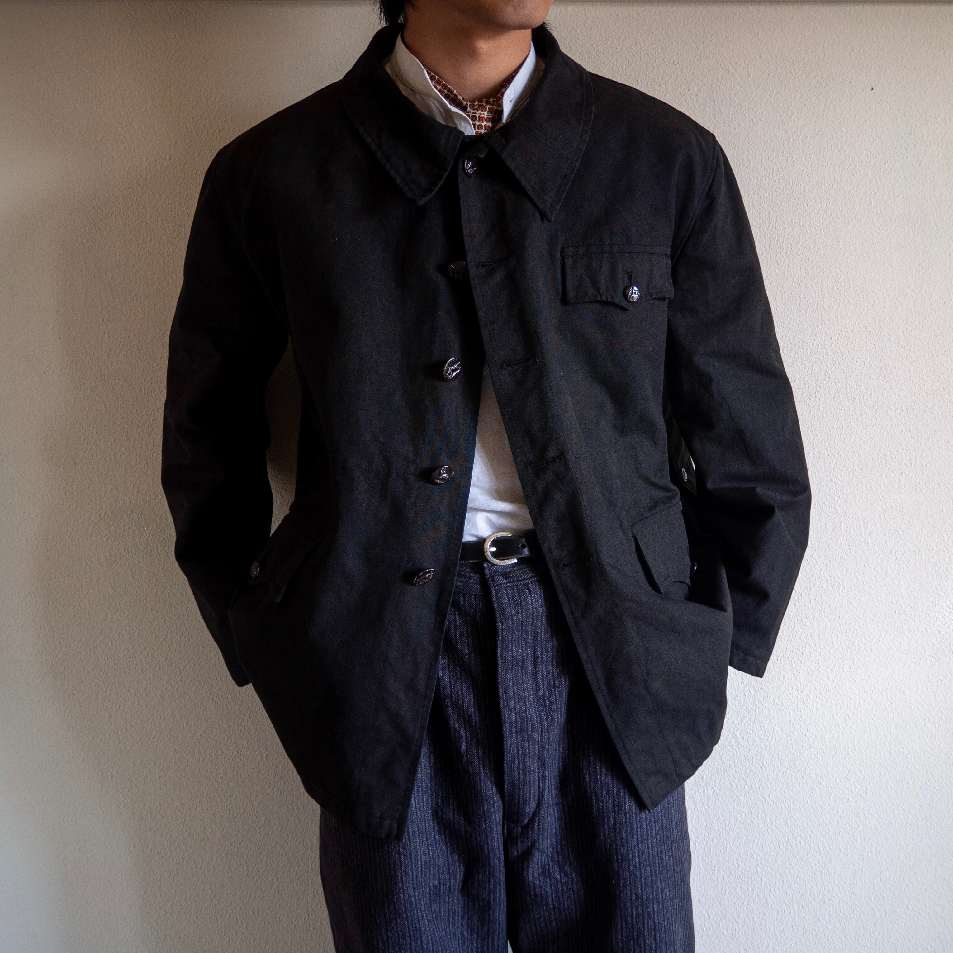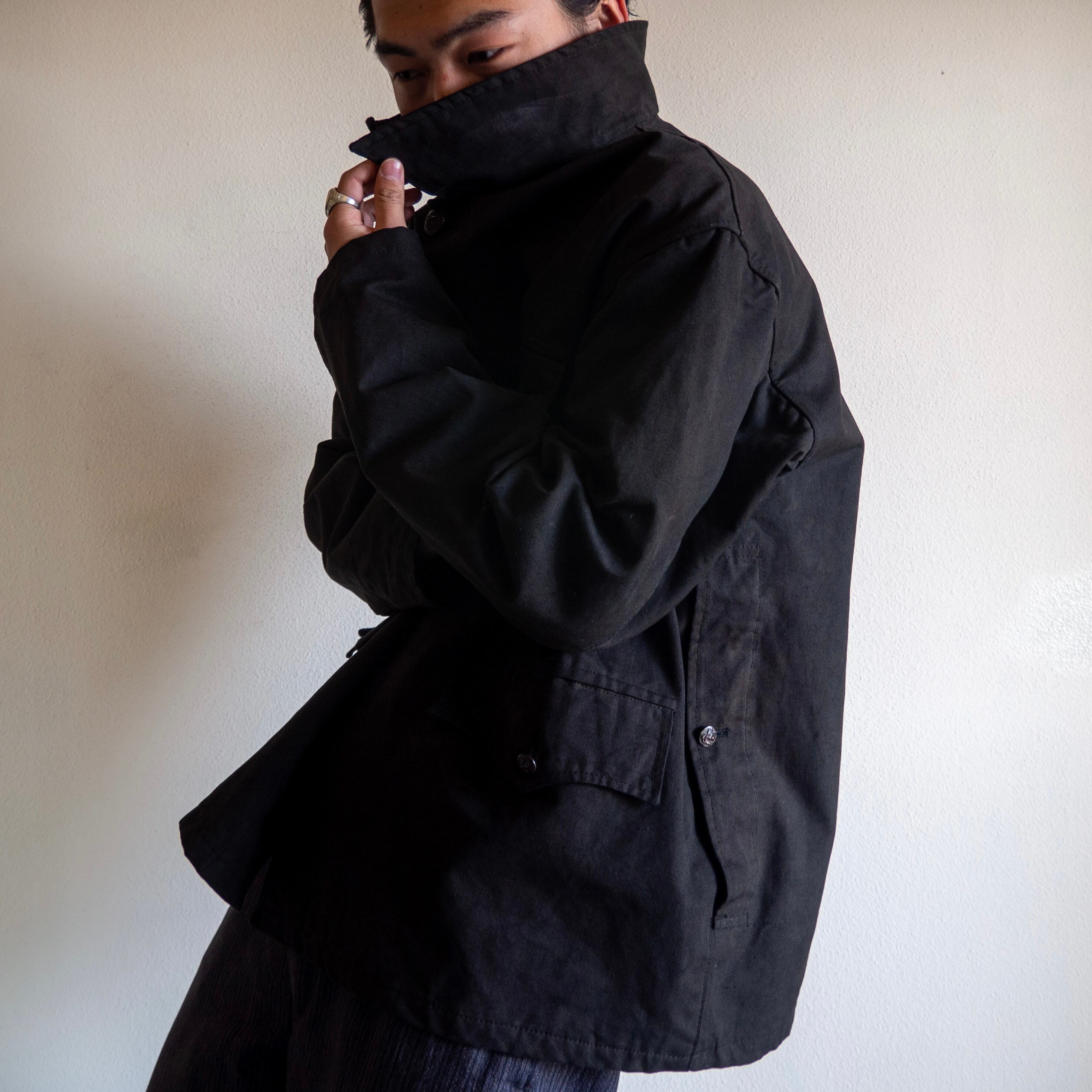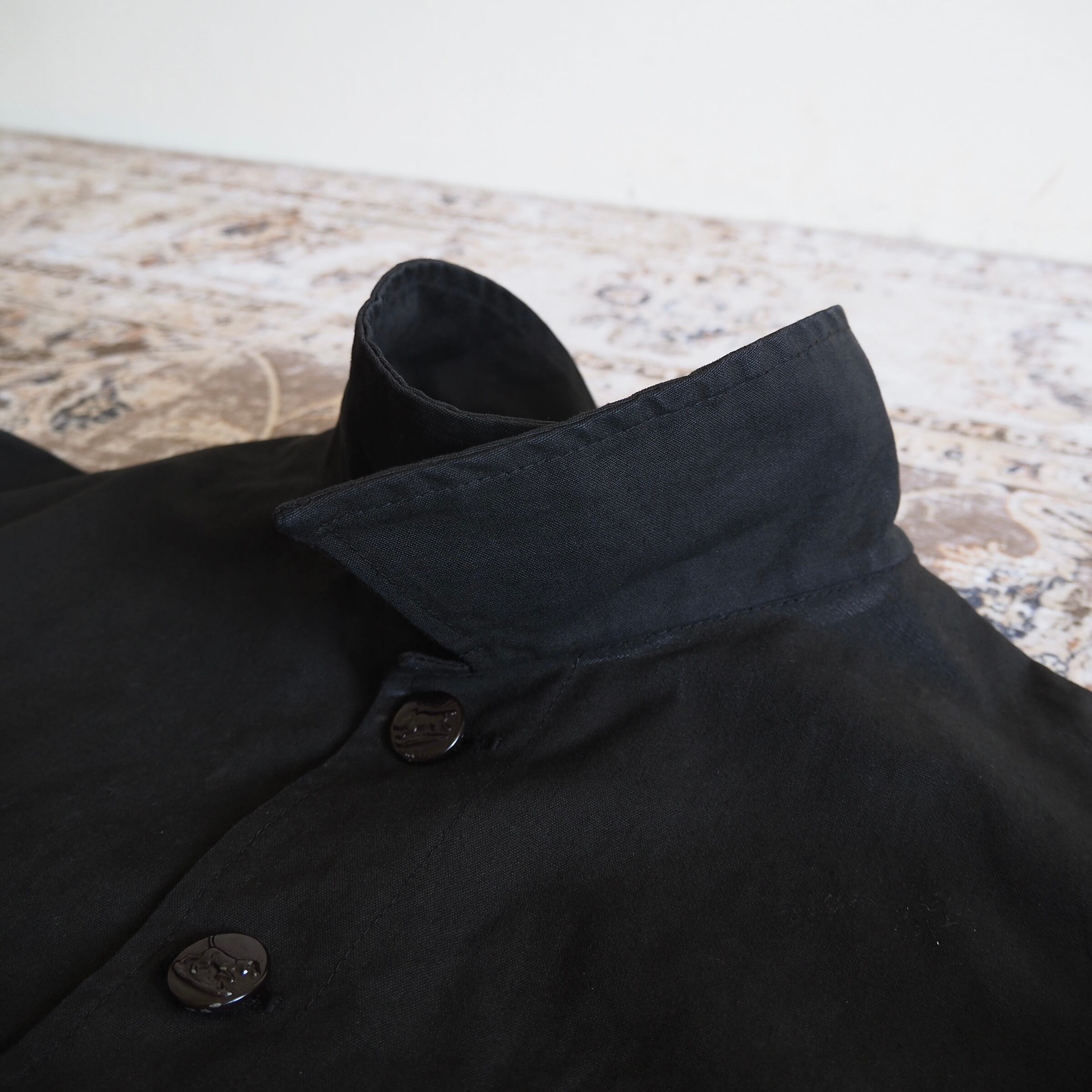 たっぷりと身幅のとられたボックスシルエットに、前オーナーによって後染めされたブラックボディのマットな風合い。立ち襟で、それらが渾然一体となった時の、ひとつのclothesとしての美しさたるや。