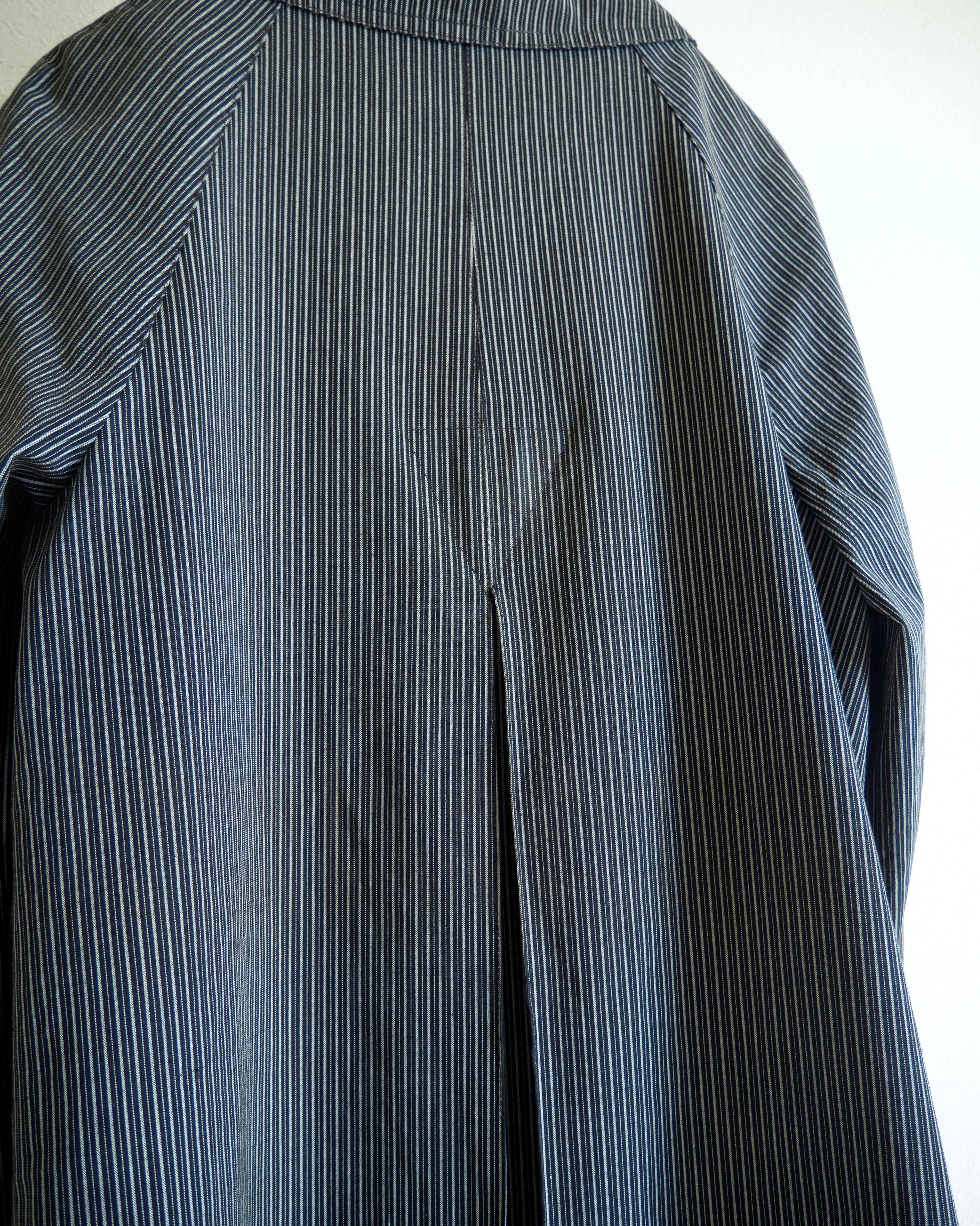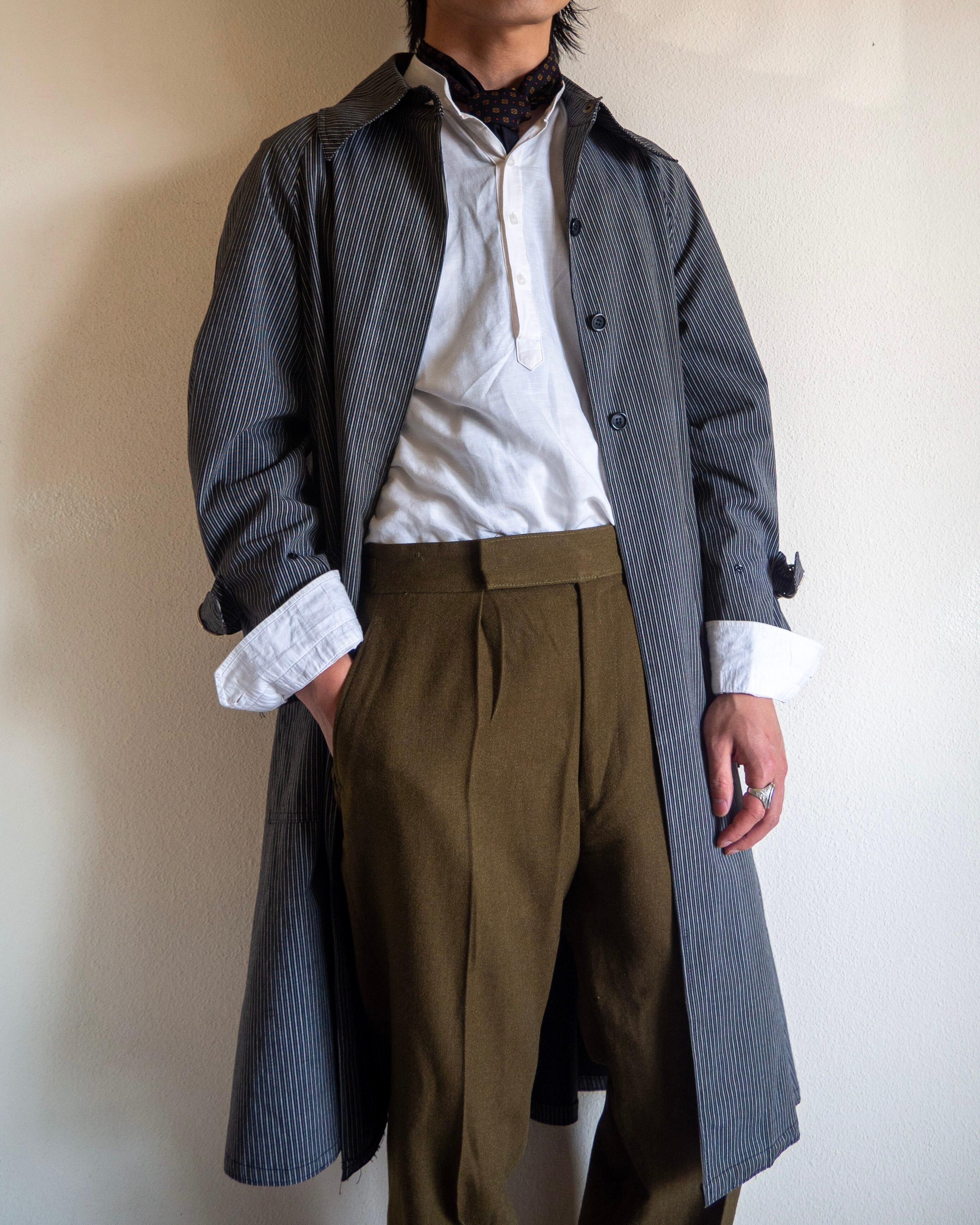 フロントは比翼仕様。ラグランの袖付けが生み出す肩の落ち感が素晴らしく、袖先のアジャスターベルトをギュッと絞ることでシルエットにアクセントが加わります。