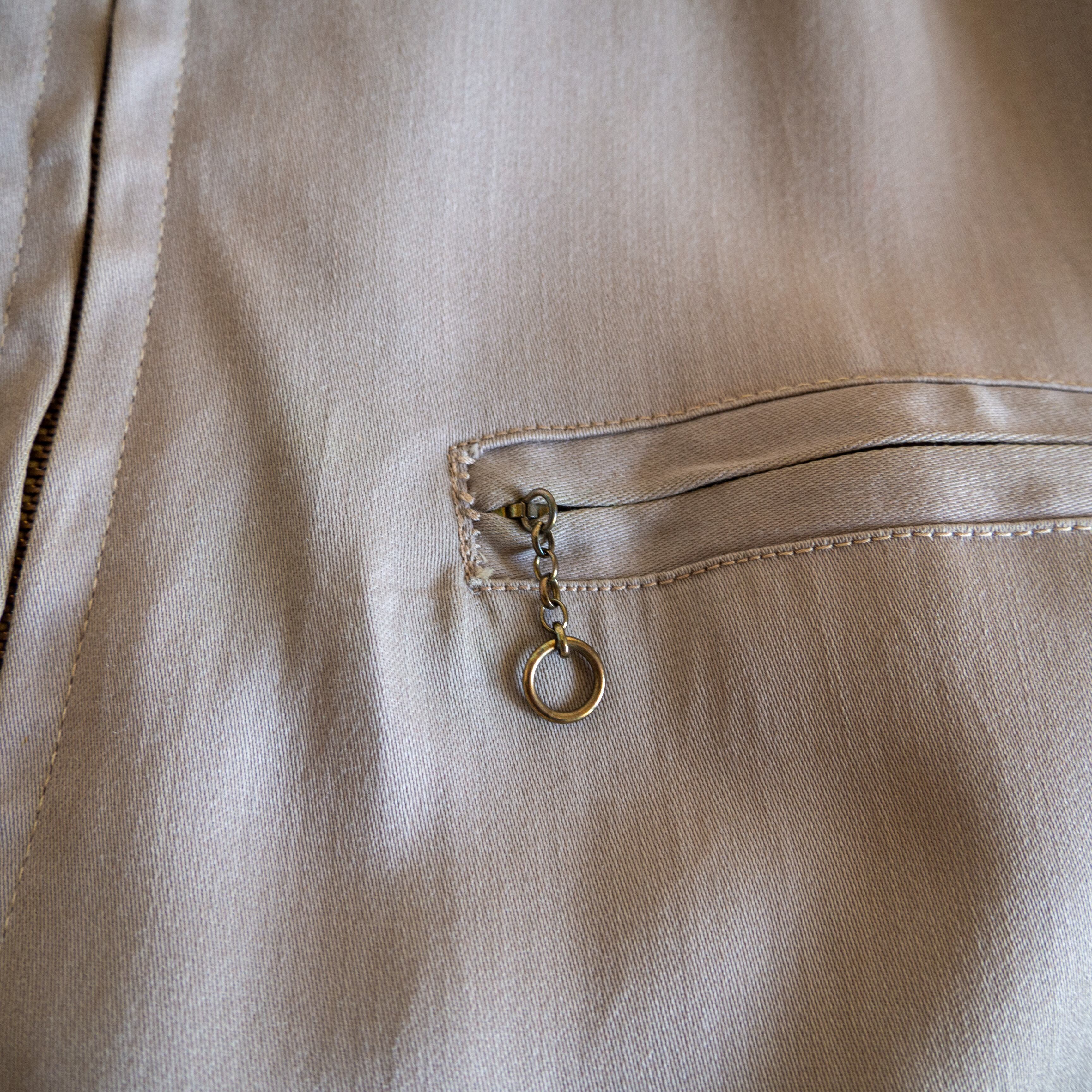 フロントには二つのスラッシュポケットに加え、胸元には真鍮製チェーンジップによるジッパー式ポケットが付属。メインジッパーには60年代頃の同じく真鍮製"LIGHTNING"ジップを採用。