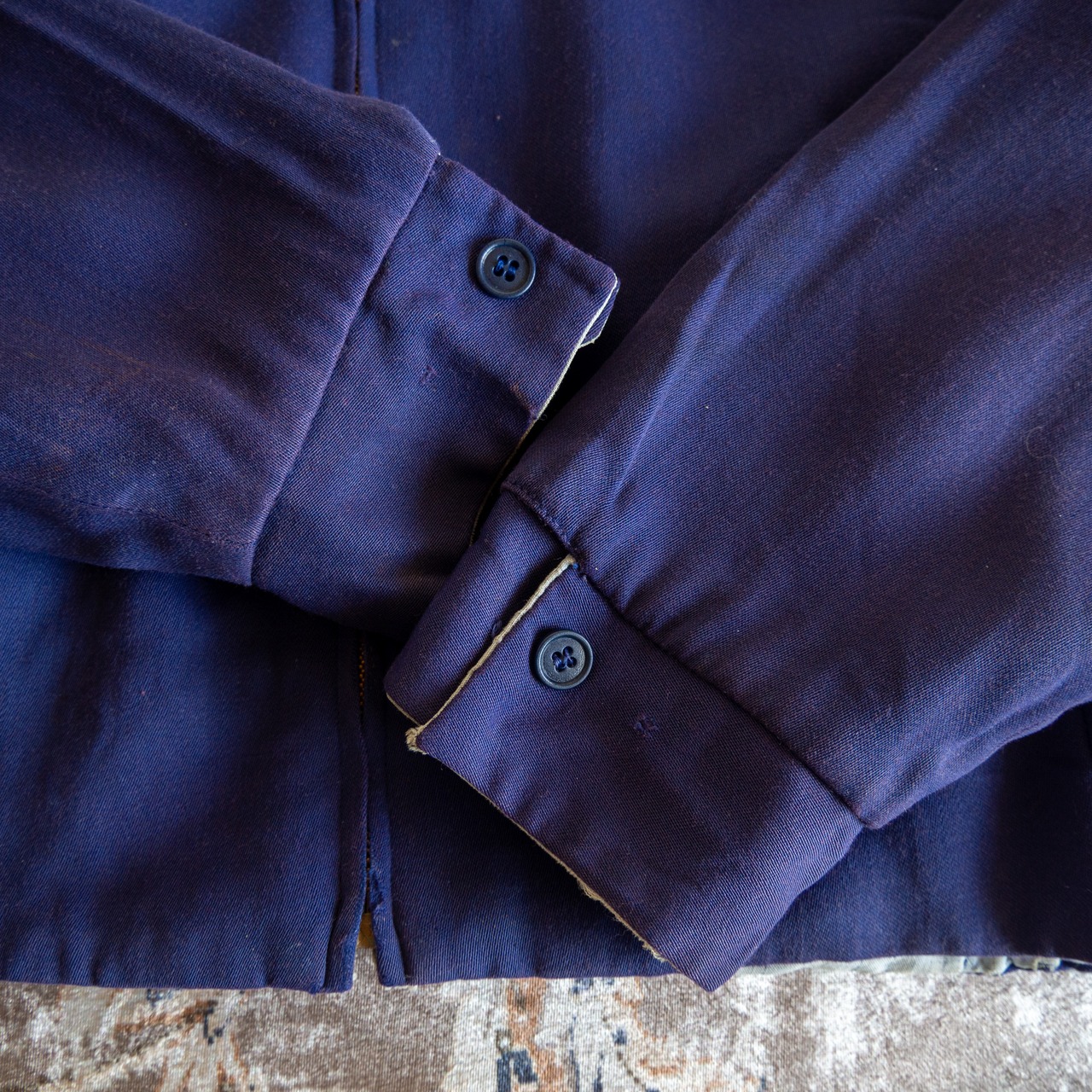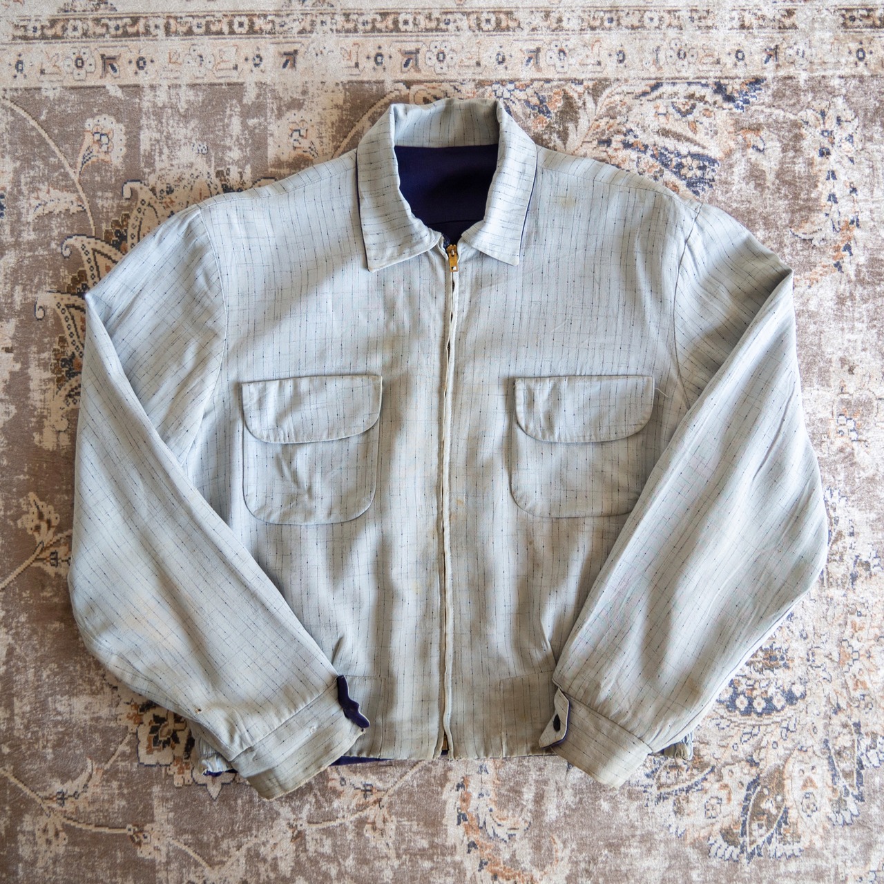 状態といたしましては、一度クリーニングに出したもののA面袖口付近、B面フロントに僅かに汚れが付着している箇所がございます。年代を考慮すると比較的グッドコンディションですが、それ自体を雰囲気としてお楽しみいただける方にご検討をお勧め致します。