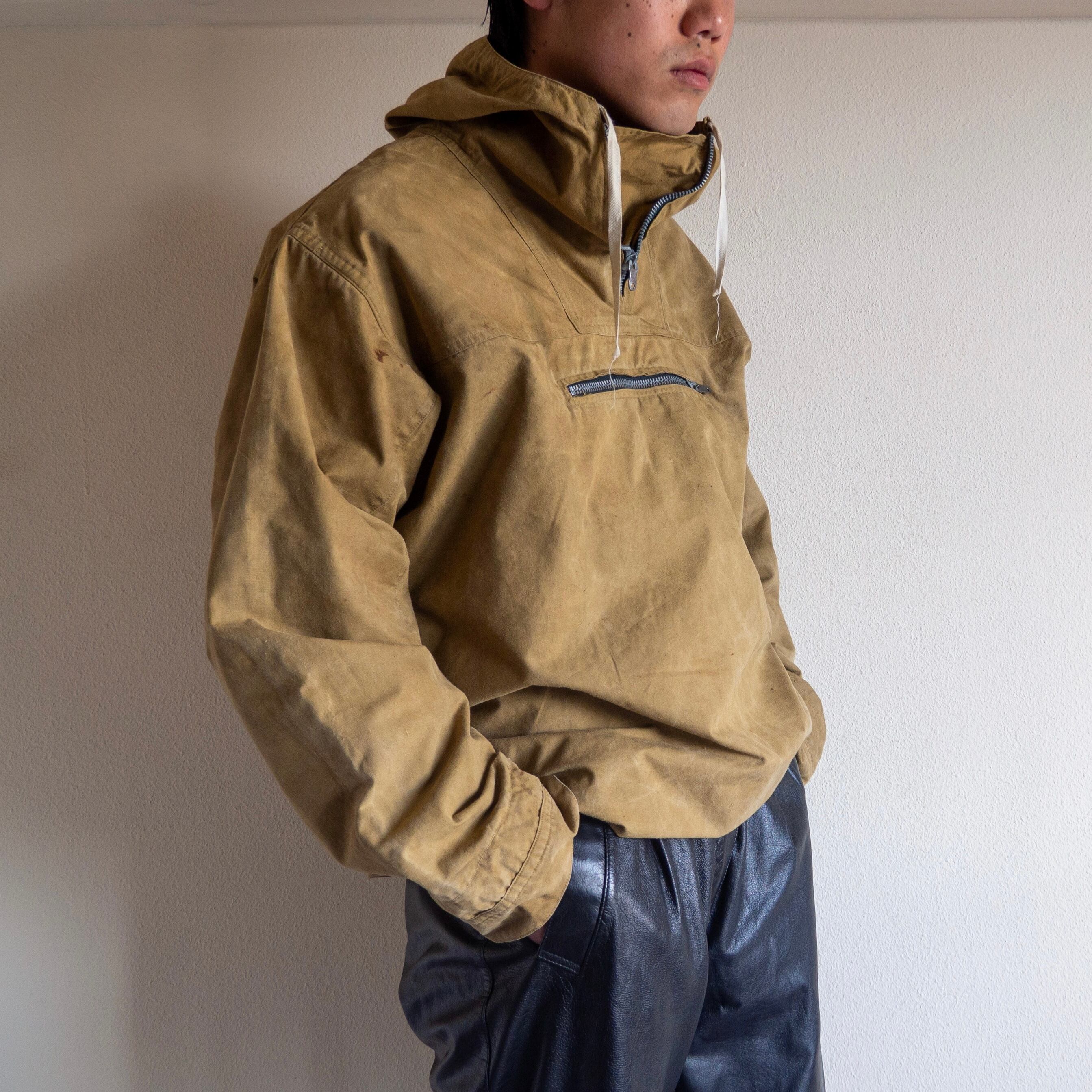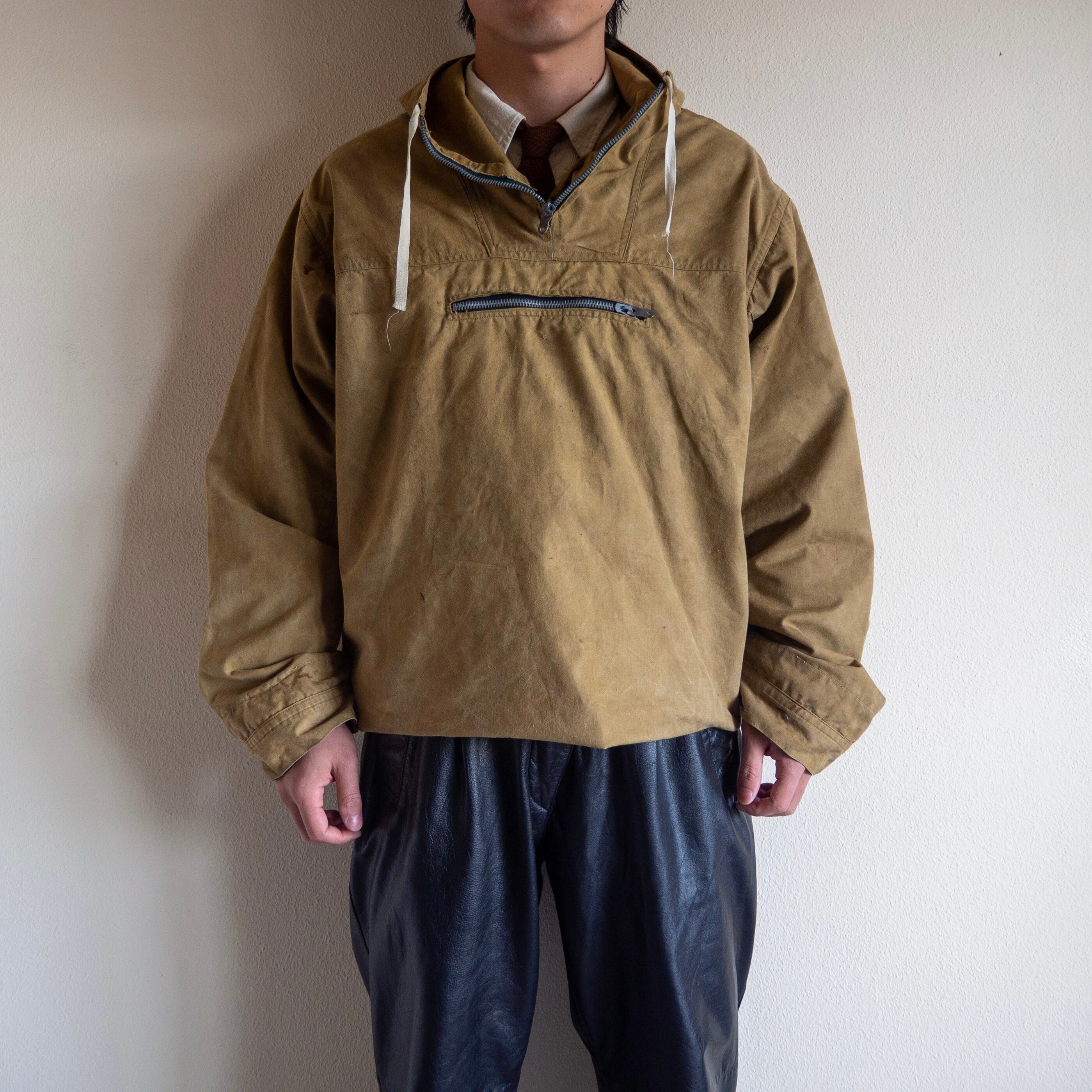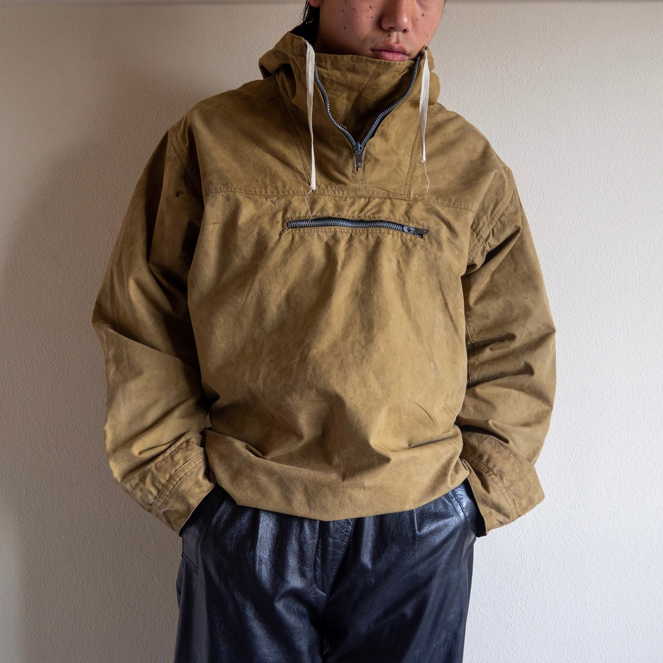 簡素な作りながらも、経年の加わった古めかしい素材感に秀逸なシルエットバランスが魅力の1着。化繊、マルチポケット、様々なデザインのアノラックパーカーを見てきましたがその中でも群を抜いて格好いい1着だと思います。