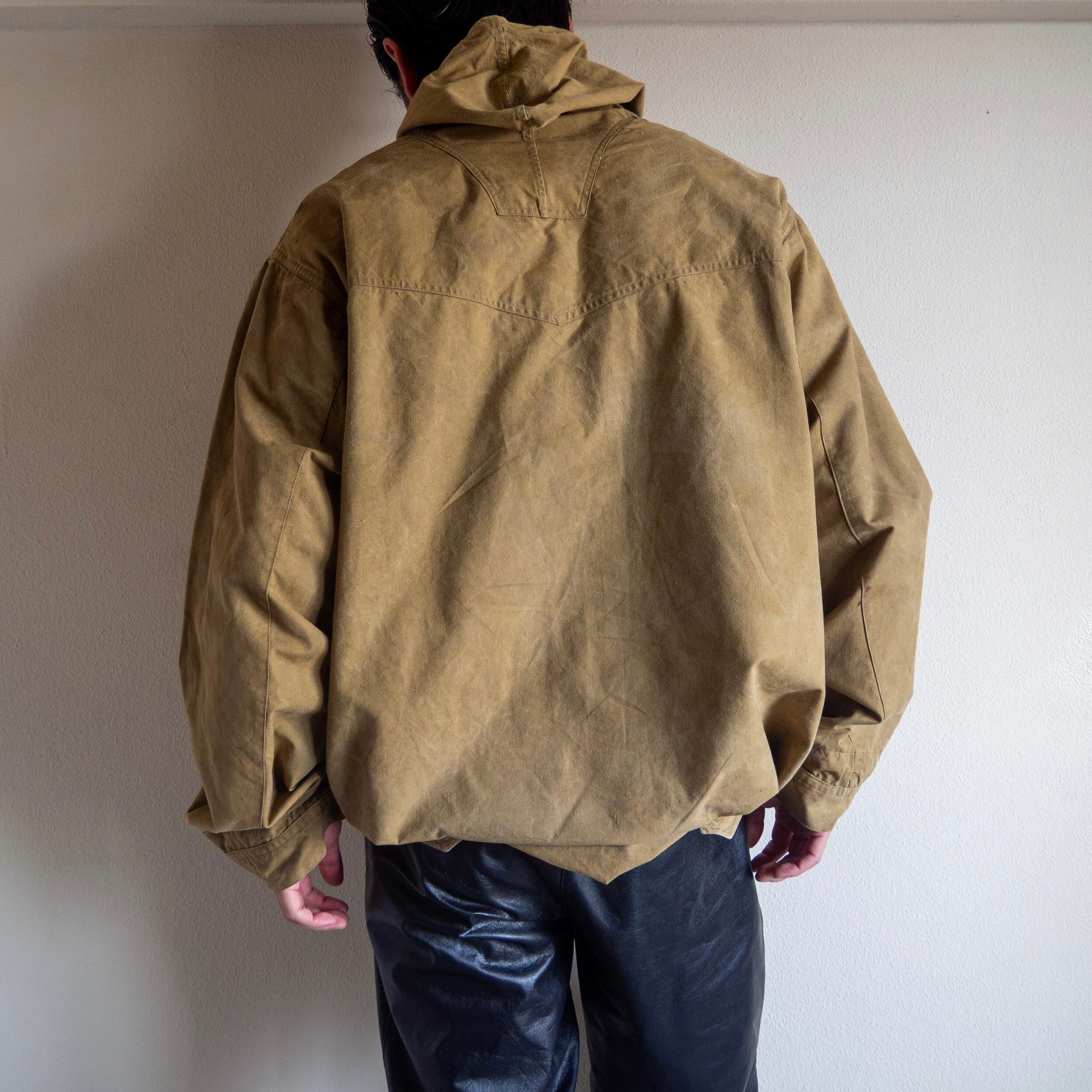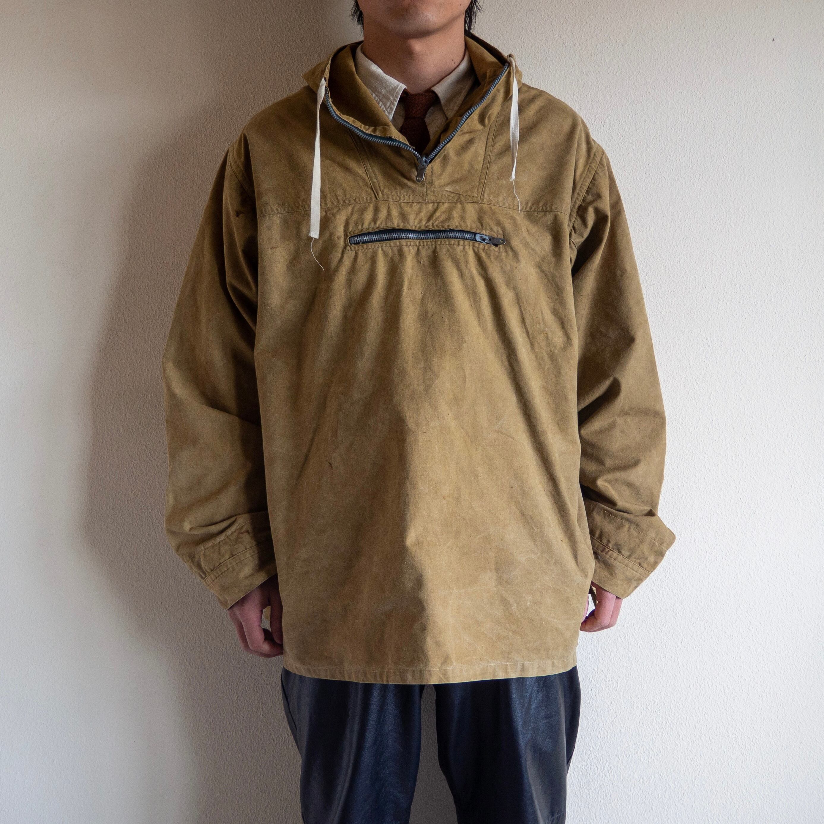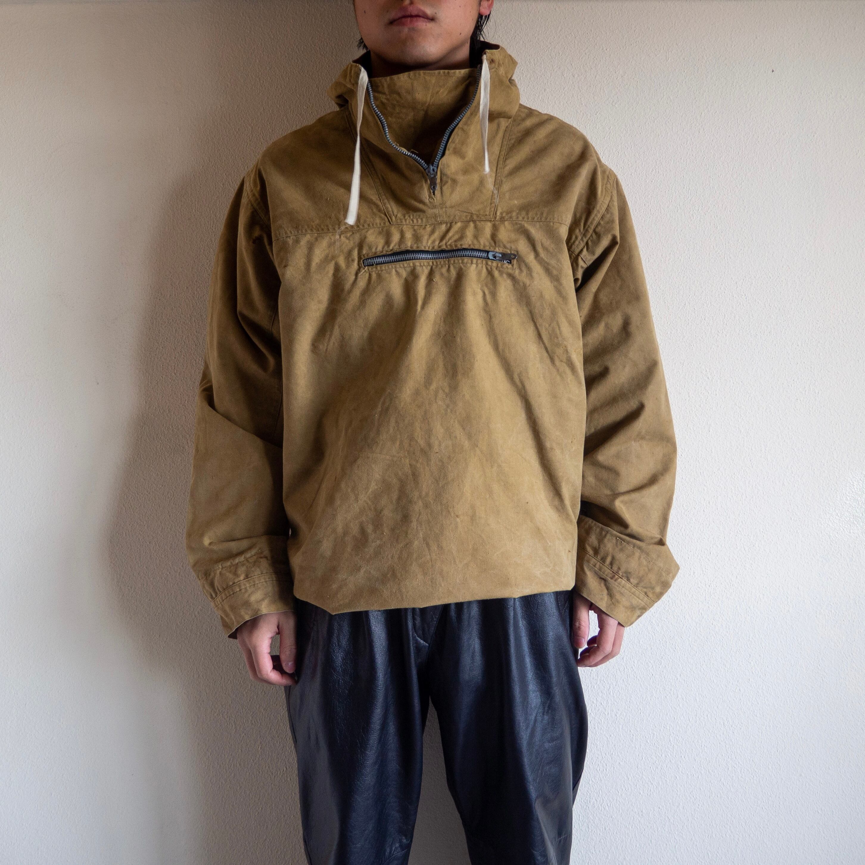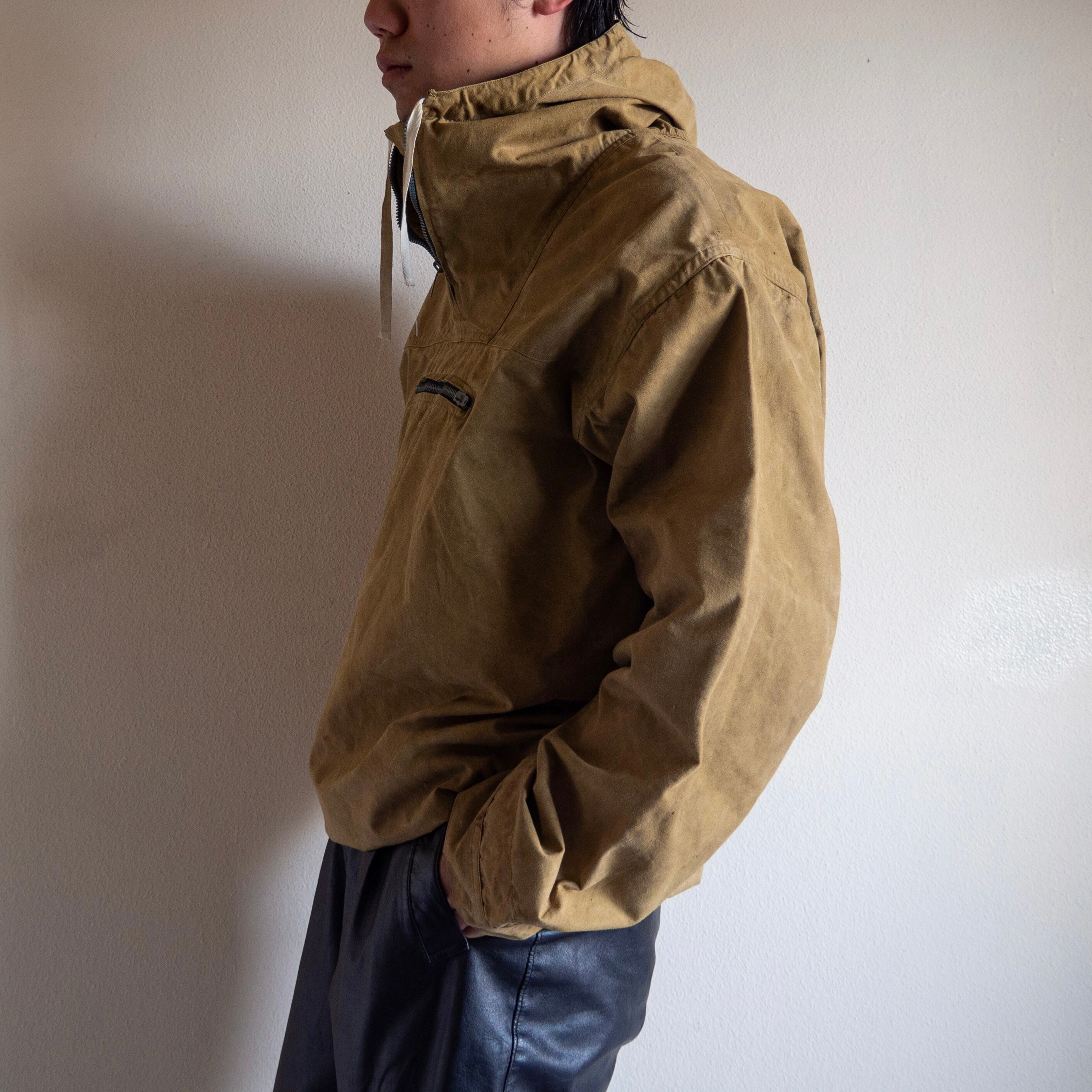 簡素な作りながらも、経年の加わった古めかしい素材感に秀逸なシルエットバランスが魅力の1着。化繊、マルチポケット、様々なデザインのアノラックパーカーを見てきましたがその中でも群を抜いて格好いい1着だと思います。