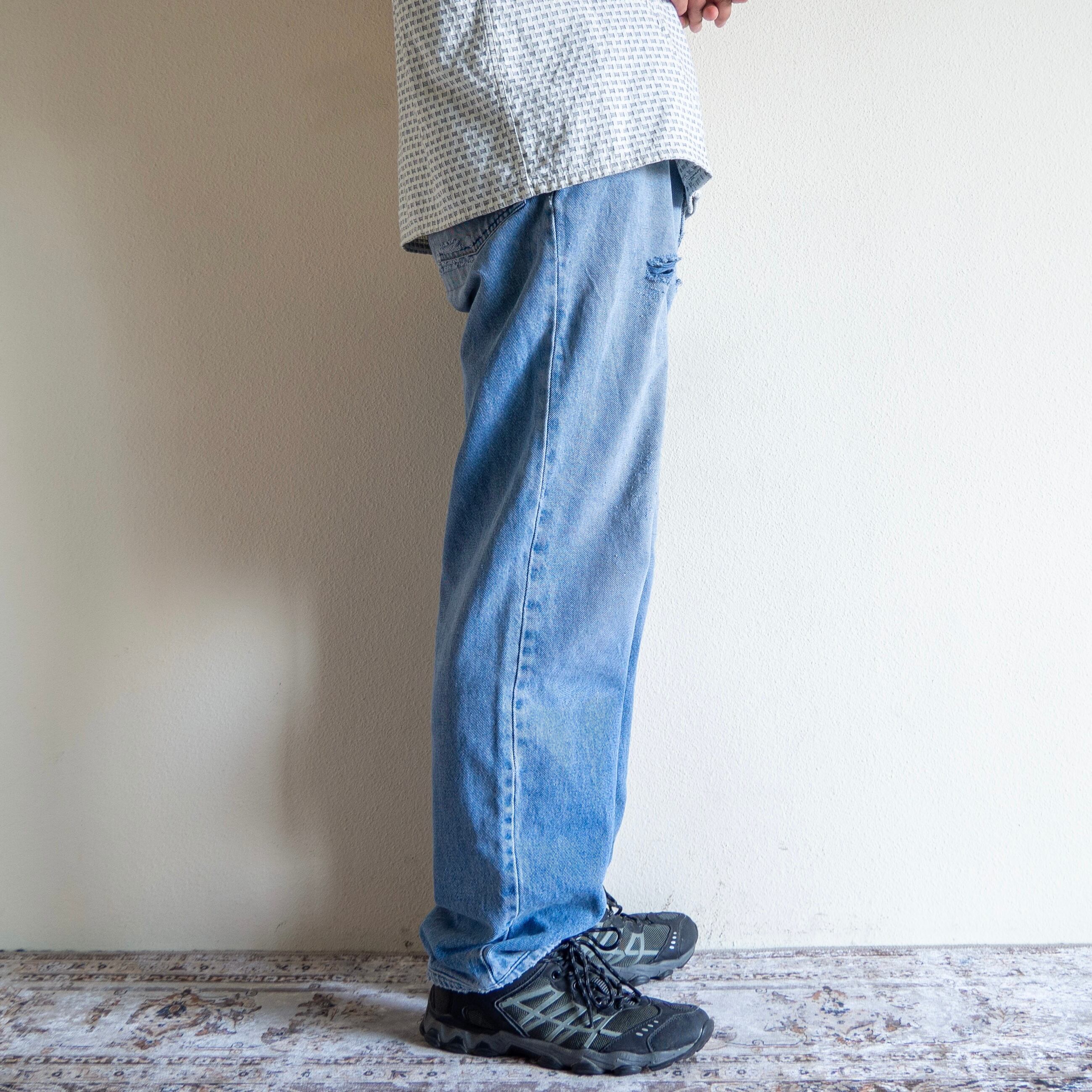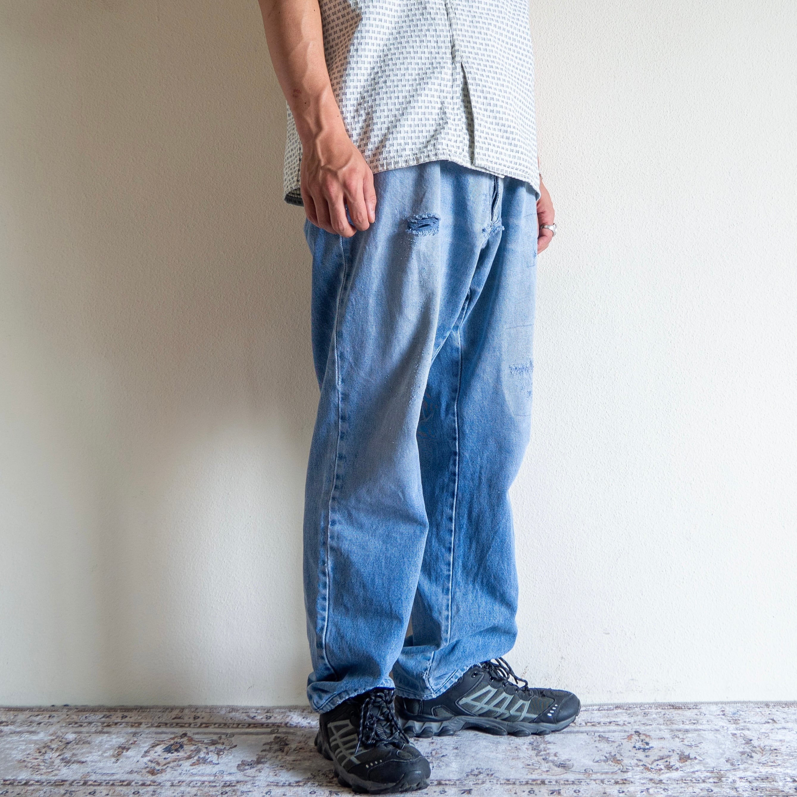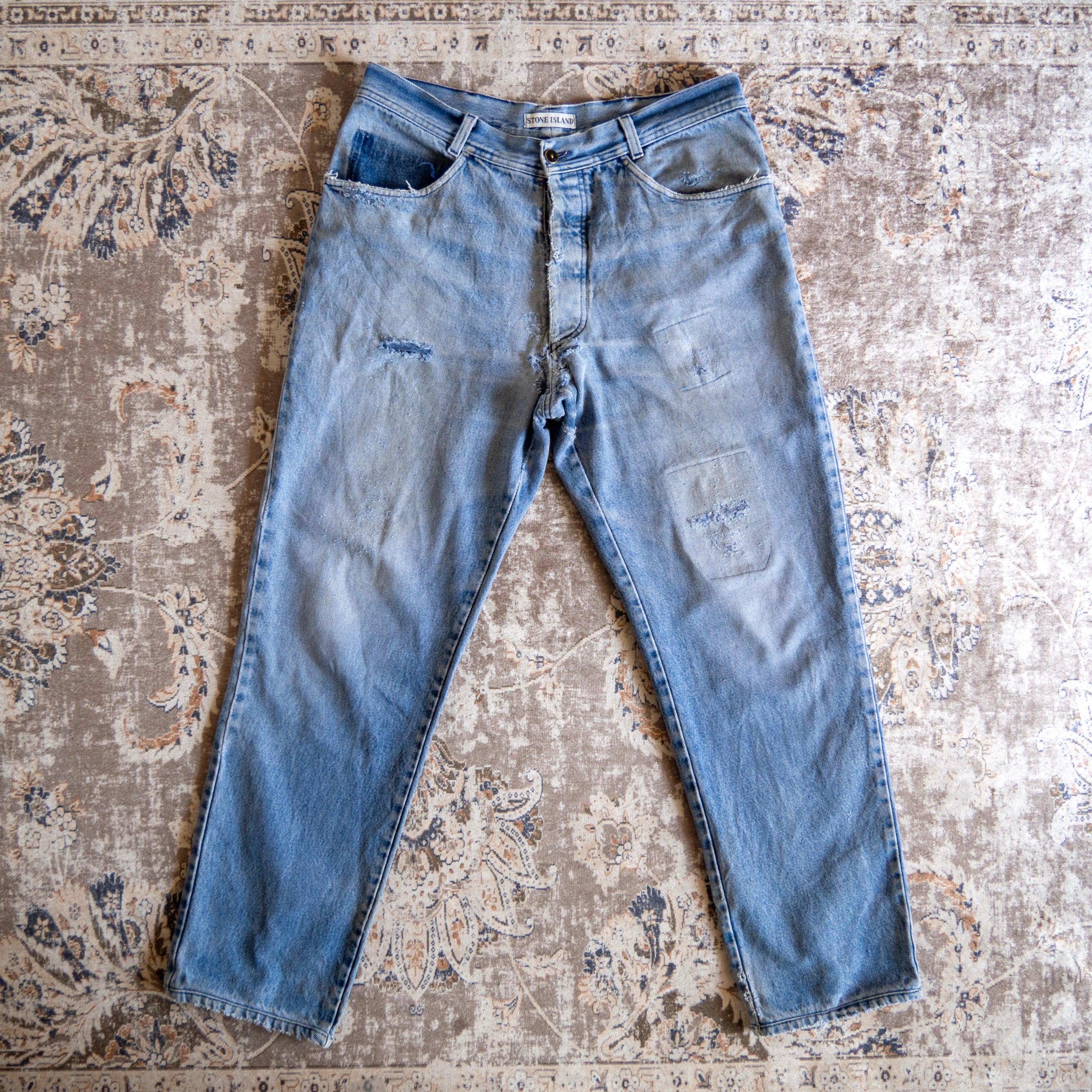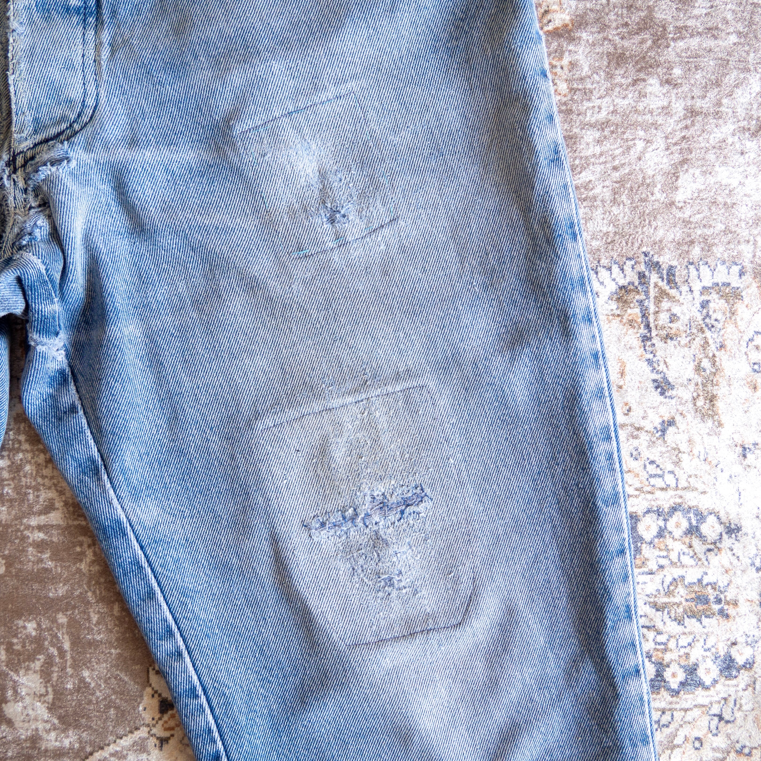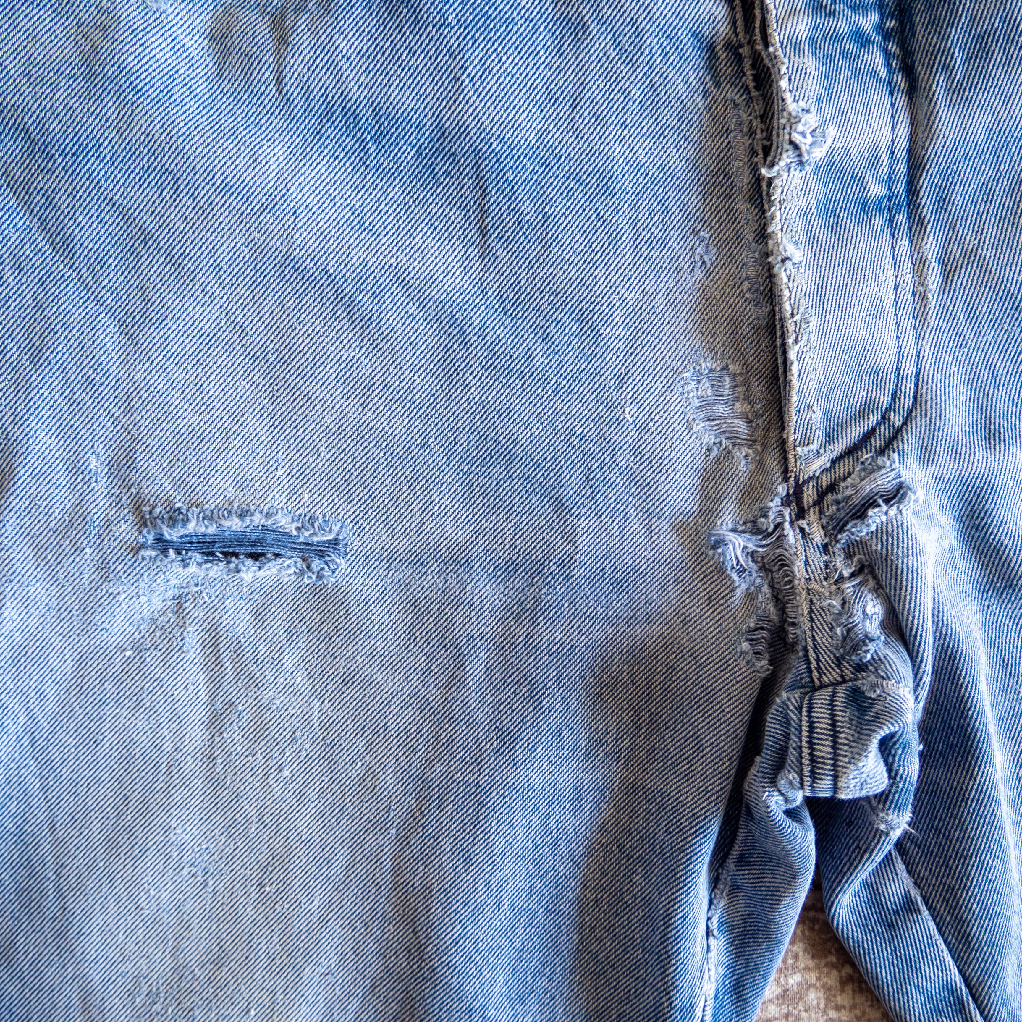 氏が得意とした"Garment Dye"と呼ばれる染めが施されたデニム生地に、まるで数十年ものあいだ履き込まれたヴィンテージデニムのようなダメージ加工が施された一本。