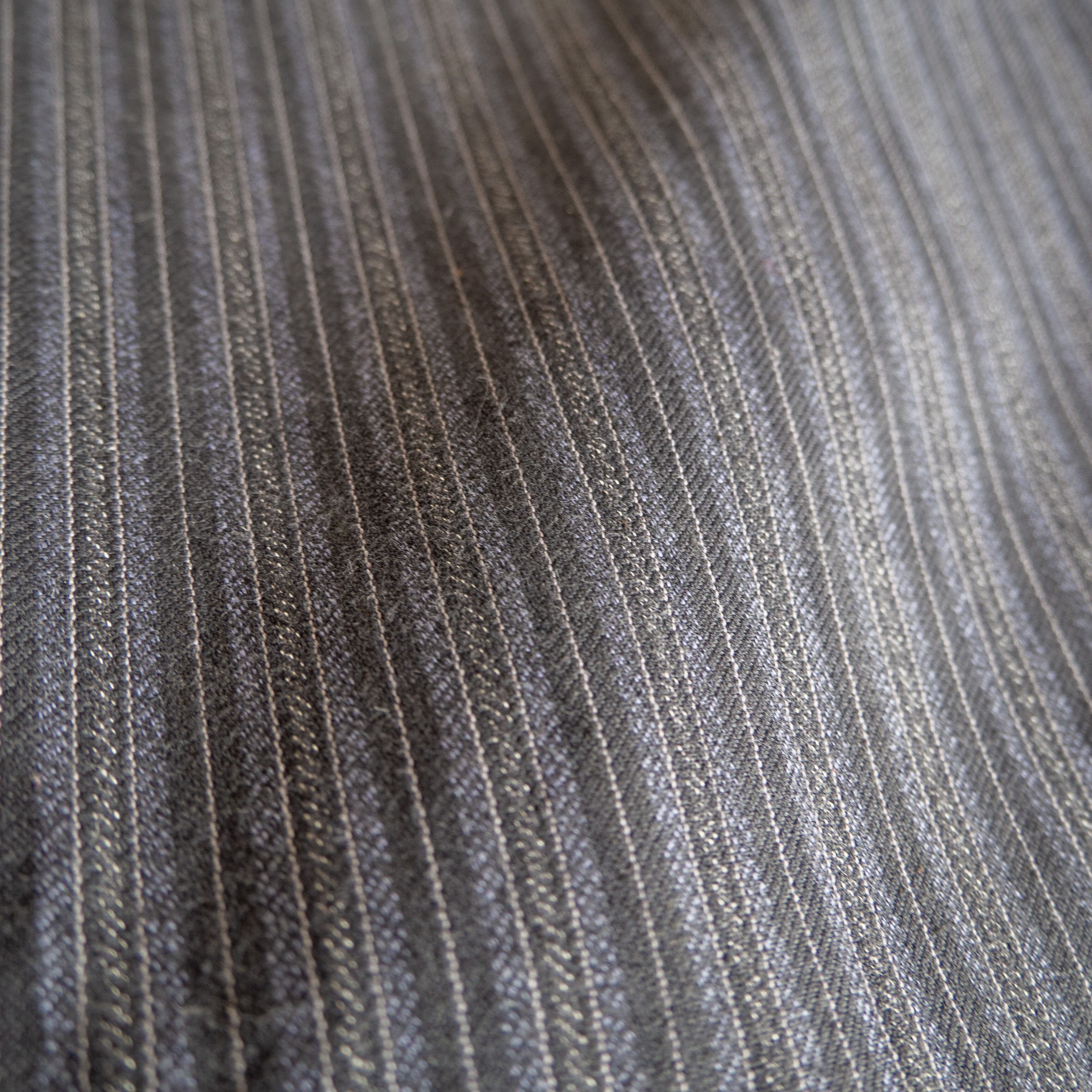 細い白、シャンブレーがかったグレー、青みの入るごま塩、主軸のブラックの4本のラインにより構成される手の込んだストライプ模様。