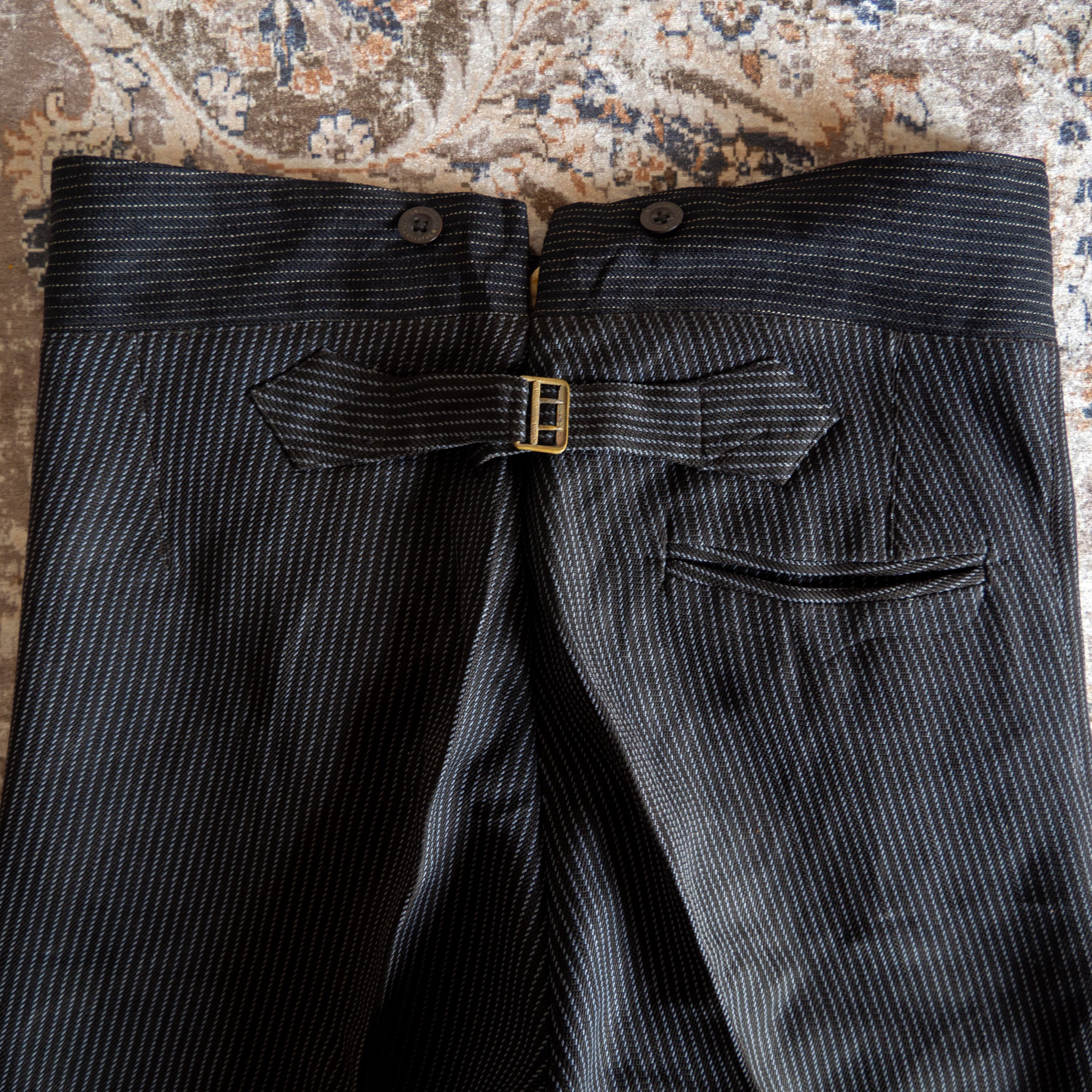 ウエストから裾先に一直線に落ちるストレートシルエット。裾部分はイングランドに伝統的な前裾が後裾よりも1.5センチ短いモーニングカット仕様。