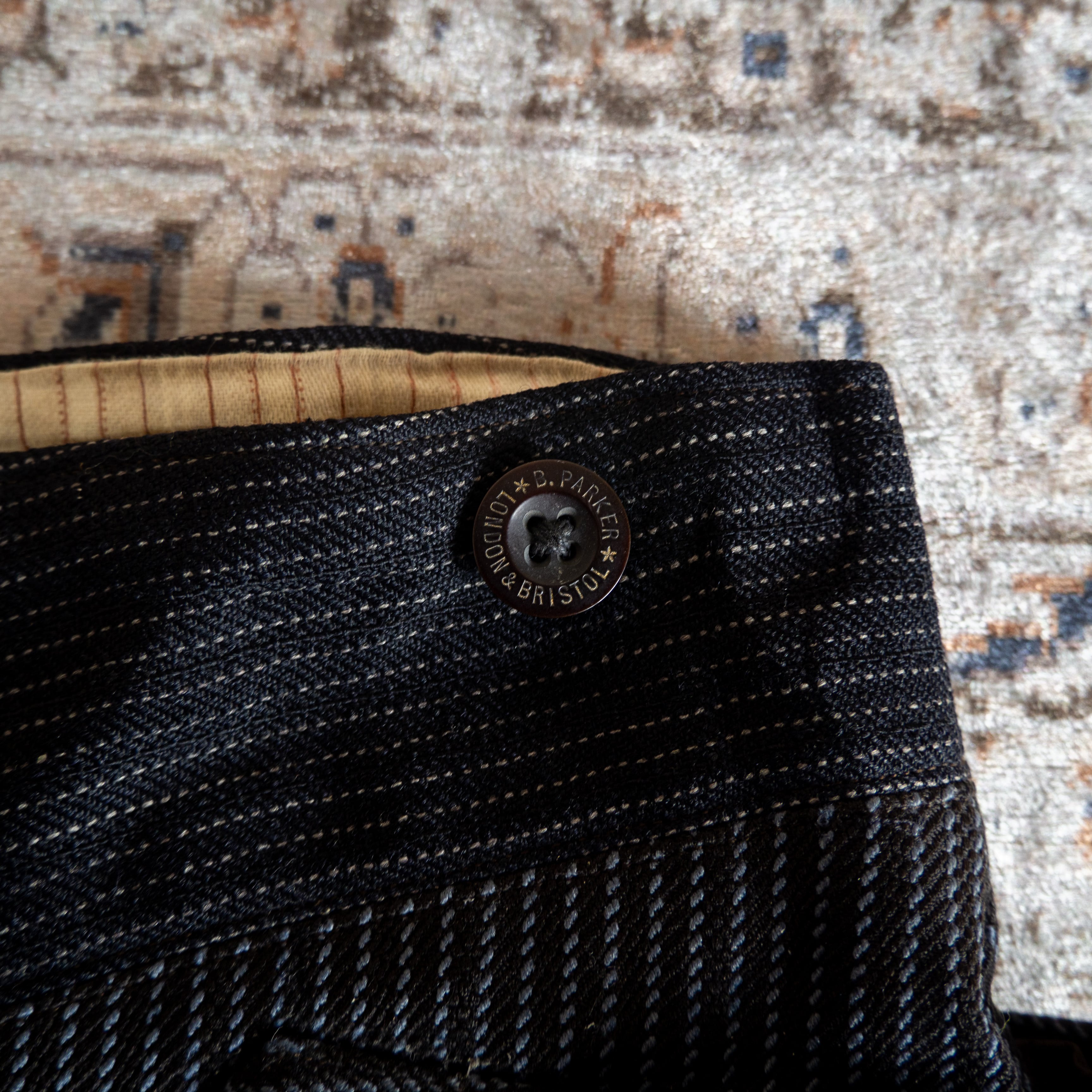 サスペンダーボタンが付属するウエストはボーダーで切り返されるイギリスらしいデザインです。