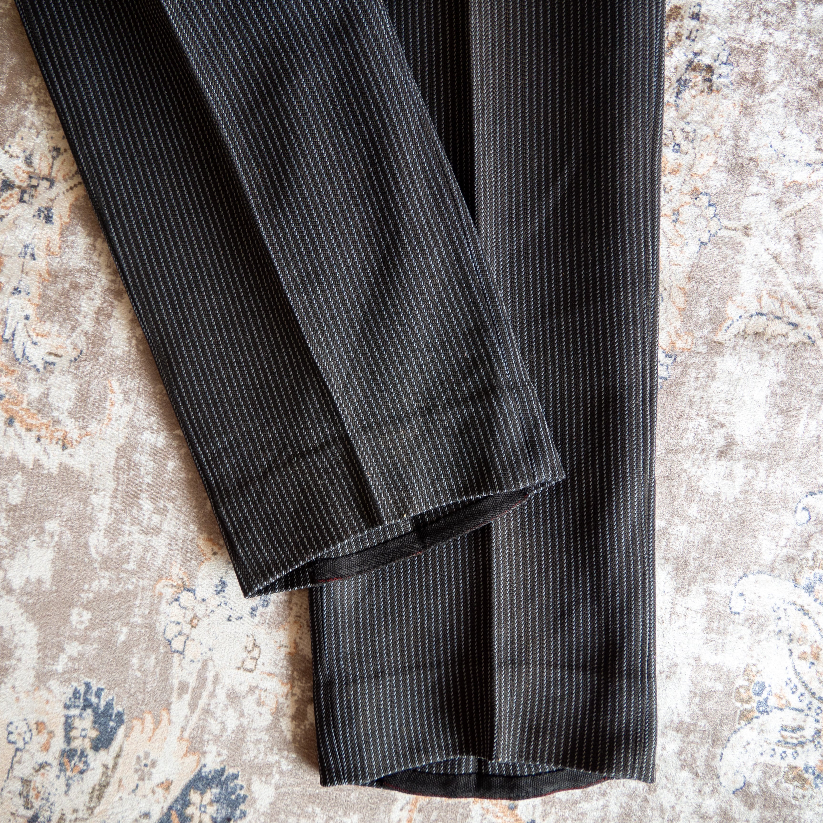 綺麗目な印象を与えるブルーカラーのストライプ模様に左右中央に入ったセンタープリーツも相まり非常にスッキリとした、美しいシルエットラインです。