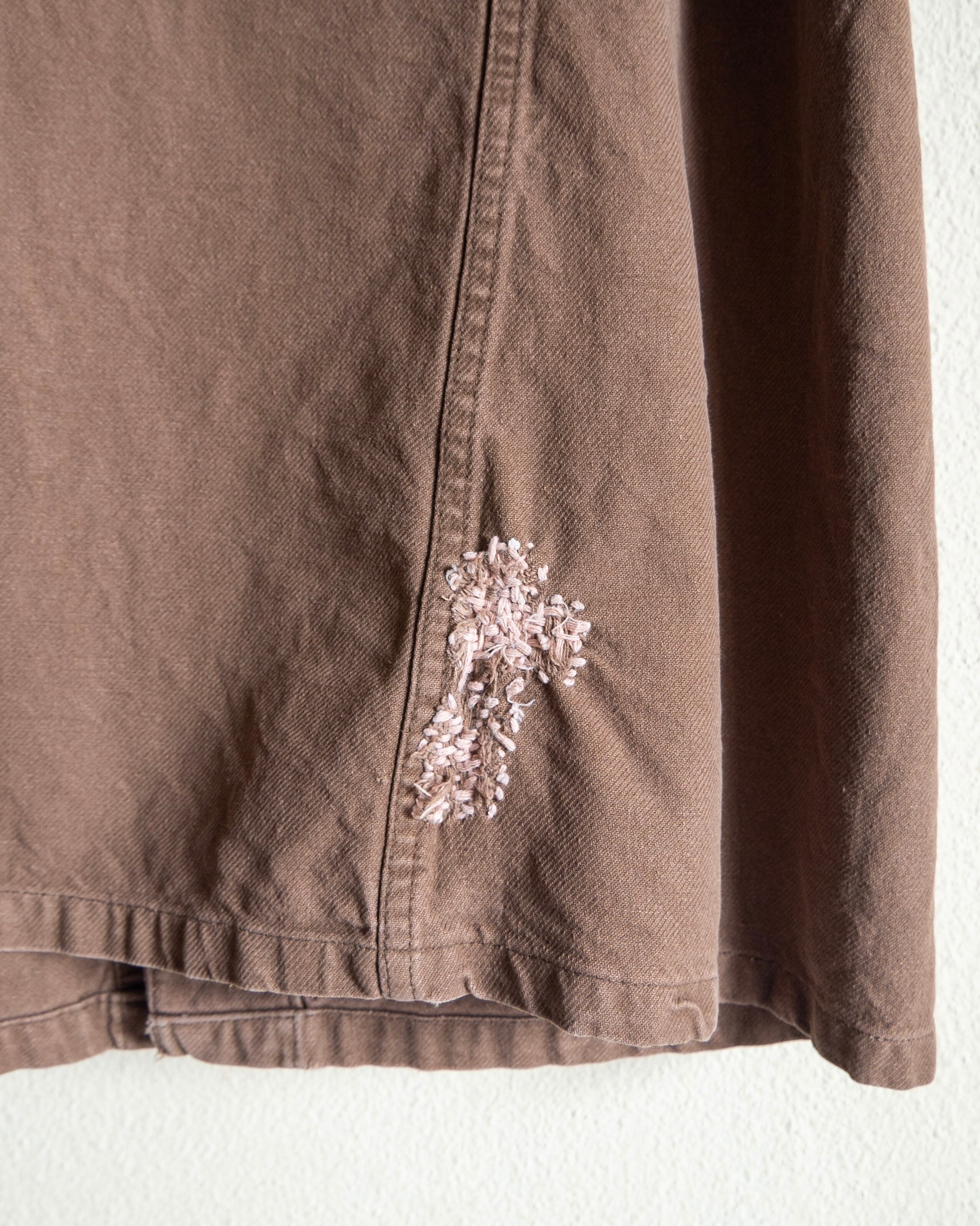 太番手の糸によって織り込まれたドリル生地の経年によって増した柔らかい風合いも素晴らしく、背面裾部分の補修跡も趣とアクセントを加味。