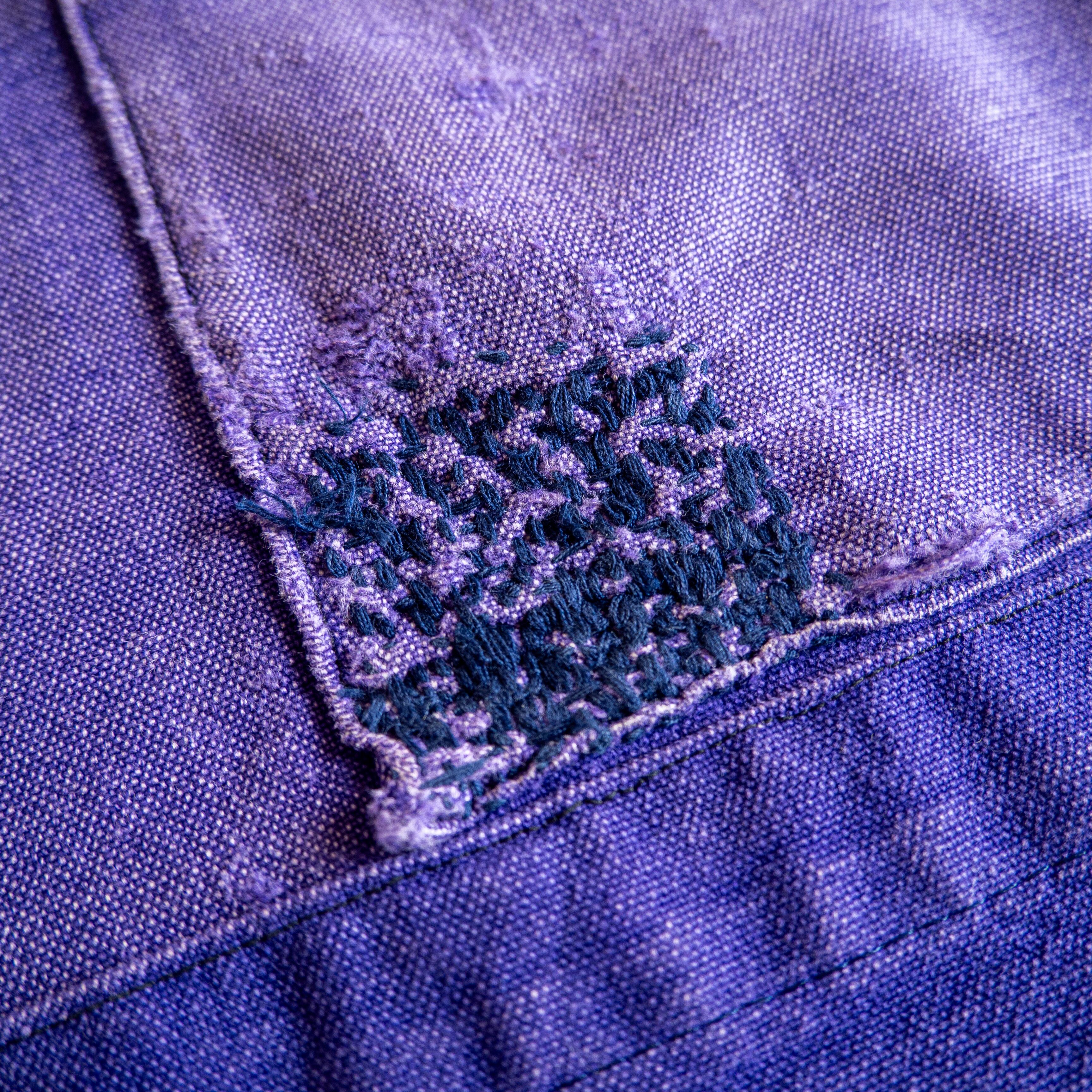 モールスキン生地のカバーオールにも稀にみられるブルーからパープルにフェードしていく経年変化。