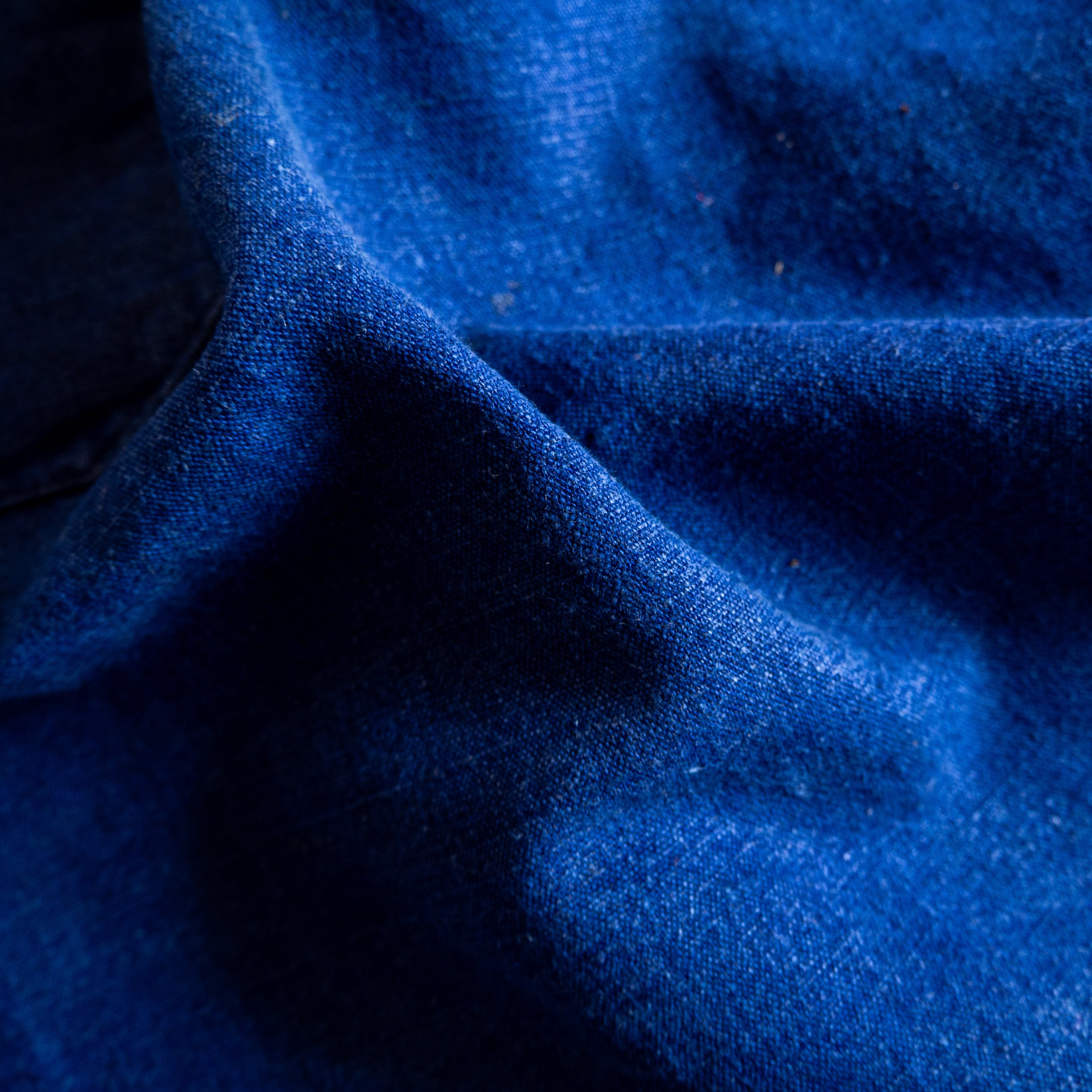 経年の余白が未だ存分に残るヴィヴィッドなインディゴブルーに表面に凹凸のある古めかしくも風合いの良いコットン生地。