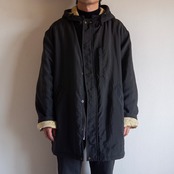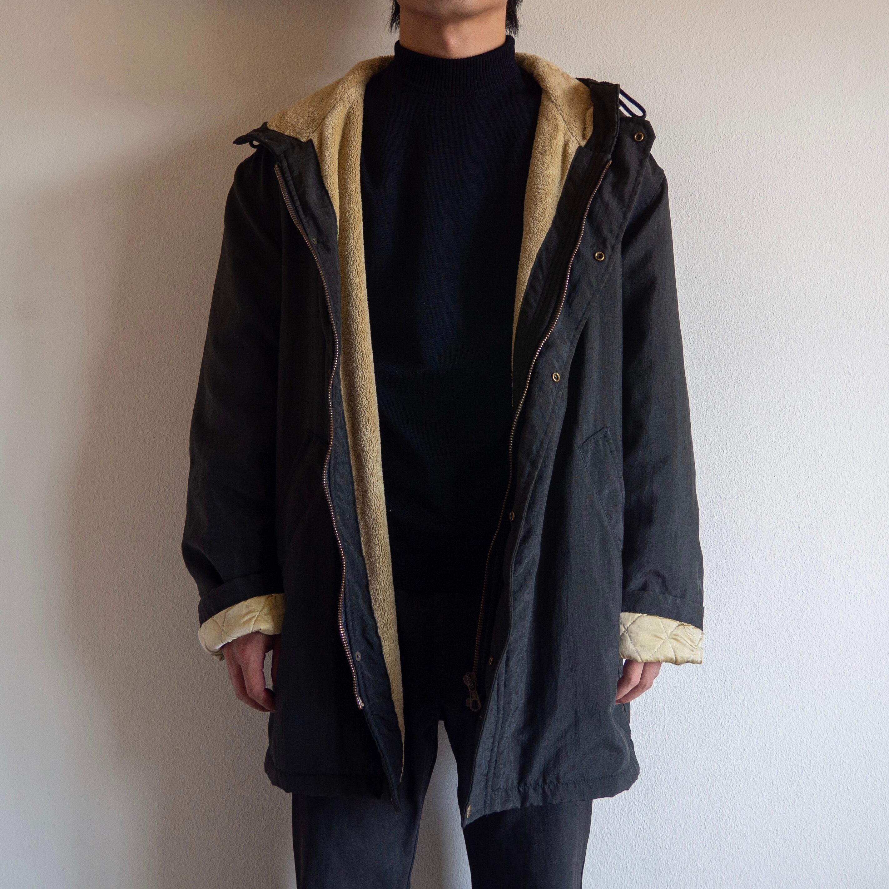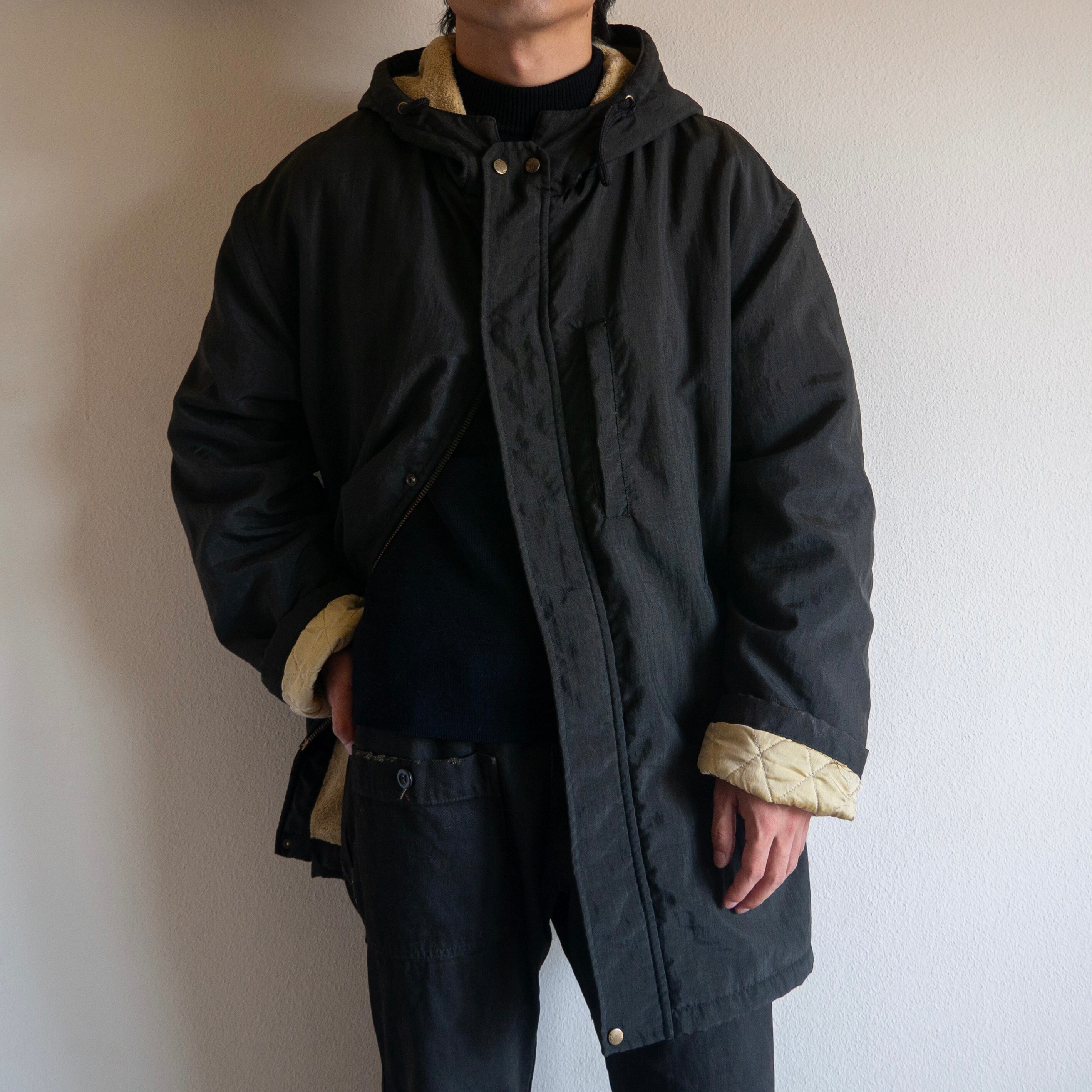 光沢感のあるブラックカラーのナイロンシェルとふわふわと柔らかい素材感のテリークロスファブリックによって構成される1着。
