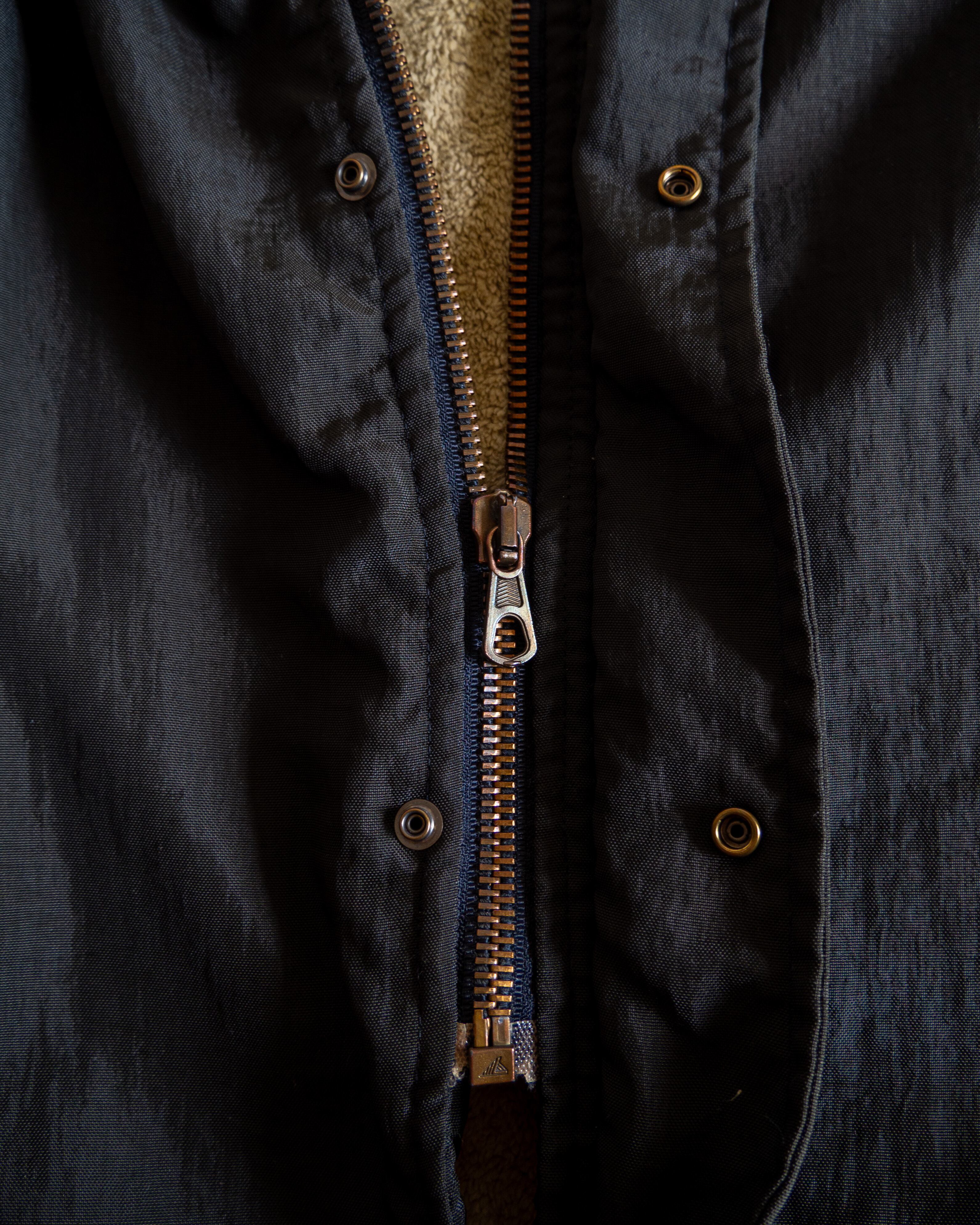 フロントはジッパーとスナップボタンによる二重機構。首元はダブルのスナップボタンによって高めに設定されておりますので遮蔽性においても文句の付けようがございません。